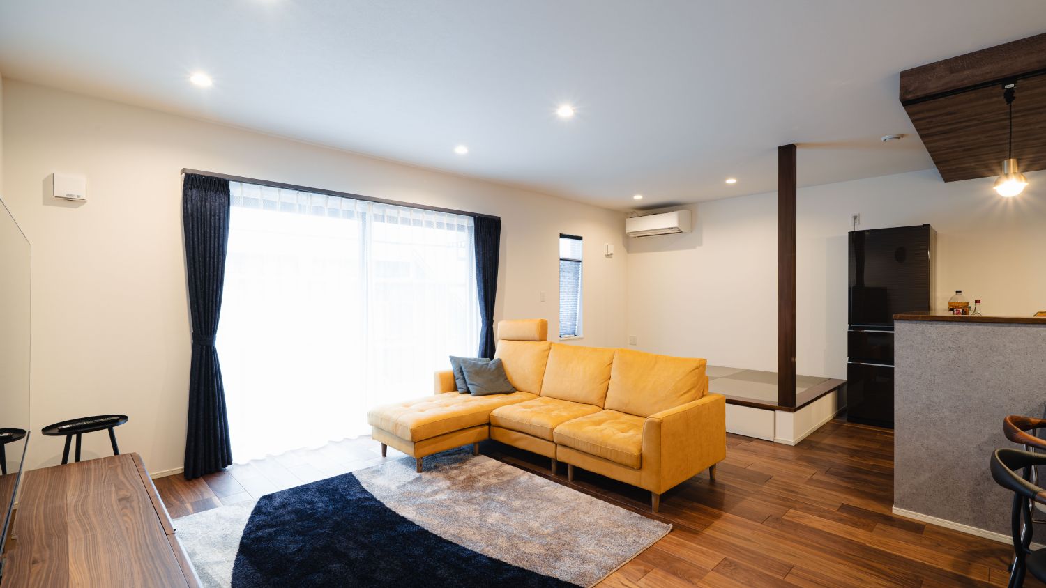 折り上げ天井で広がる空間にブラックが映える家