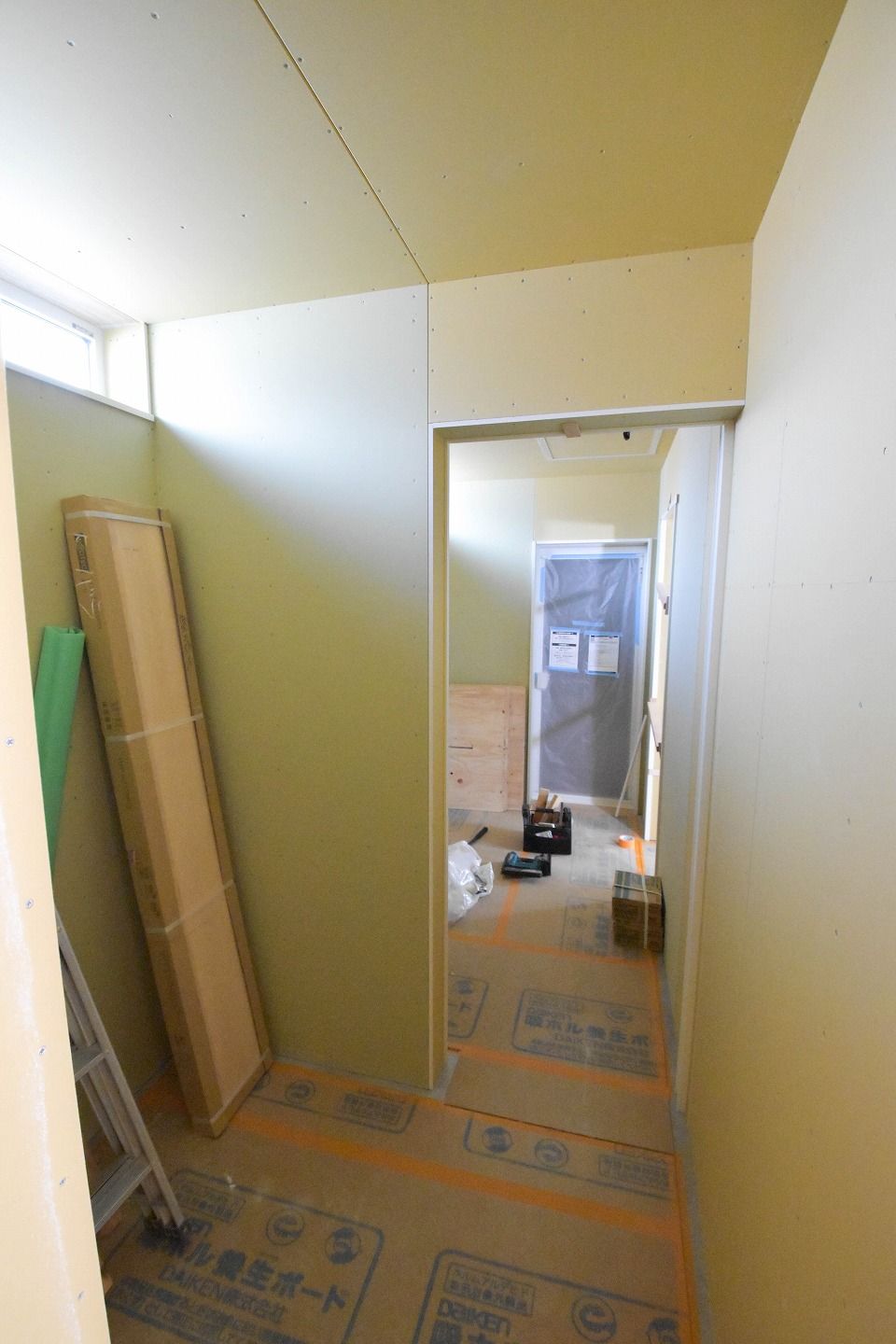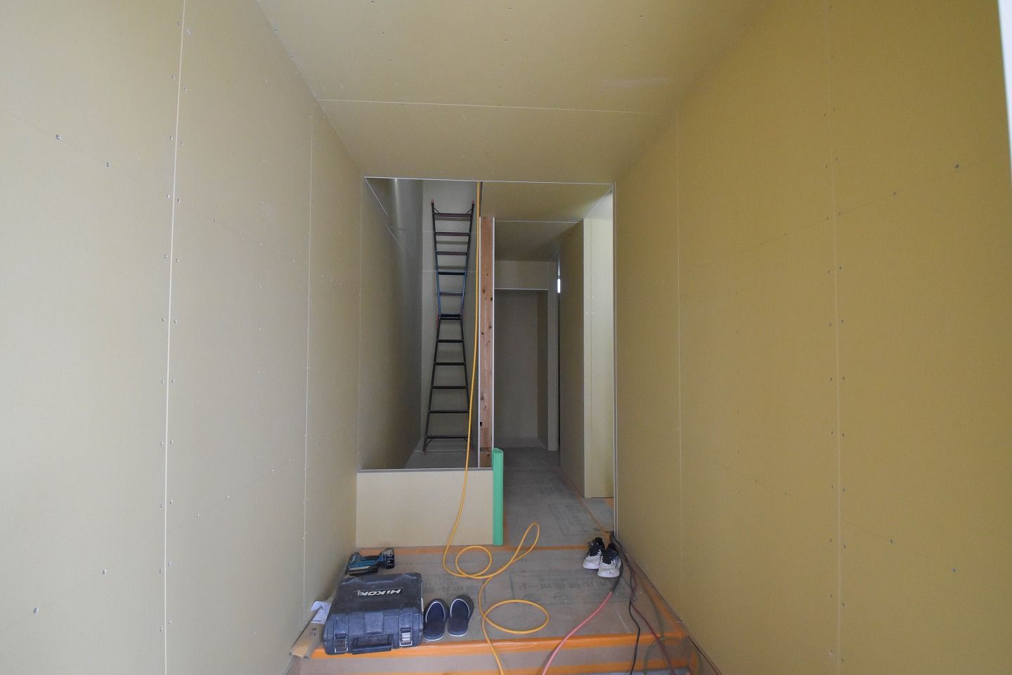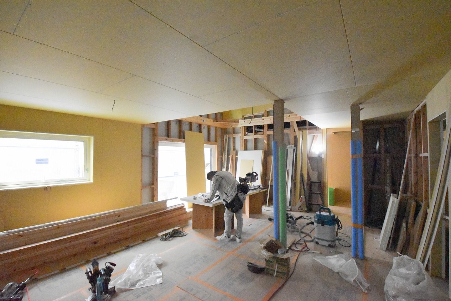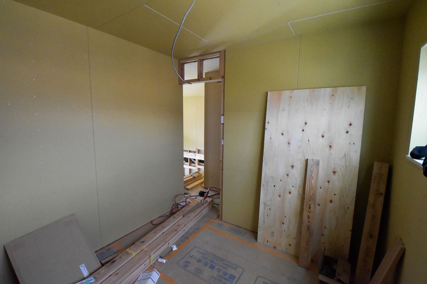 ▼1階部分です。木材がむき出しだった部屋全体は、石膏ボードの施工が進んでいるのがわかります。