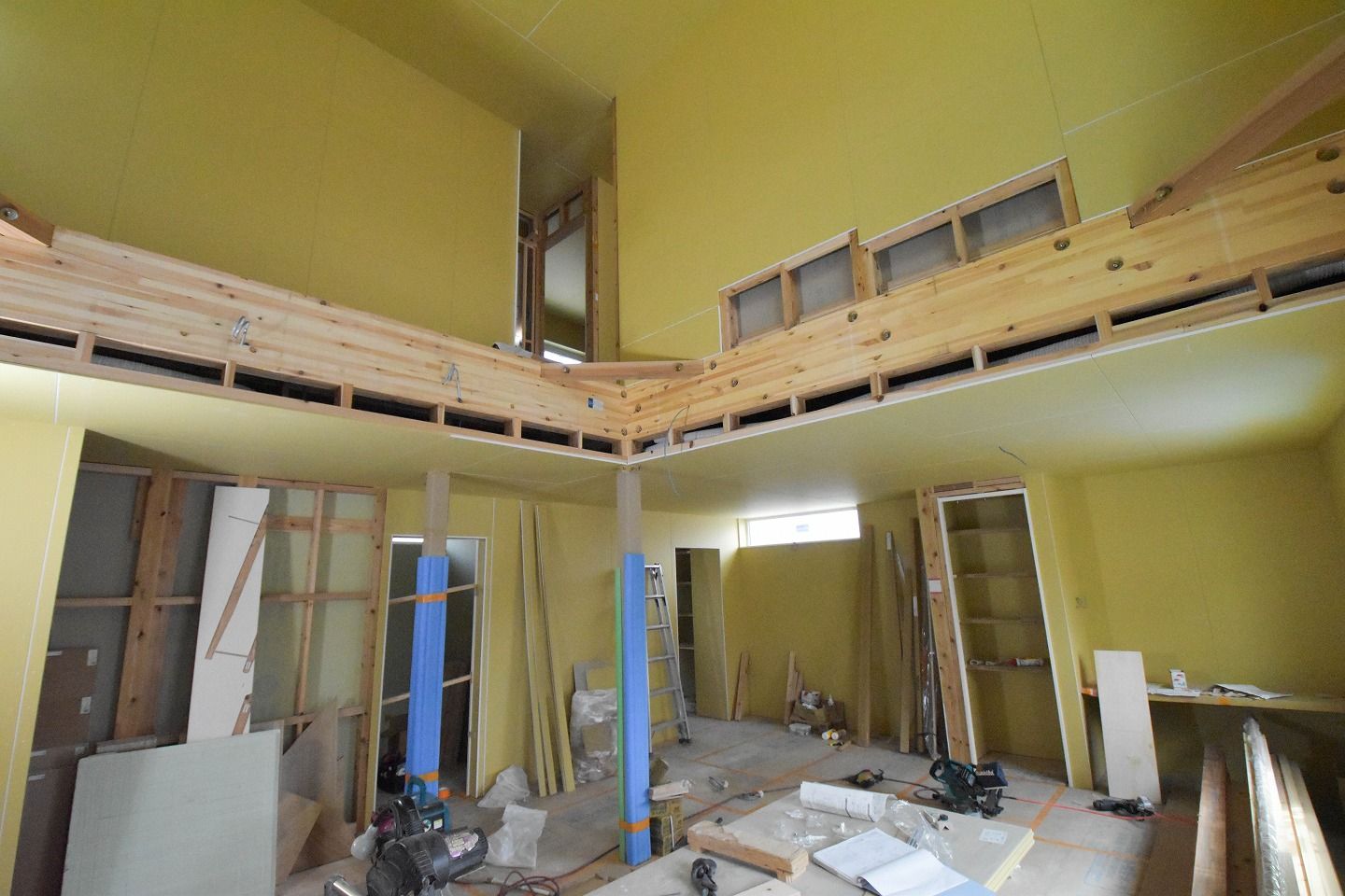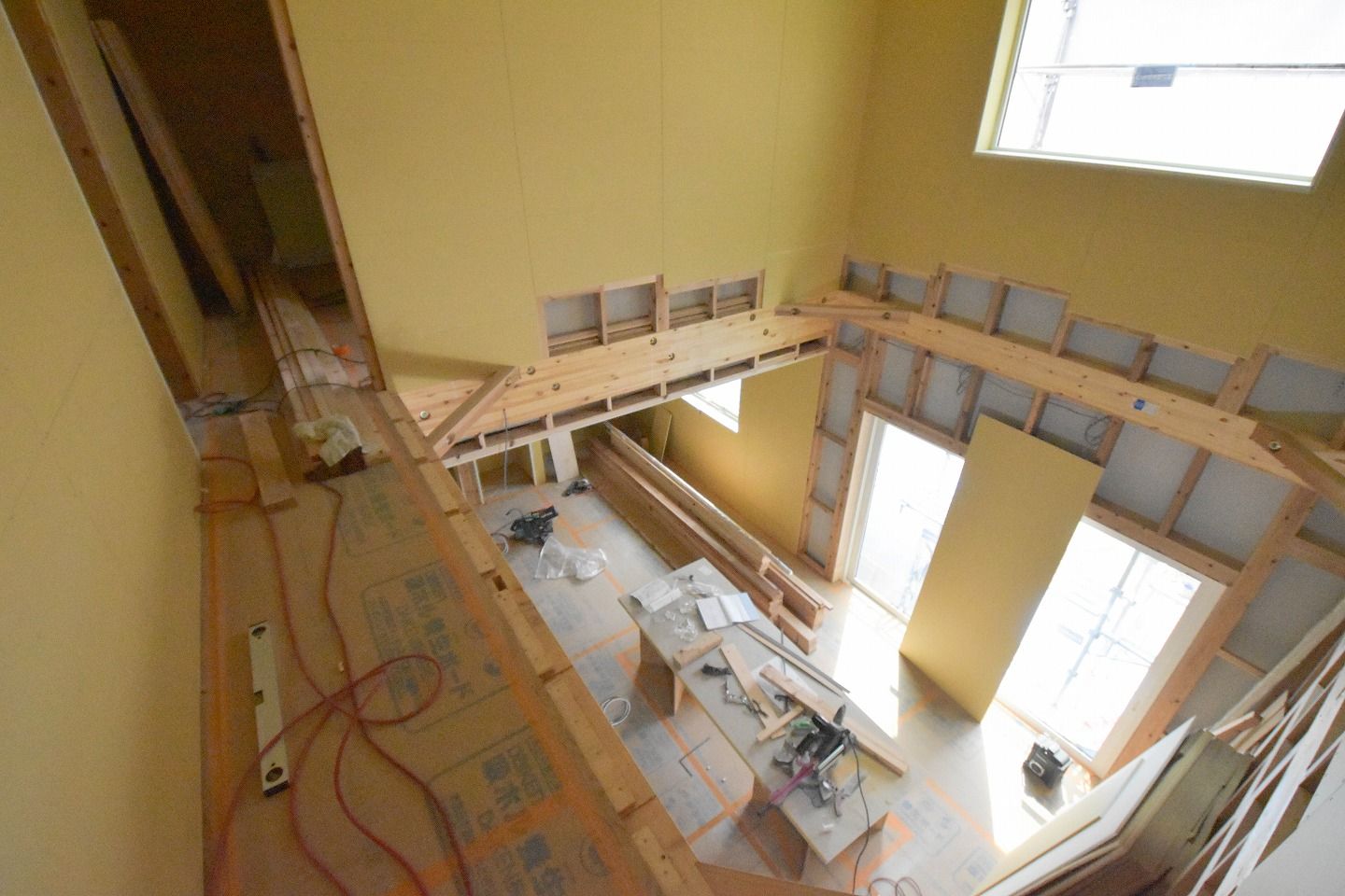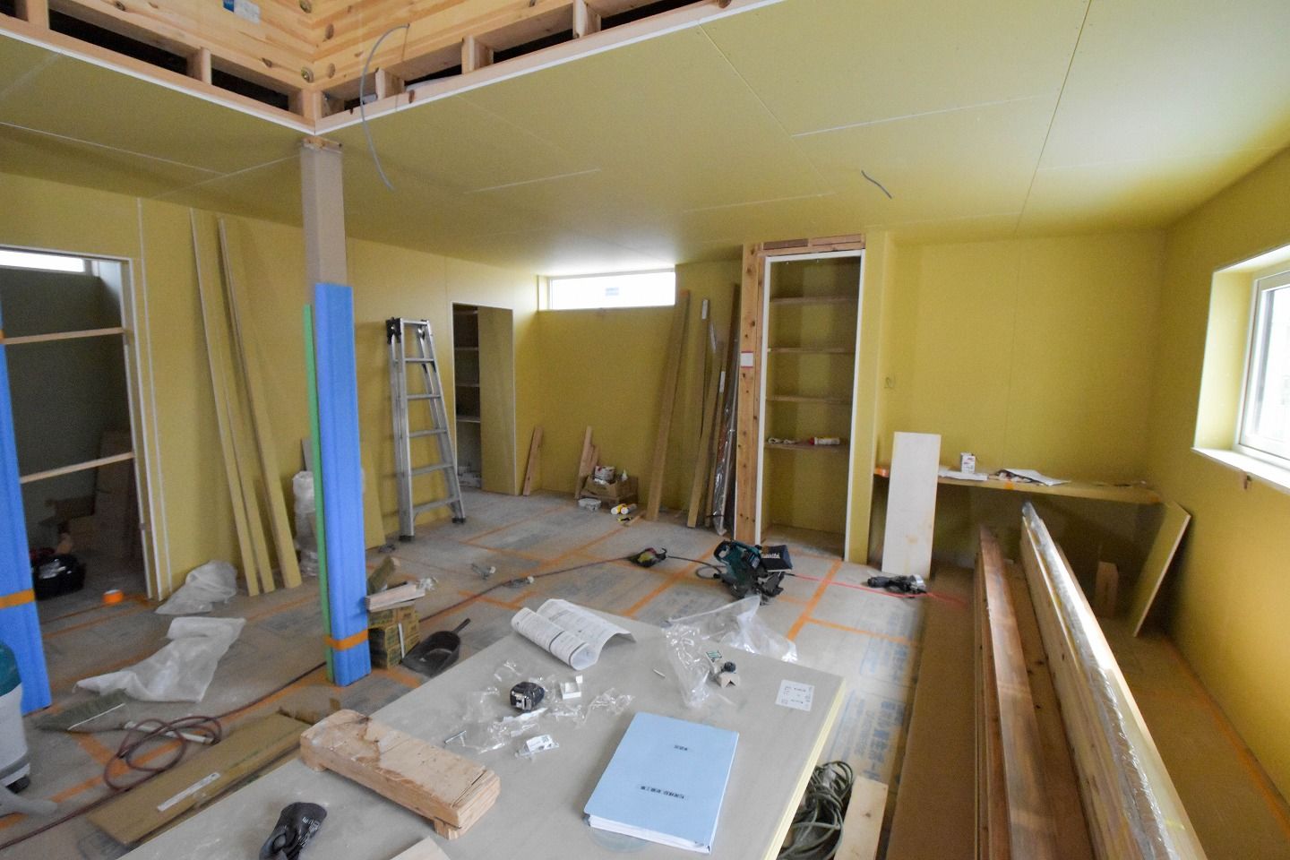 ▼1階部分です。木材がむき出しだった部屋全体は、石膏ボードの施工が進んでいるのがわかります。
