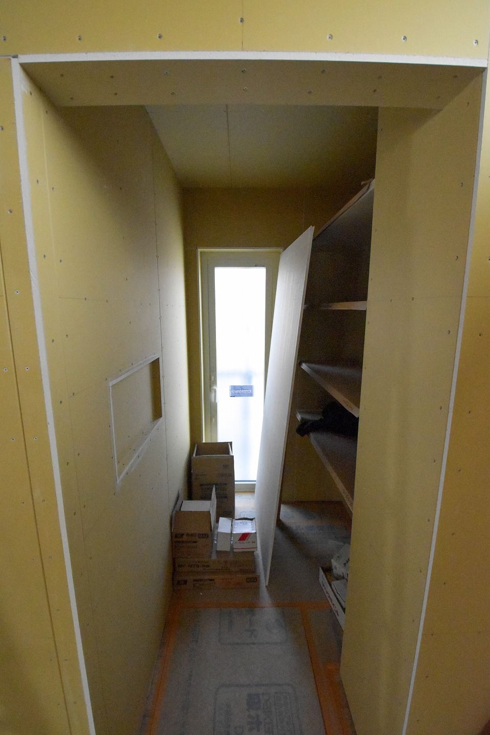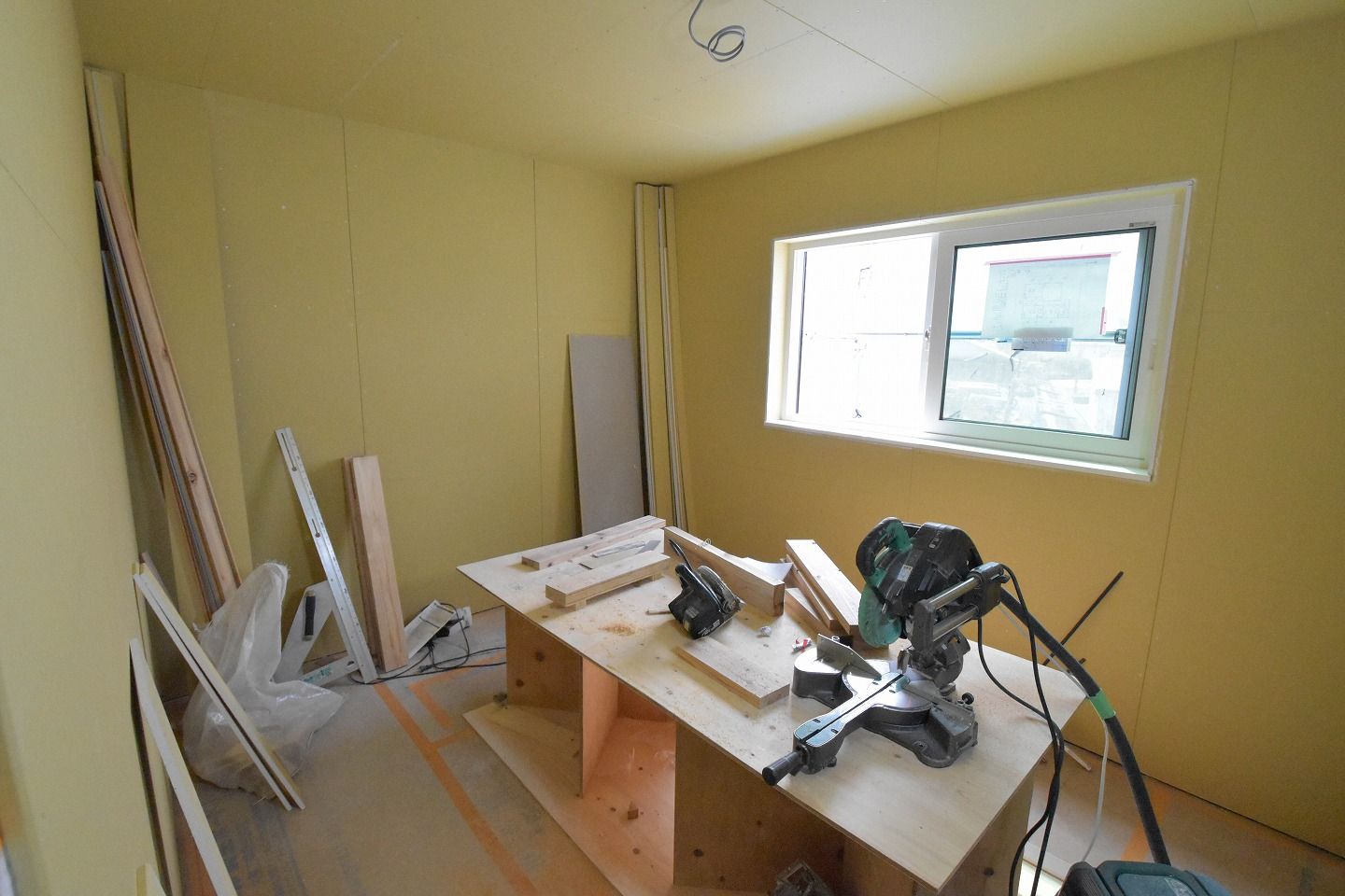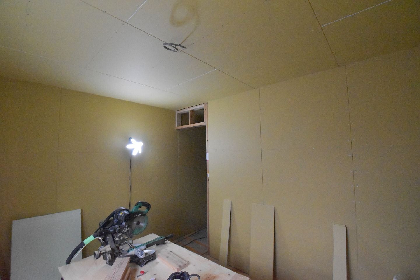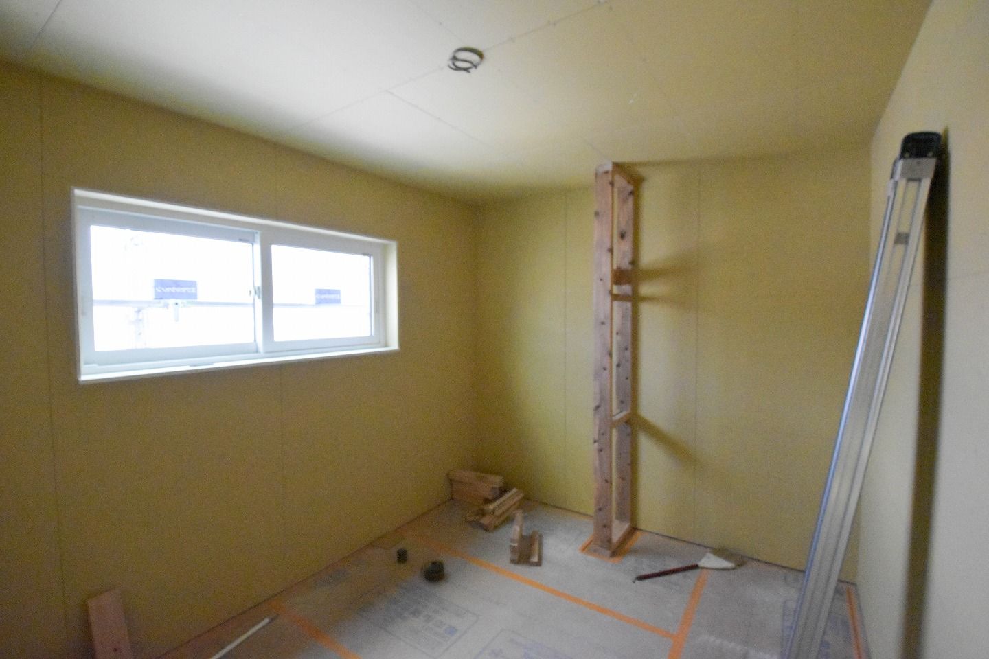 ▼1階部分です。木材がむき出しだった部屋全体は、石膏ボードの施工が進んでいるのがわかります。