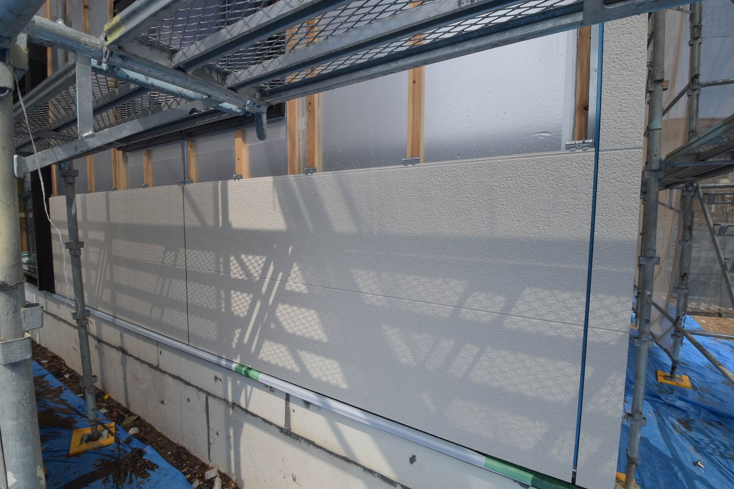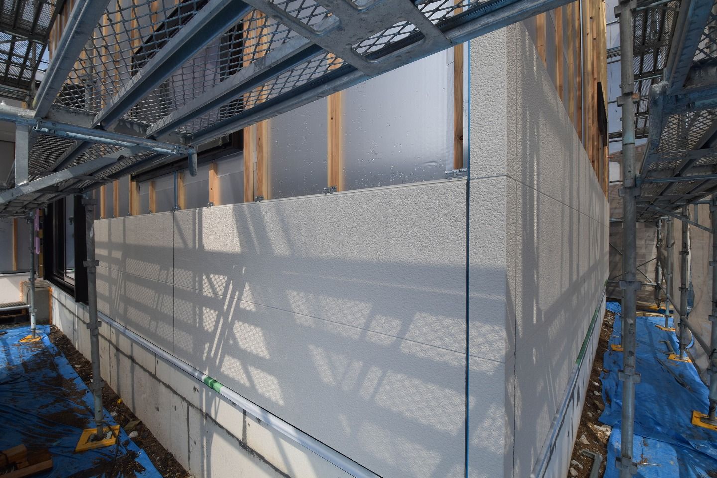外断熱材キューワンボードの上に通気胴縁、そしてその上にサイディング材の取り付けが始まっています。