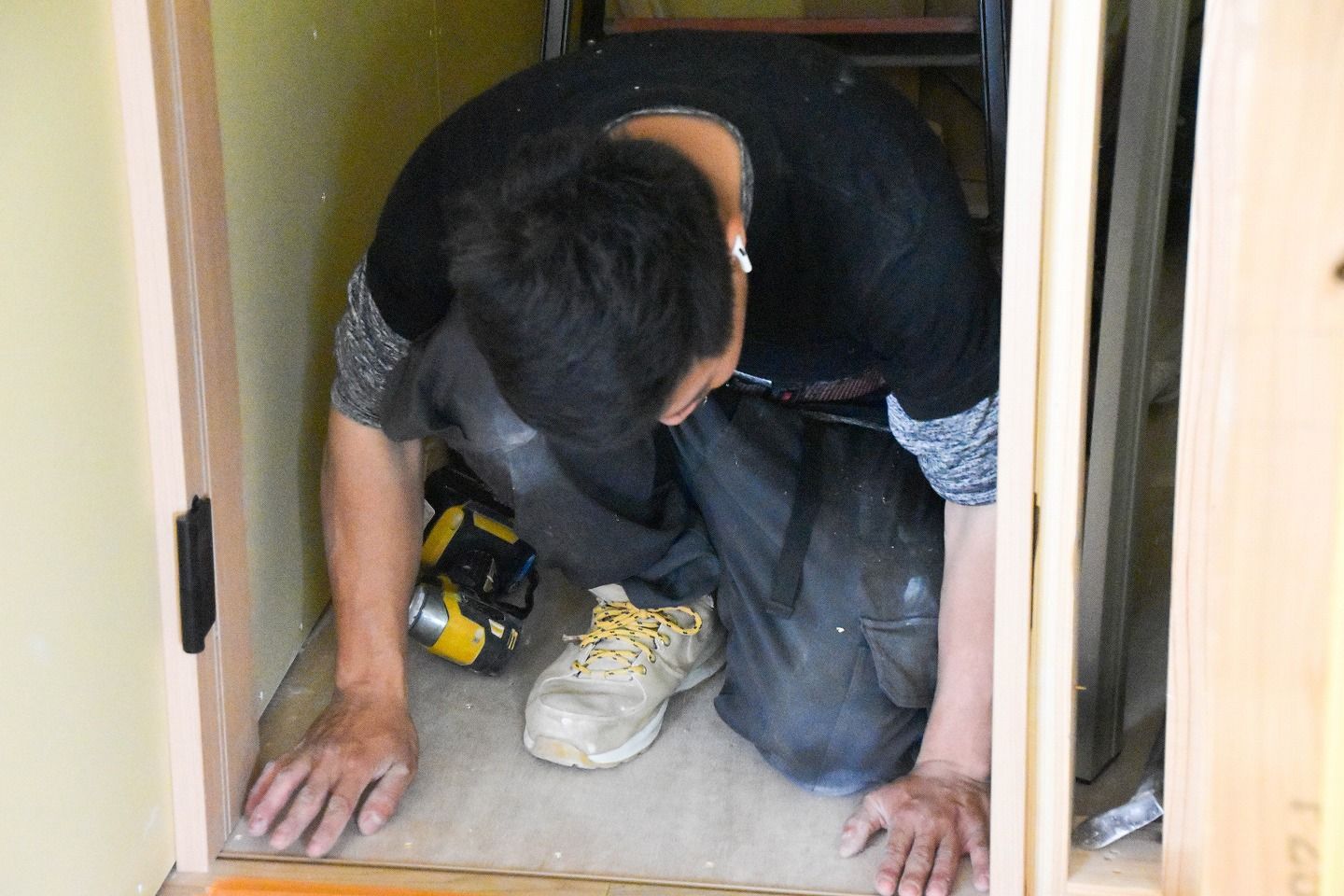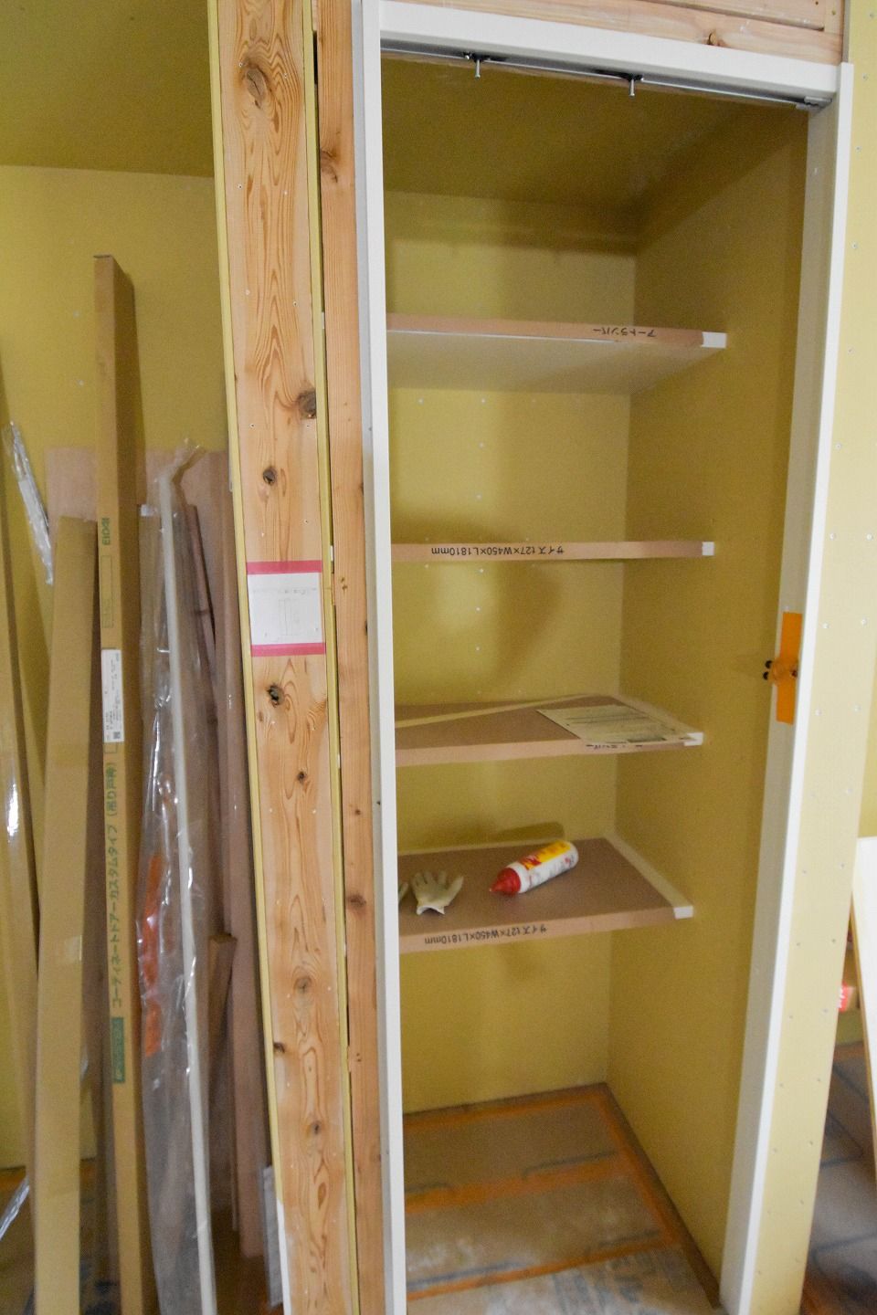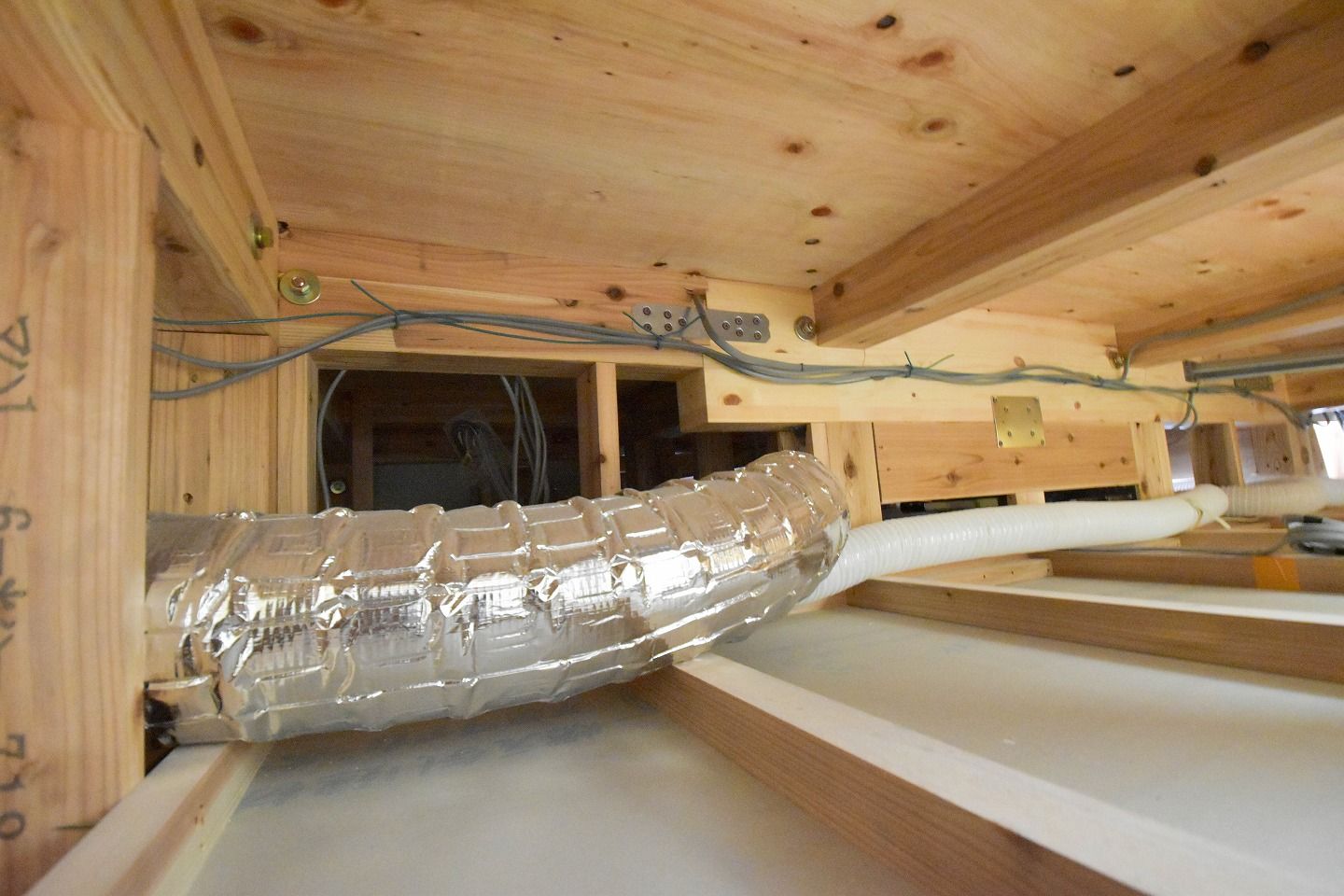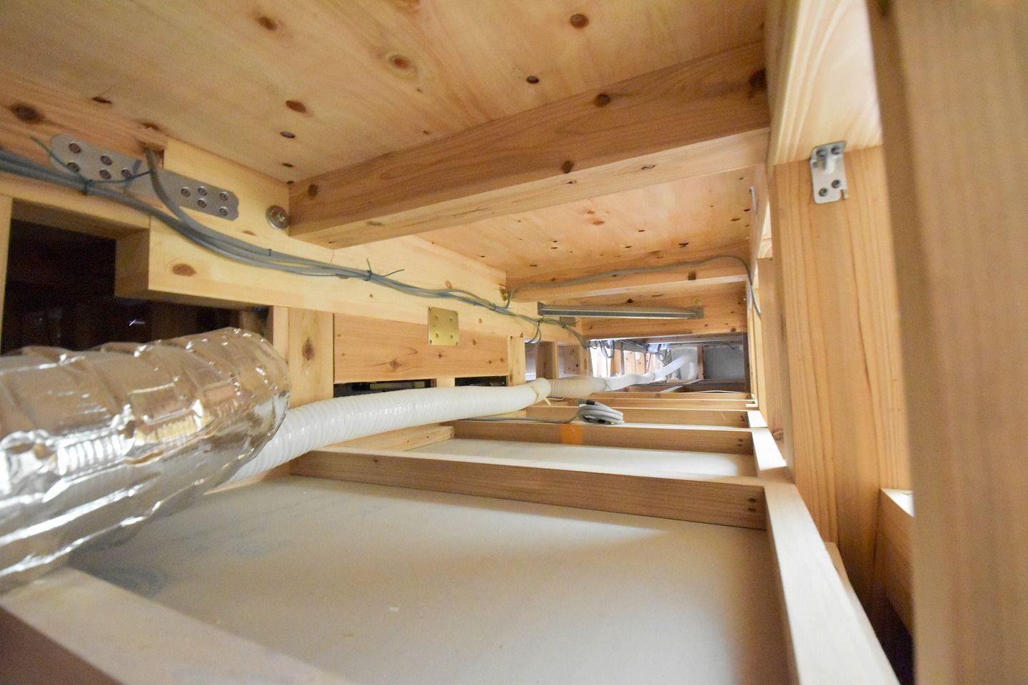 ▼一階と二階の間には換気用のホースが伸びています。完成後はふさがれるため貴重な光景です!