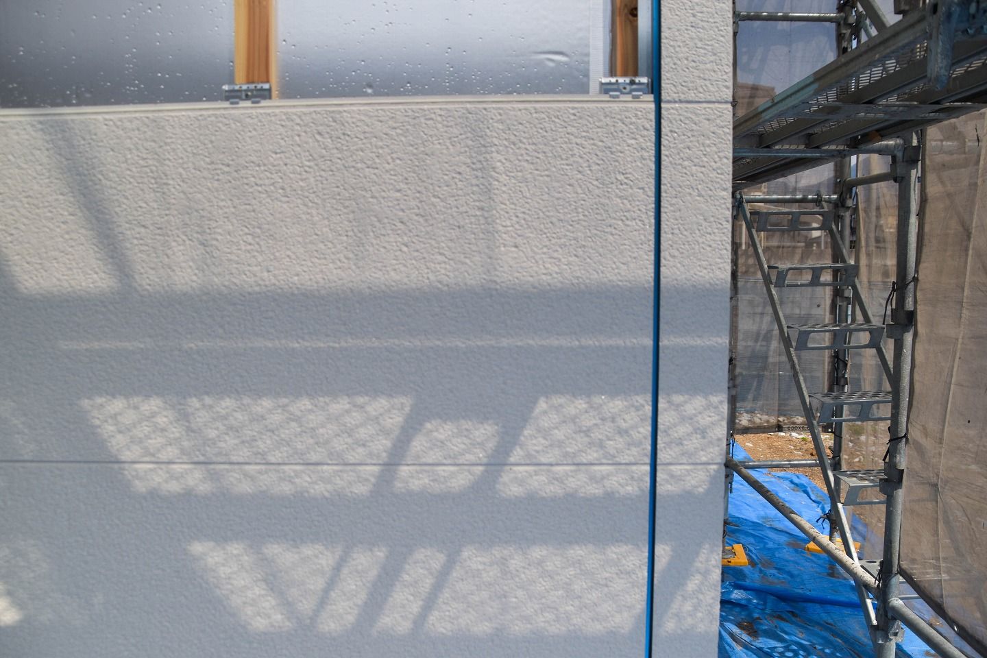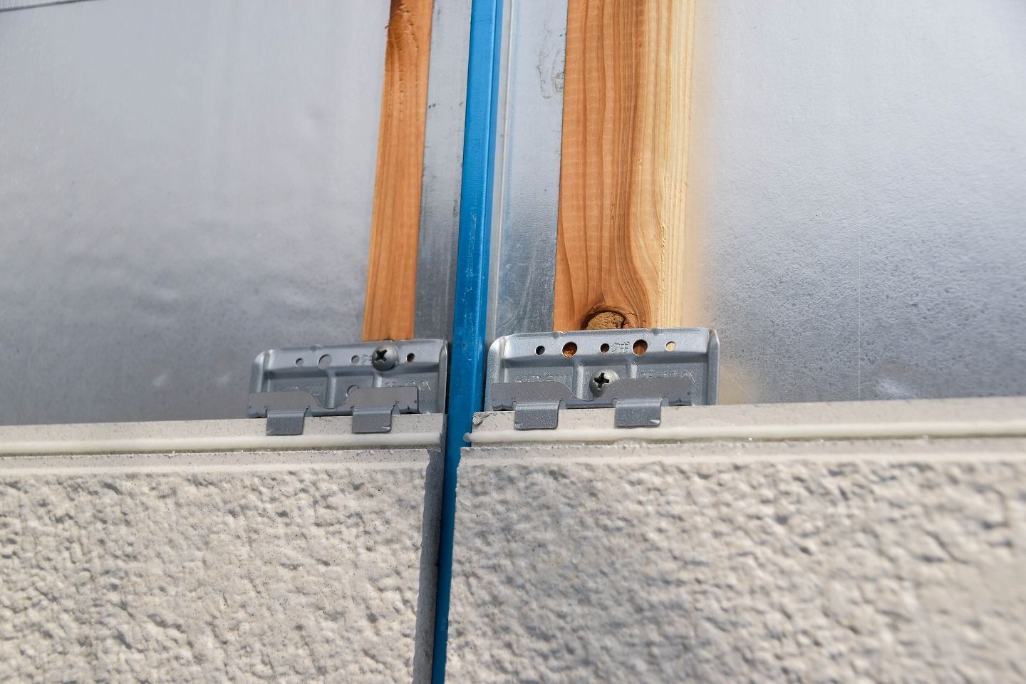 ▼ハット型ジョイナー(青の部分)には、サイディング材取り付け完了後にコーキング材の施工が施されます。