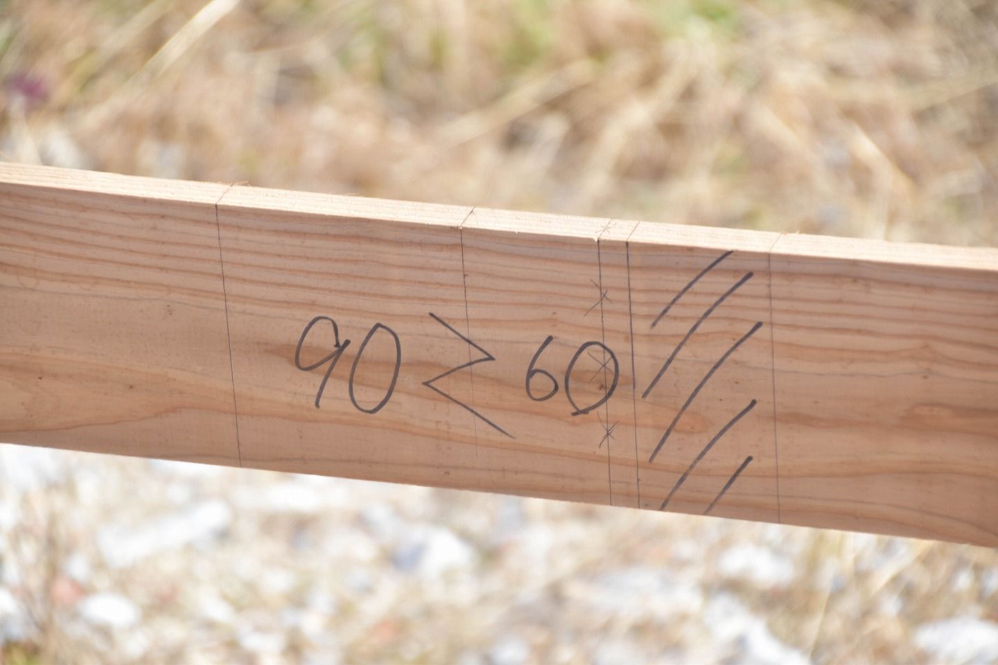 ▼こちら書かれている印は、斜線には50㎜の基礎断熱材、150㎜の基礎コンクリートの厚みという印です。90㎜と60㎜の間が基礎の芯になるという印になっています。