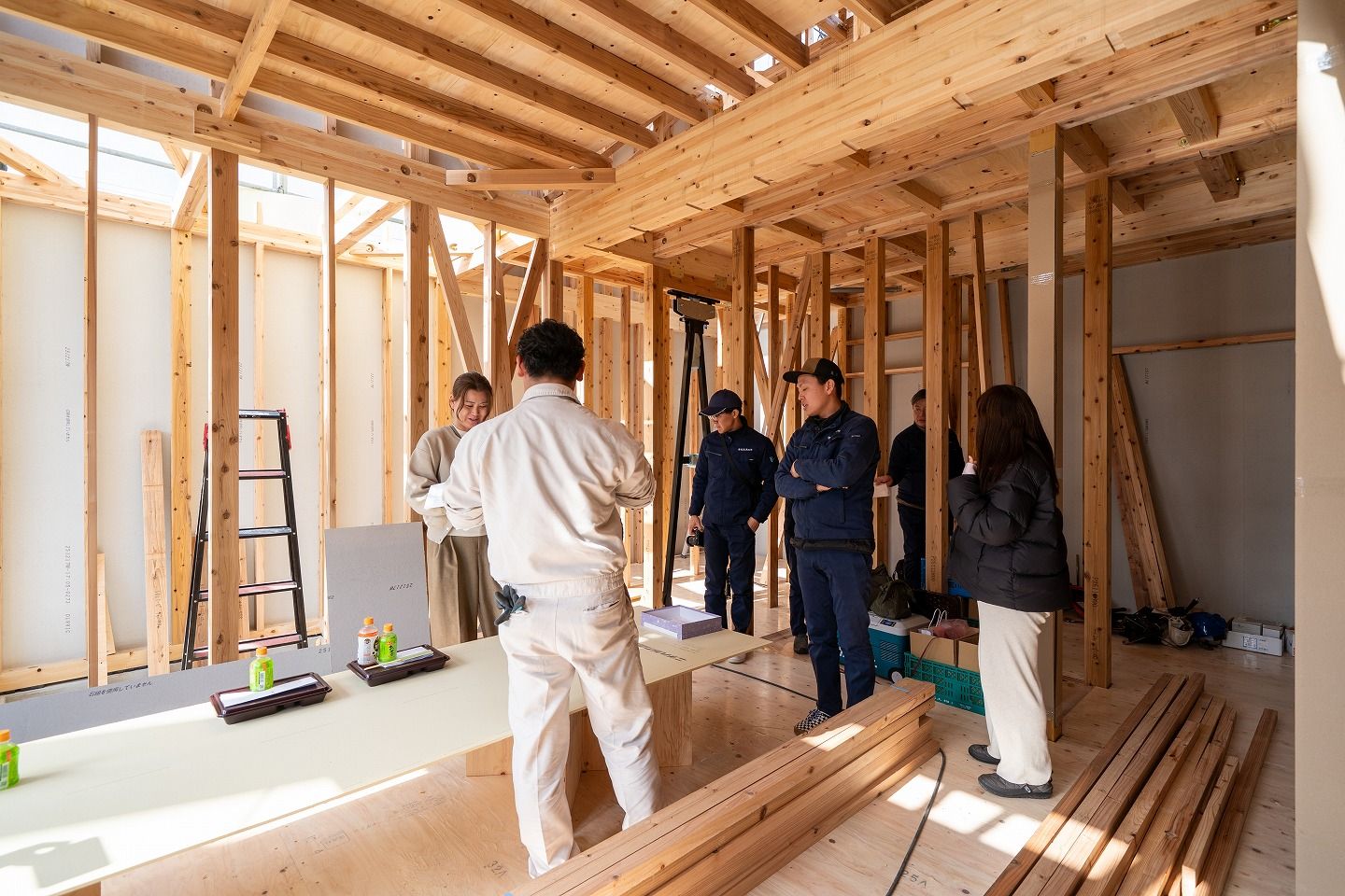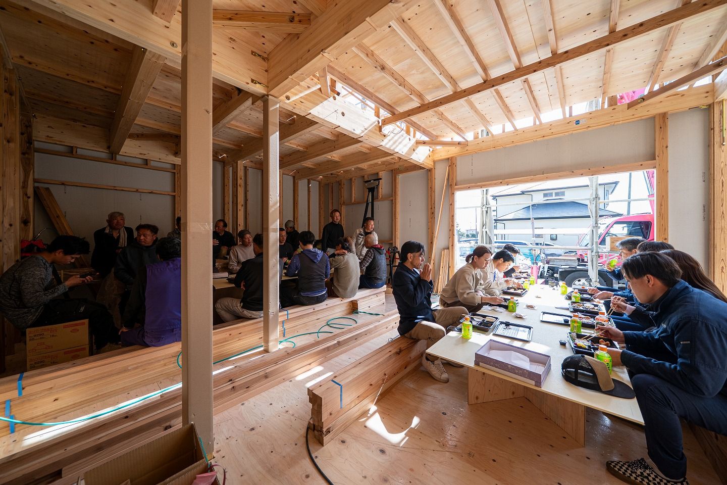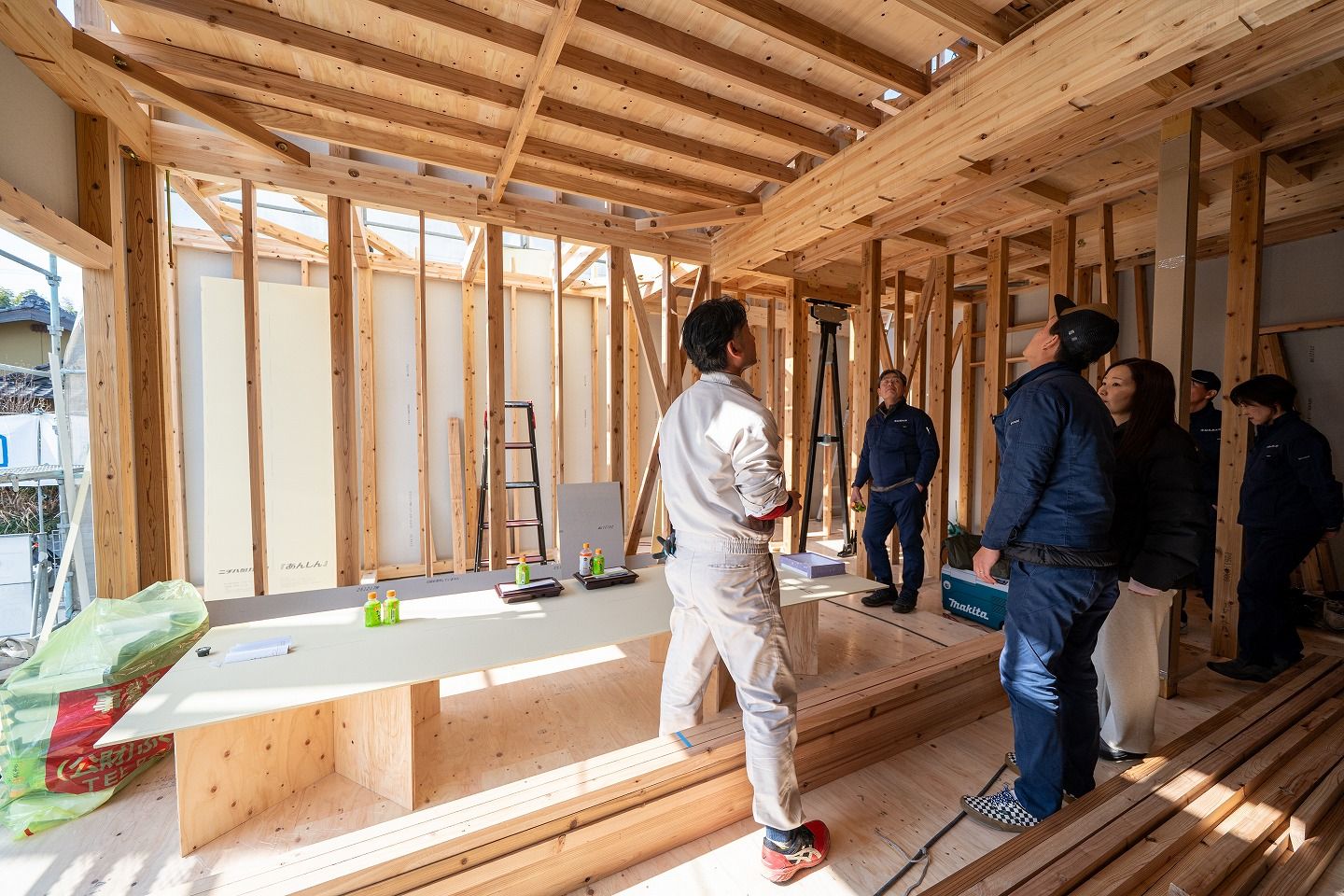 トップページ > 建築現場 > 福智町01 > 「田川郡福智町01」注文住宅現場リポート④【上棟式】 「田川郡福智町01」注文住宅現場リポート④【上棟式】 2026.02.09掲載 こんにちは!リポート担当の有村です。2月5日(木)晴れ。本日は田川郡福智町にて上棟式を執り行いました!それではさっそくリポートしていきましょう!▼お昼の様子です。施工が着々と進んでいます!▼おいしいお弁当を頂き、みんな元気をチャージできました!▼昼食後、図面を見ながら現場案内をさせていただきました!実際に現場を見て回ることでイメージがしやすくなりますね!▼この度の上棟式、誠におめでとうございます。これから本格的に始まる家づくり、ぜひ楽しまれてください!▼本日のおまけご主人様の弟様がポーズをとってくれました! もっと福岡工務店を知りたい方 関連記事を見る 2026.01.26 「田川郡福智町01」注文住宅現場リポート③【基礎工事】【給排水】 2025.12.26 「田川郡福智町01」注文住宅現場リポート②【基礎工事】【遣り方】 2025.12.01 「田川郡福智町01」注文住宅現場リポート①【地鎮祭】