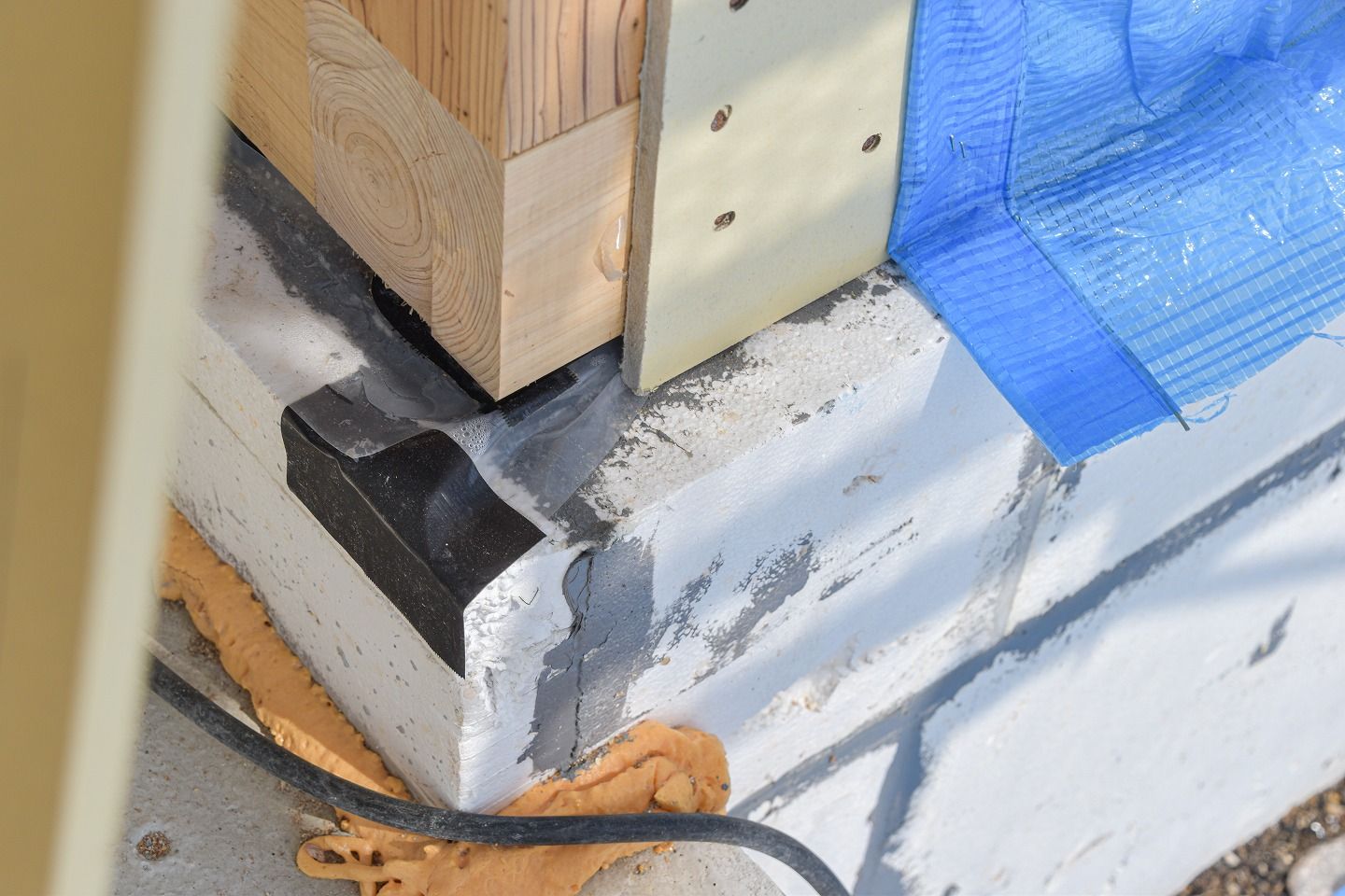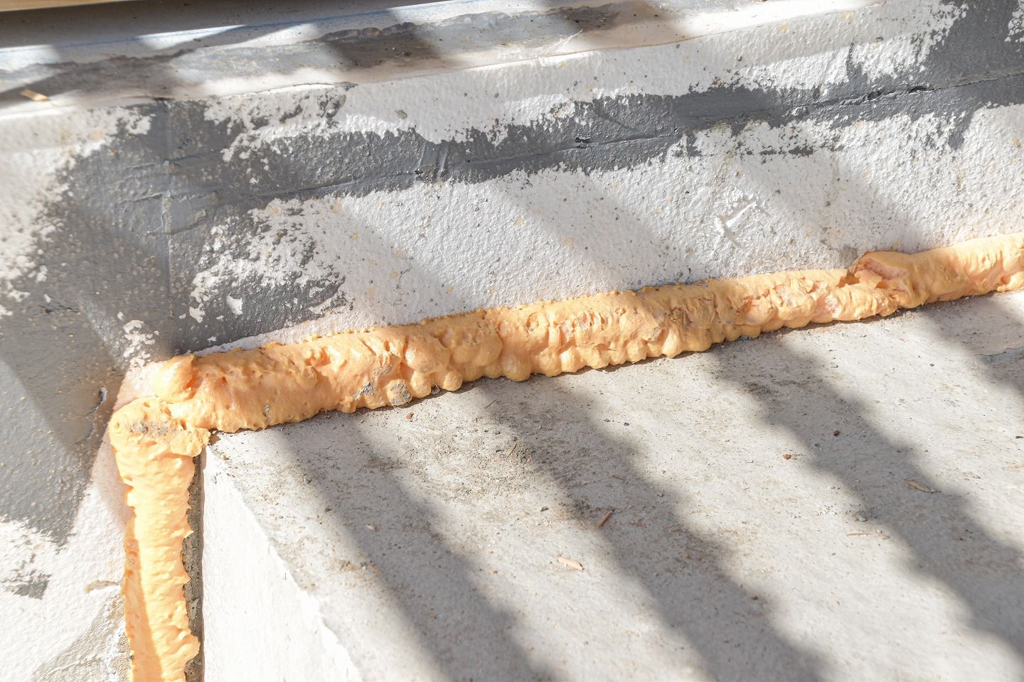 ▼このオレンジのもこもこしたものは、断熱とシロアリの防蟻効果もあるウレタン。細かな隙間もしっかり処理していきます。