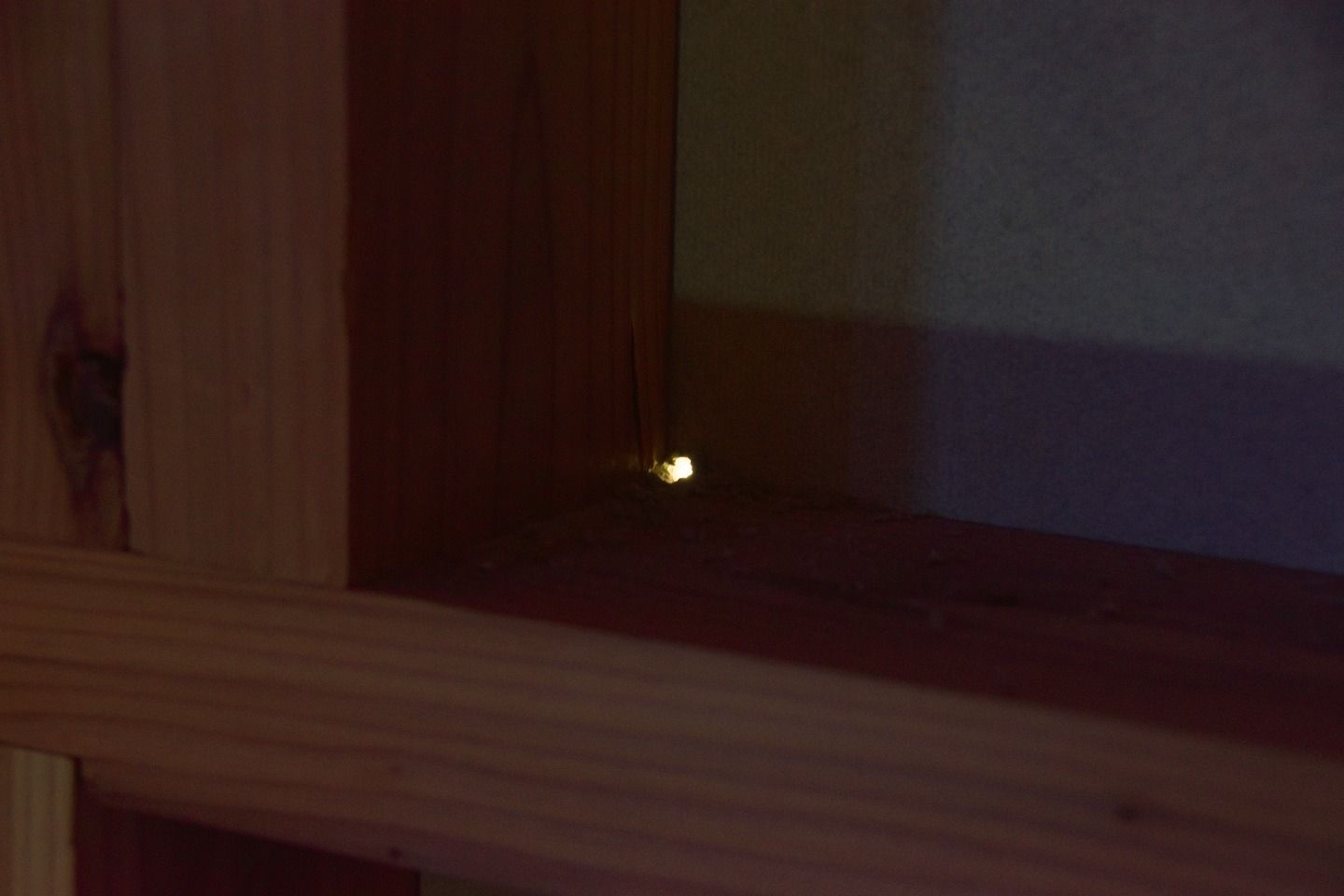 ▼枠の内側の四隅に小さな穴があるのが見えるでしょうか?窓枠を作る際は、部屋内部から四隅に目印となる穴をあけ、外から切っていくそう。