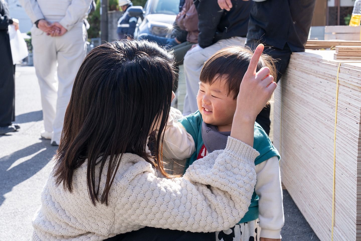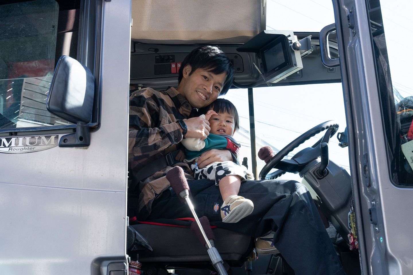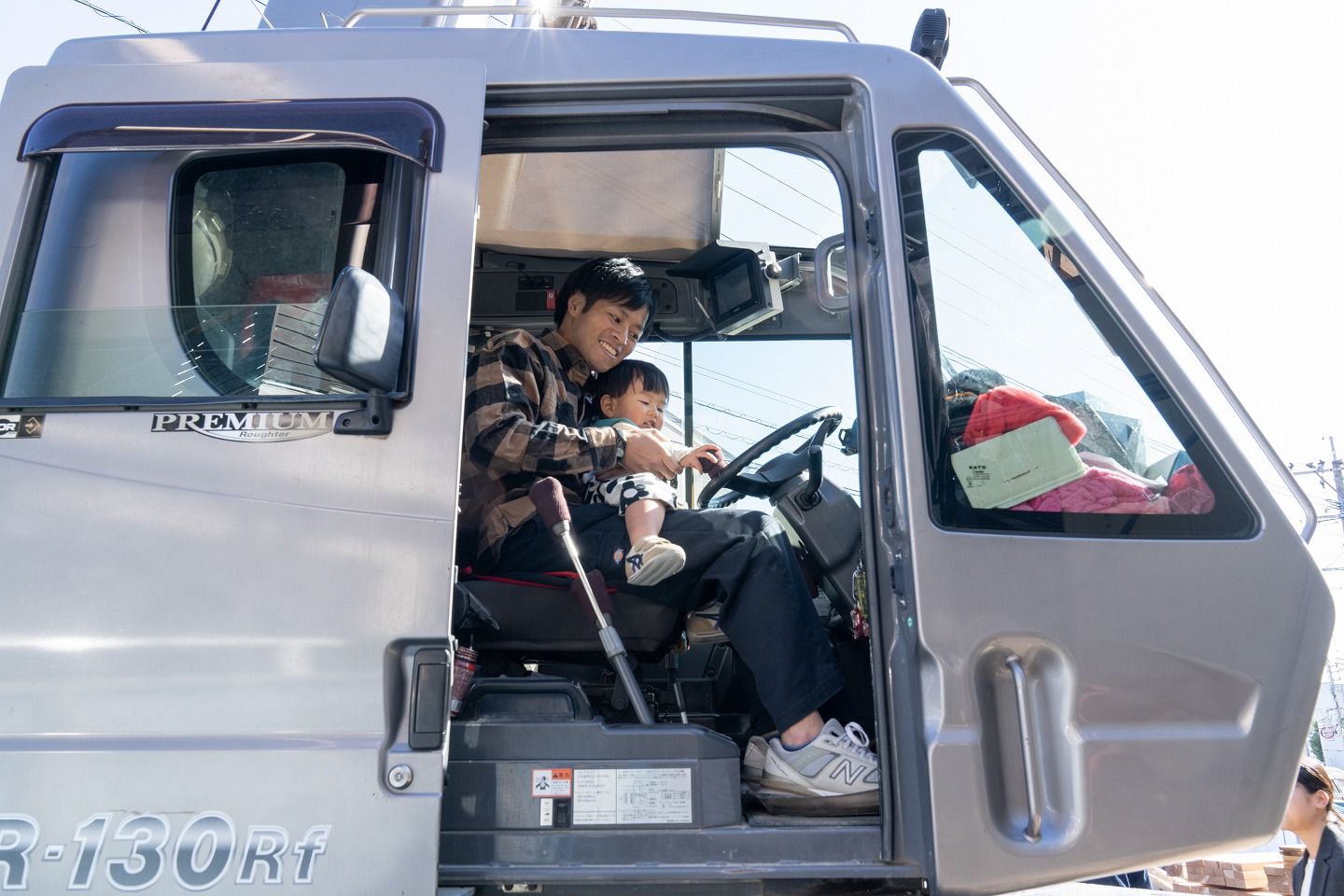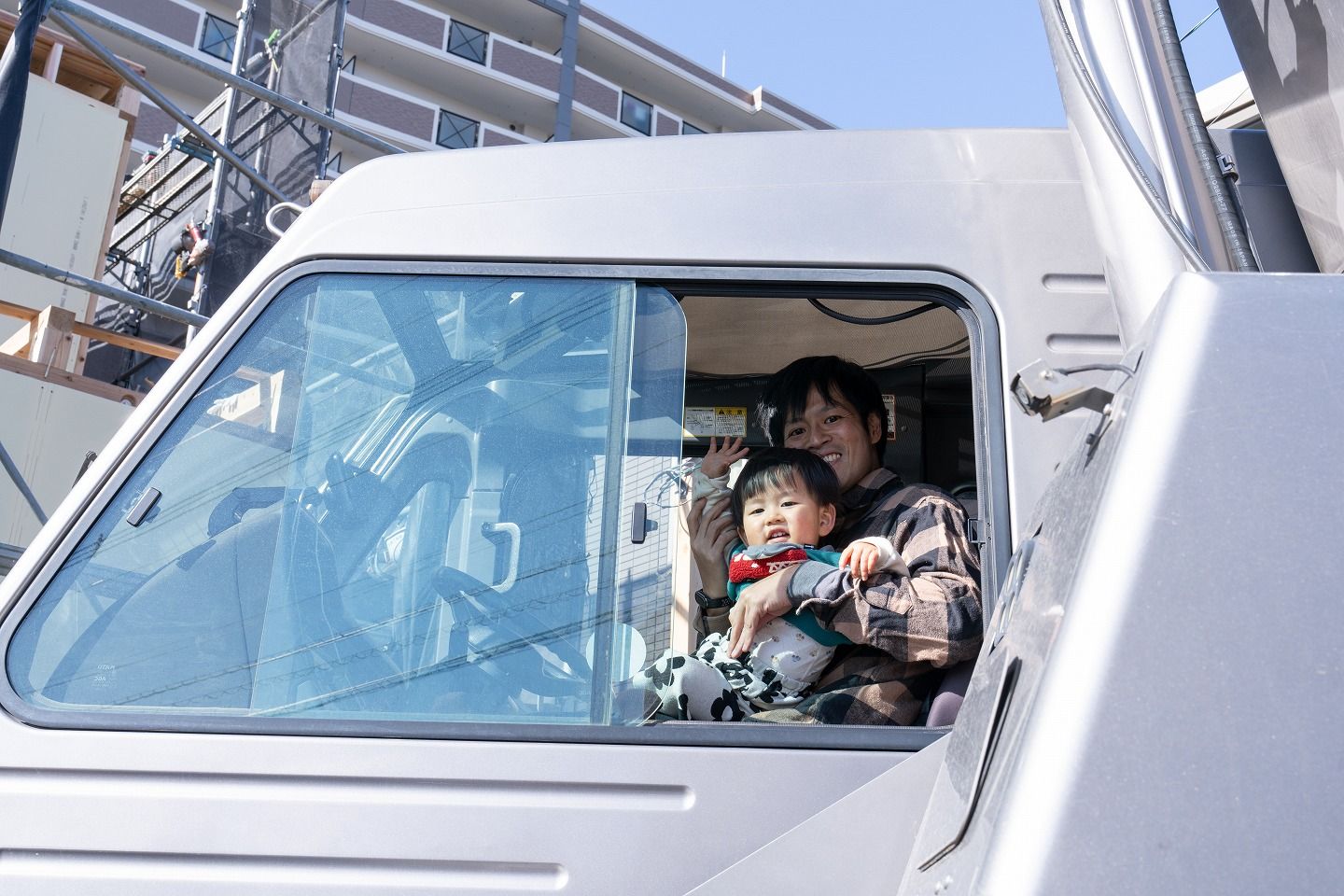 クレーンの運転手さんが、お父さんとお子様を運転席にご招待!働く車が大好きなお子様。とっても嬉しそうでした!