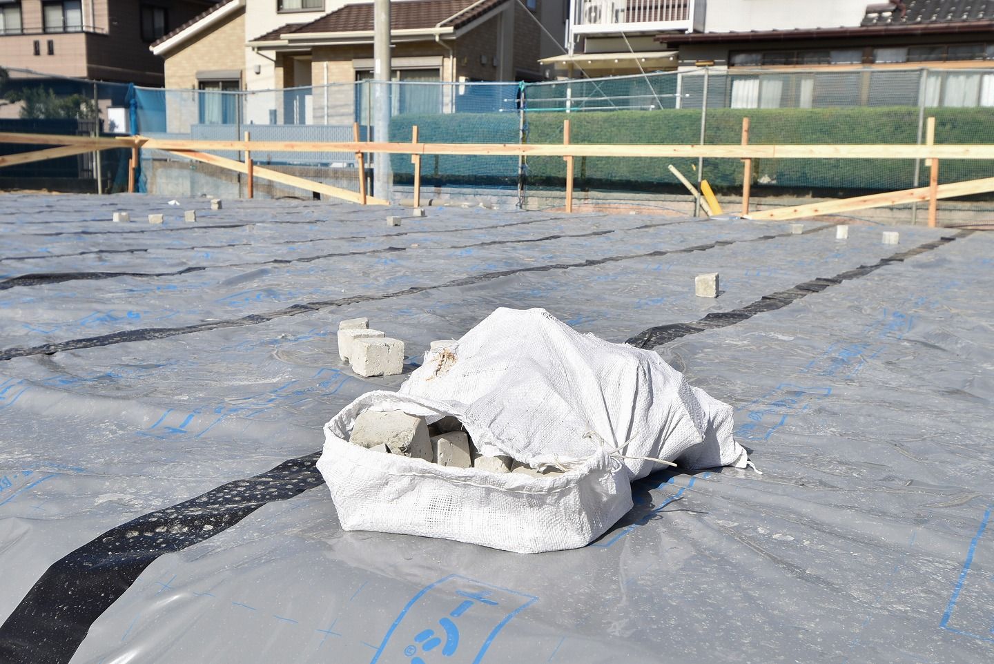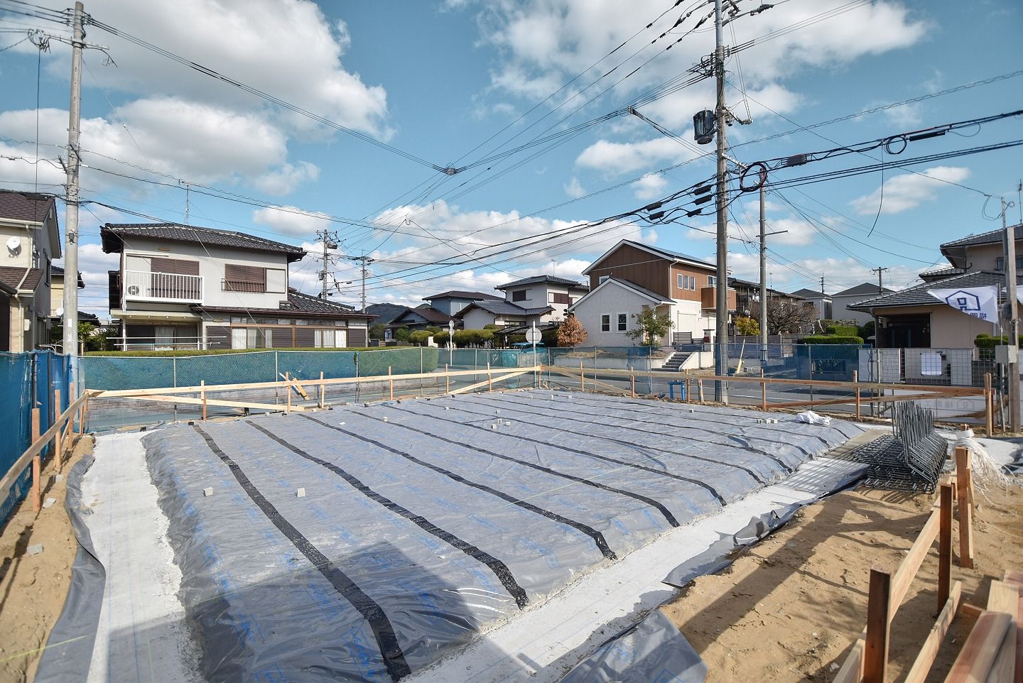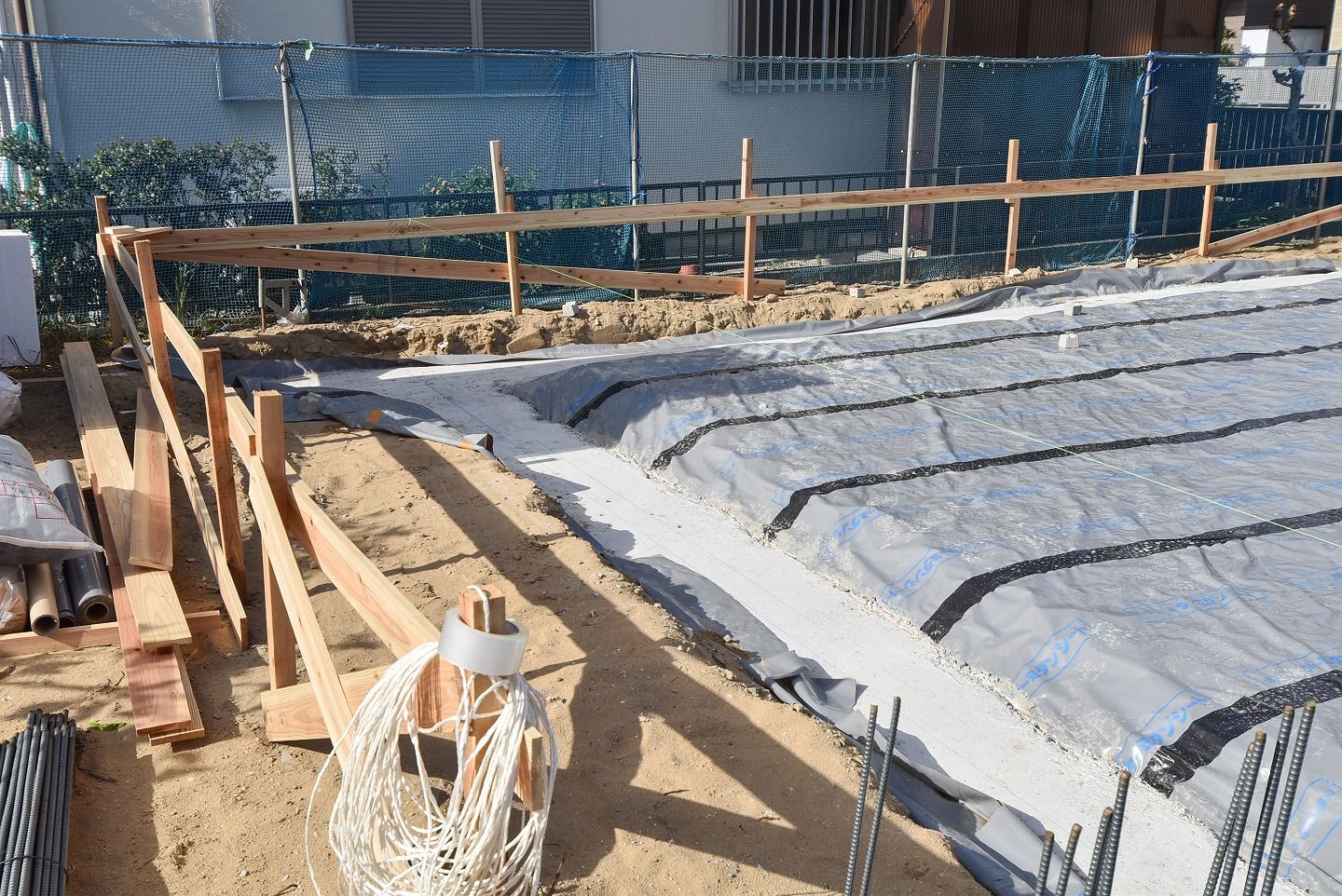 ▼「地業」といわれる根切や転圧、防蟻シートといった工程が完了していました。