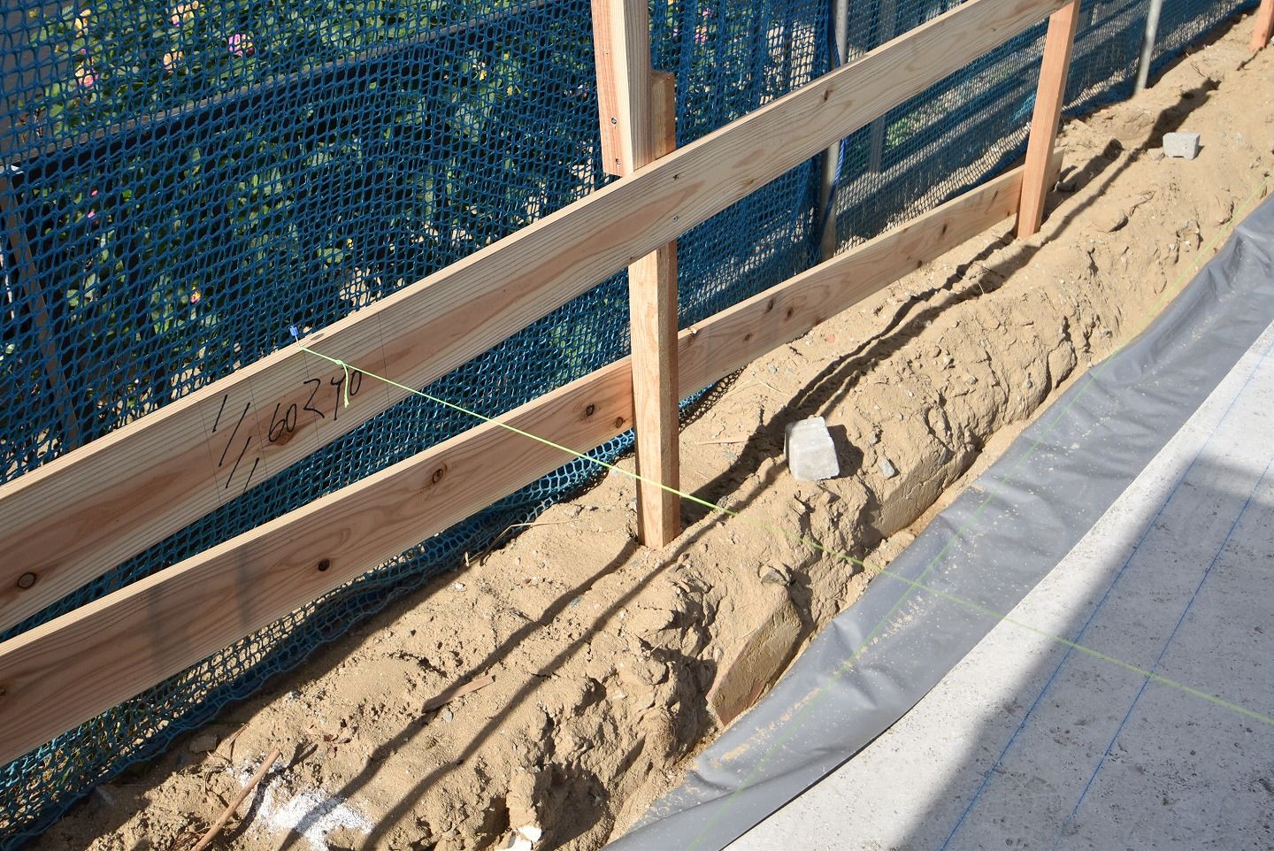 敷地の周り囲むように設置された板は遣り方(やりかた)と言い、建物の正確な位置・寸法・直角・地盤の水平を出すなど、これから進む建築において基準となる非常に重要なものです。