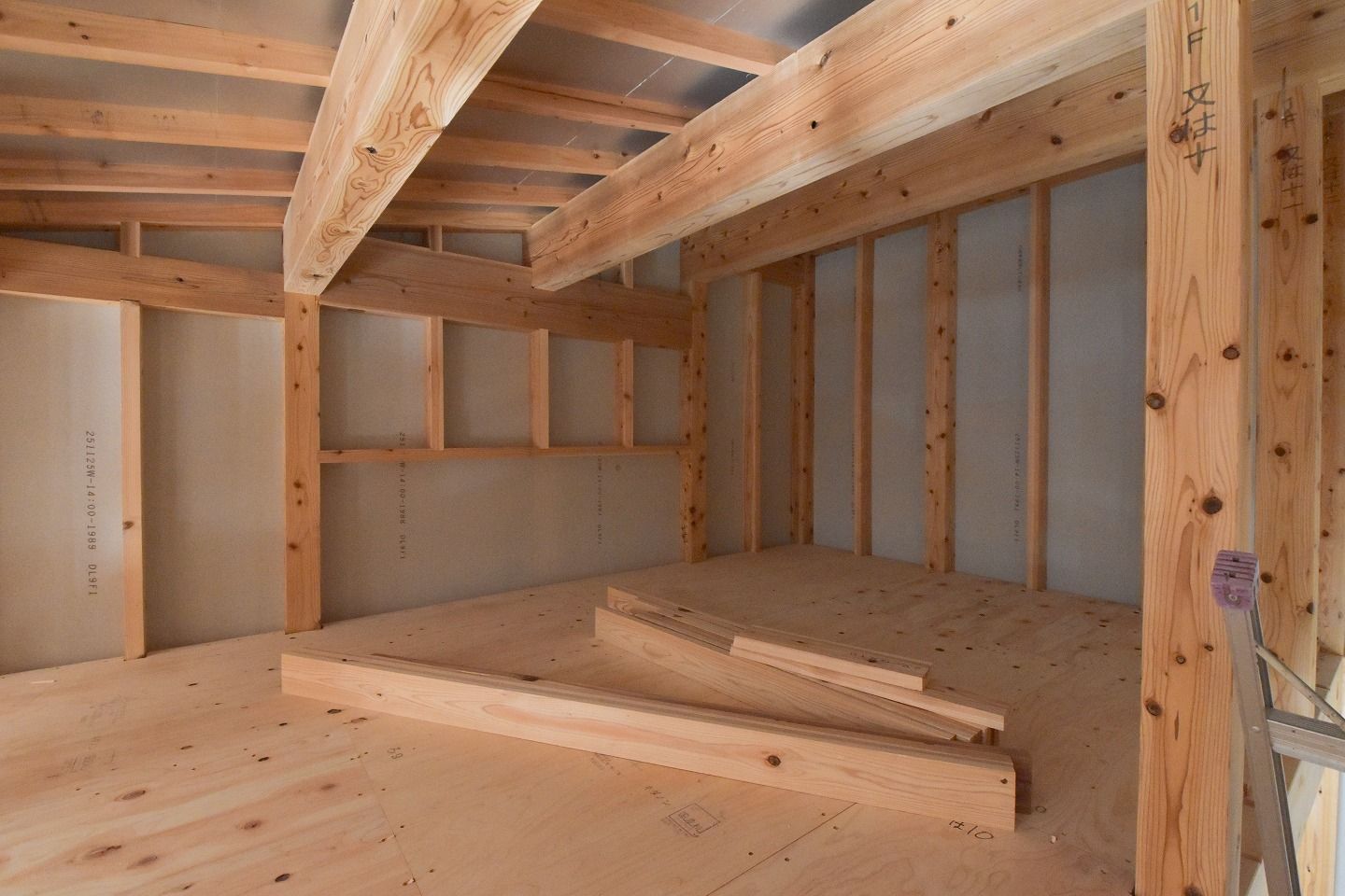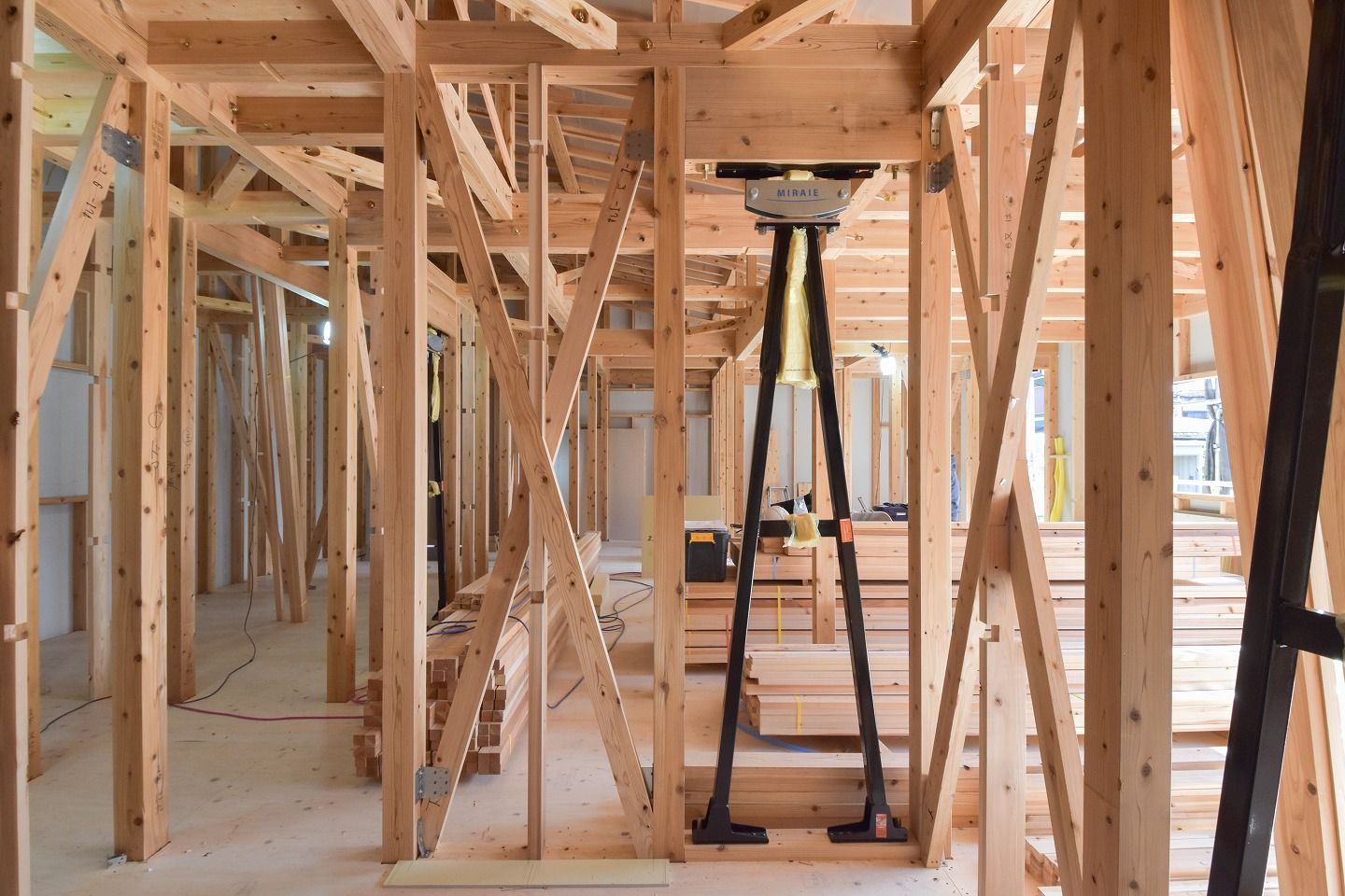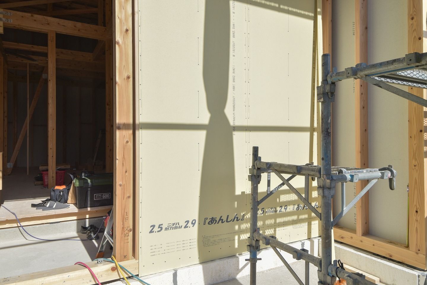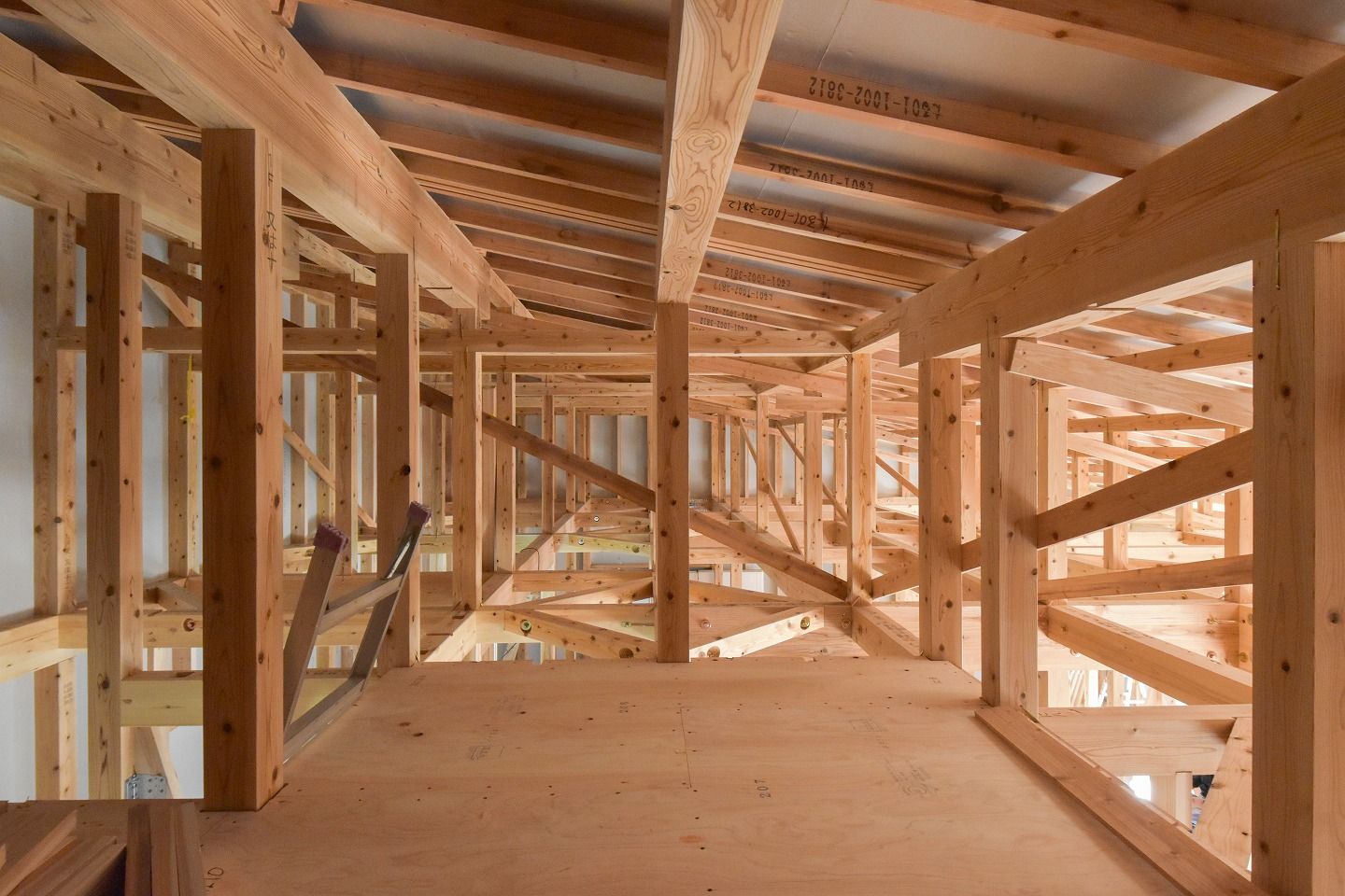 トップページ > 建築現場 > 福津市12 > 「福津市12」注文住宅現場リポート④【木工事】【金物取付】 「福津市12」注文住宅現場リポート④【木工事】【金物取付】 2026.01.17掲載 こんにちは!リポート担当の矢野です。1月14日(木)晴れ。本日は福津市にて木工事の様子をリポートしていきます!▼まずは外壁から見ていきましょう。外壁は高い耐震性、防耐火性、耐久性など、様々な面から建物の安心をつくる「耐力面材あんしん」の取り付けられています。▼1階の様子です。木材が綺麗に整頓されて積み上がっていました。▼間柱の施工もどんどん進んでいます。▼屋根裏は一部がロフトになっていました。「屋根裏」ってワード、いくつになってもワクワクします。▼さらに、今だけの光景も目にすることができました。屋根を支える柱が綺麗に並び、差し込む日の光もきれいで、圧巻の光景でした。▼こちらの左のバッテンは「筋交い」といって、地震や風による建物の変形を防ぎ、耐震性を高める役割があります。そして右の黒いA字のものは「MIRAIE」です。高減衰ゴムを採用し、振動エネルギーを熱エネルギーに変換することで地震の揺れを効率良く吸収するものです。▼本日は「金物取付」が行われていました。この様々な形の金物は、家の柱や梁など目に見えない基礎部分を補強し、家を支える重要な役割を果たしています!本日のリポートはここまで!次回もお楽しみに! もっと福岡工務店を知りたい方 関連記事を見る 2026.01.31 「福津市12」注文住宅現場リポート⑤【木工事】【外断熱材】 2026.01.10 「福津市12」注文住宅現場リポート③【上棟式】 2025.12.05 「福津市12」注文住宅現場リポート②【基礎工事】 2025.11.22 「福津市12」注文住宅現場リポート①【地鎮祭】
