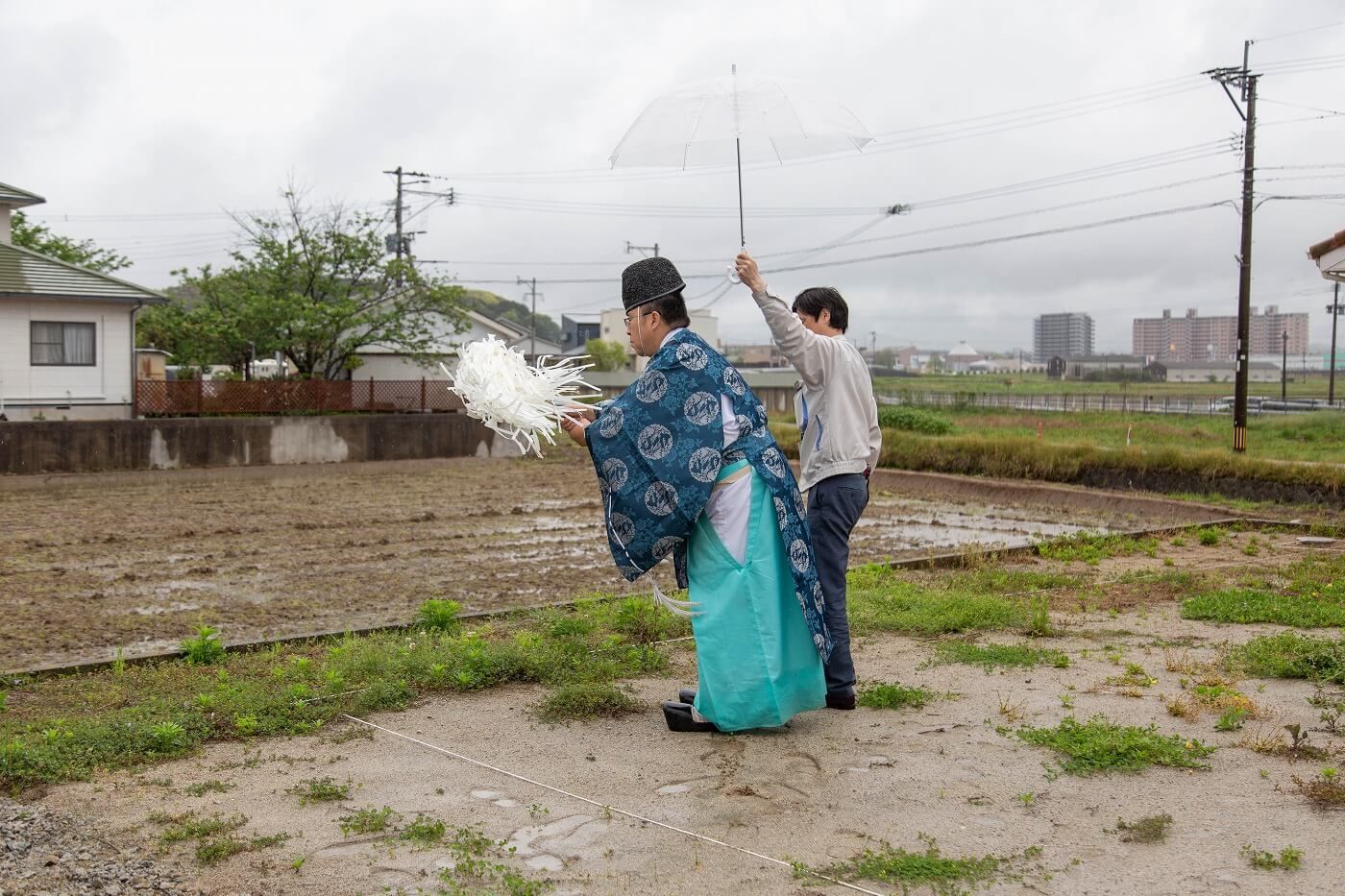 ▼続いて、地鎮行事の一つである「刈初の儀(かりそめのぎ)」を行いました。大地に生えている草を刈り取り、これから家を建てると神様にお披露目する儀式となります。
