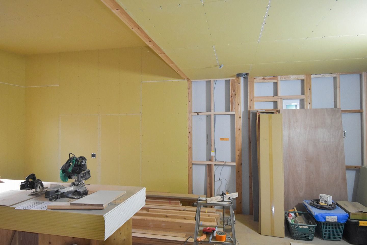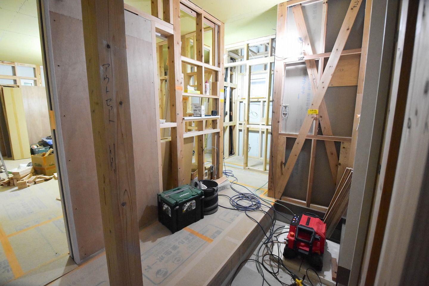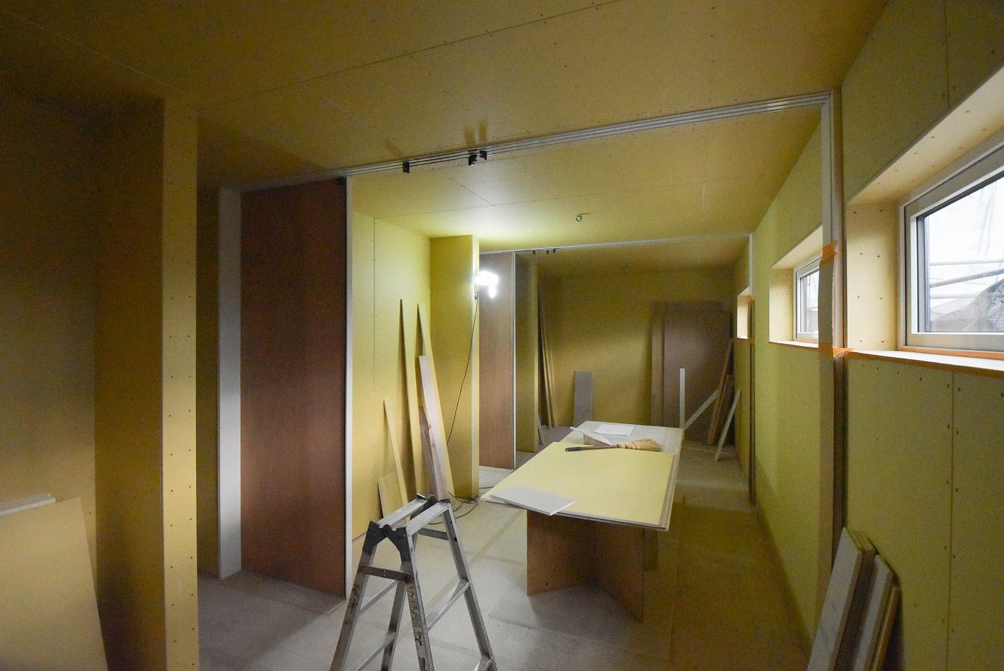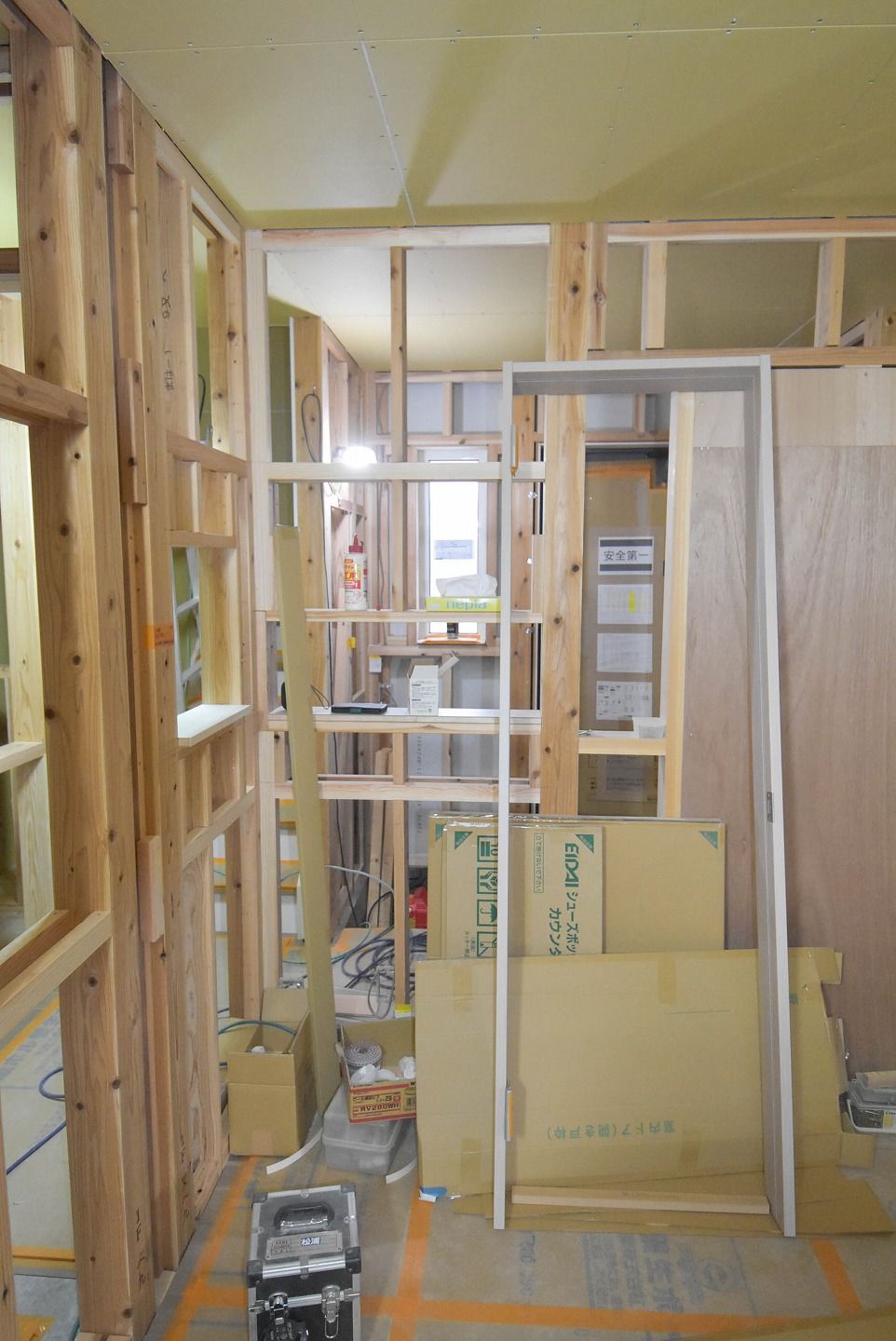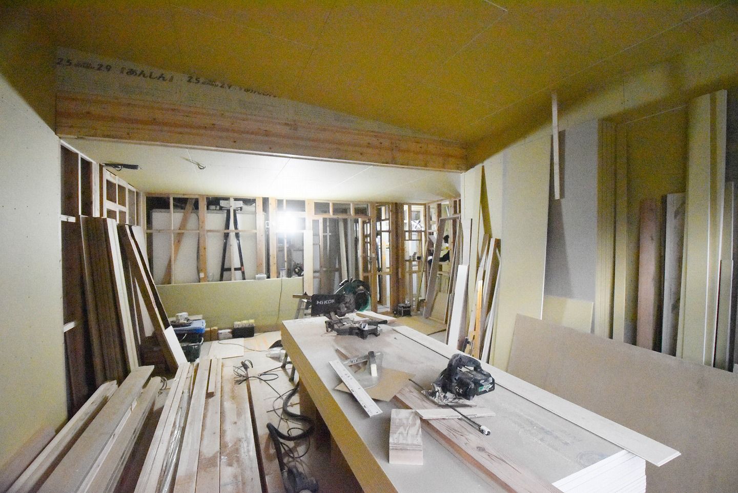 ▼1階の様子を見ていきましょう。1階部分の石膏ボードの設置もほぼ終わり、細かな部分の工事が進んでいます。