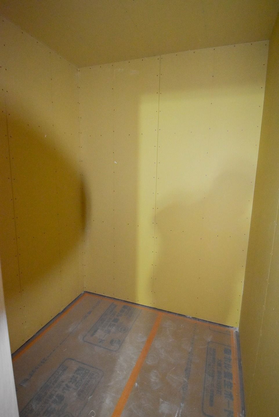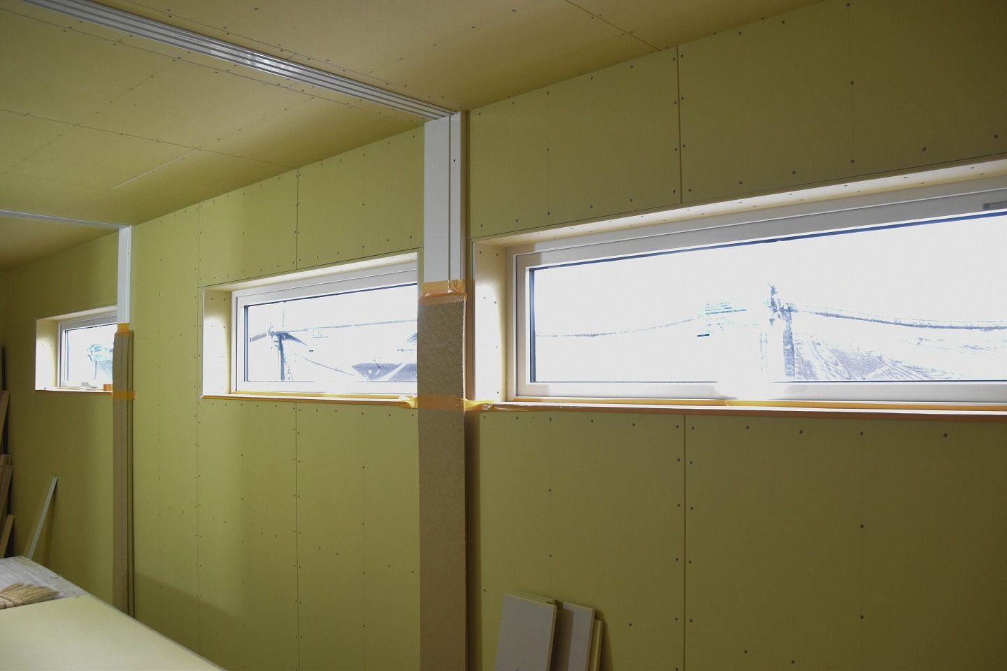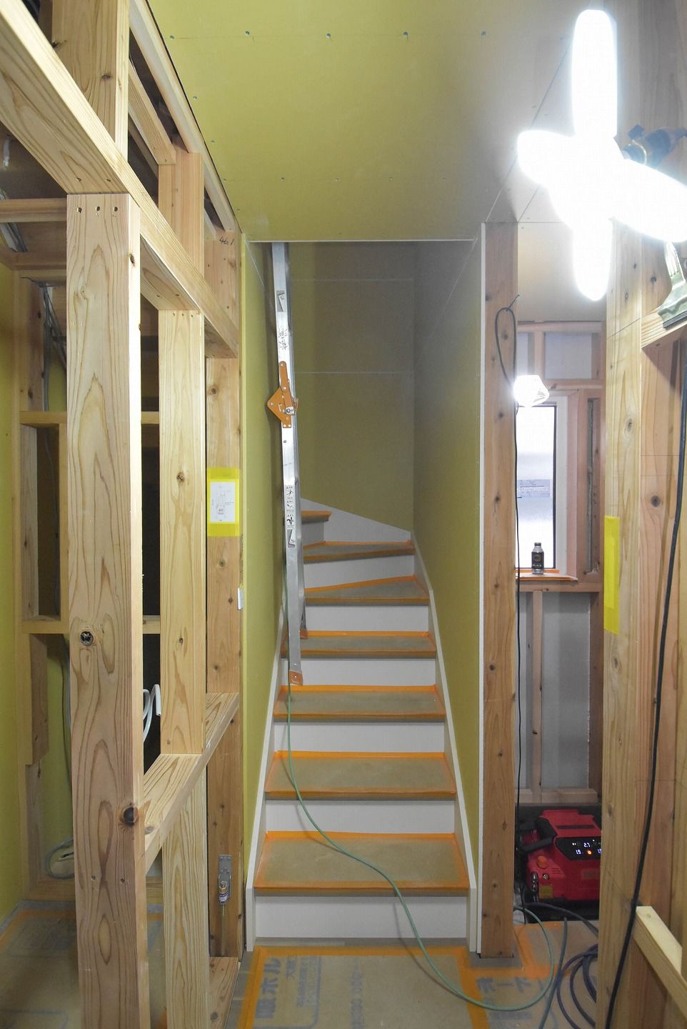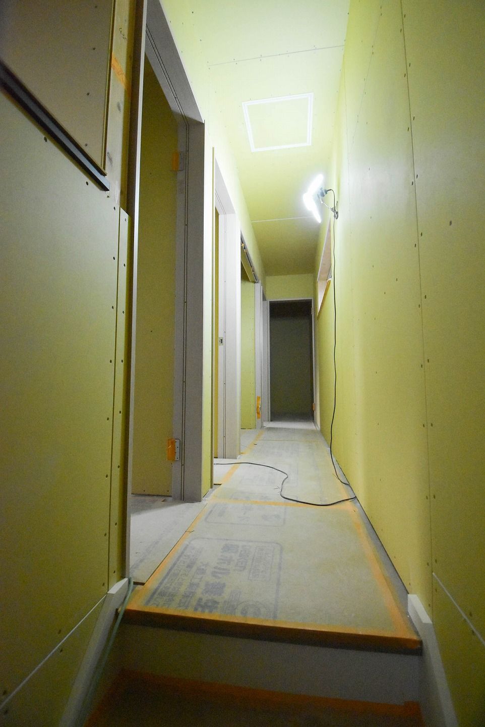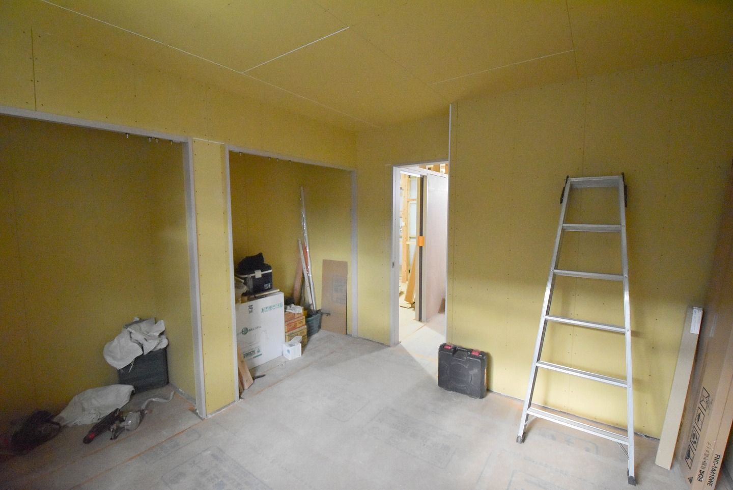 ▼1階の様子を見ていきましょう。1階部分の石膏ボードの設置もほぼ終わり、細かな部分の工事が進んでいます。