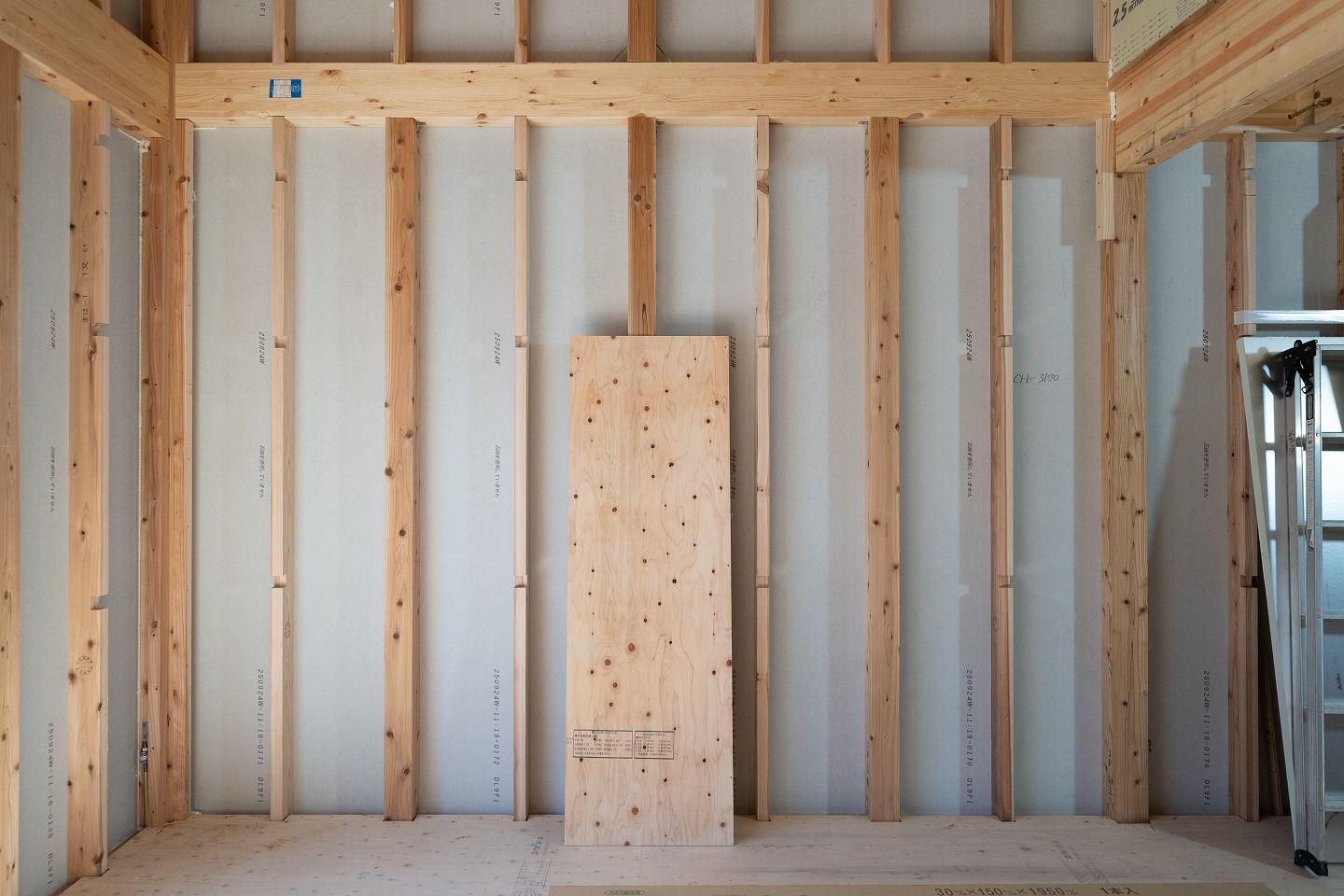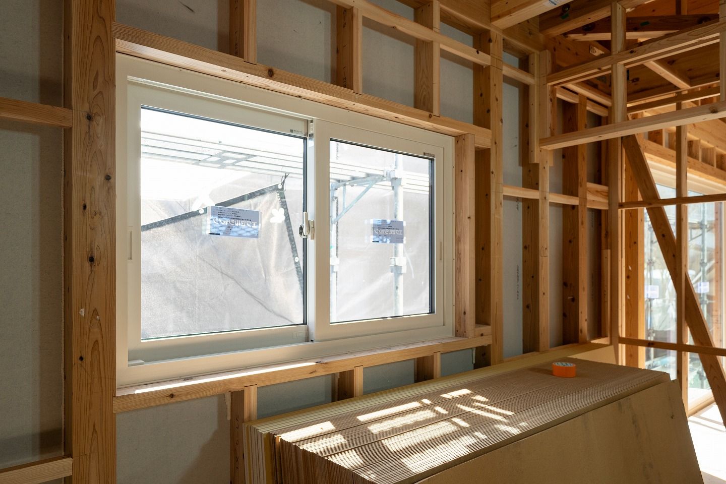 ▼壁面は下地や間柱、サッシ取り付け等が完了していました。