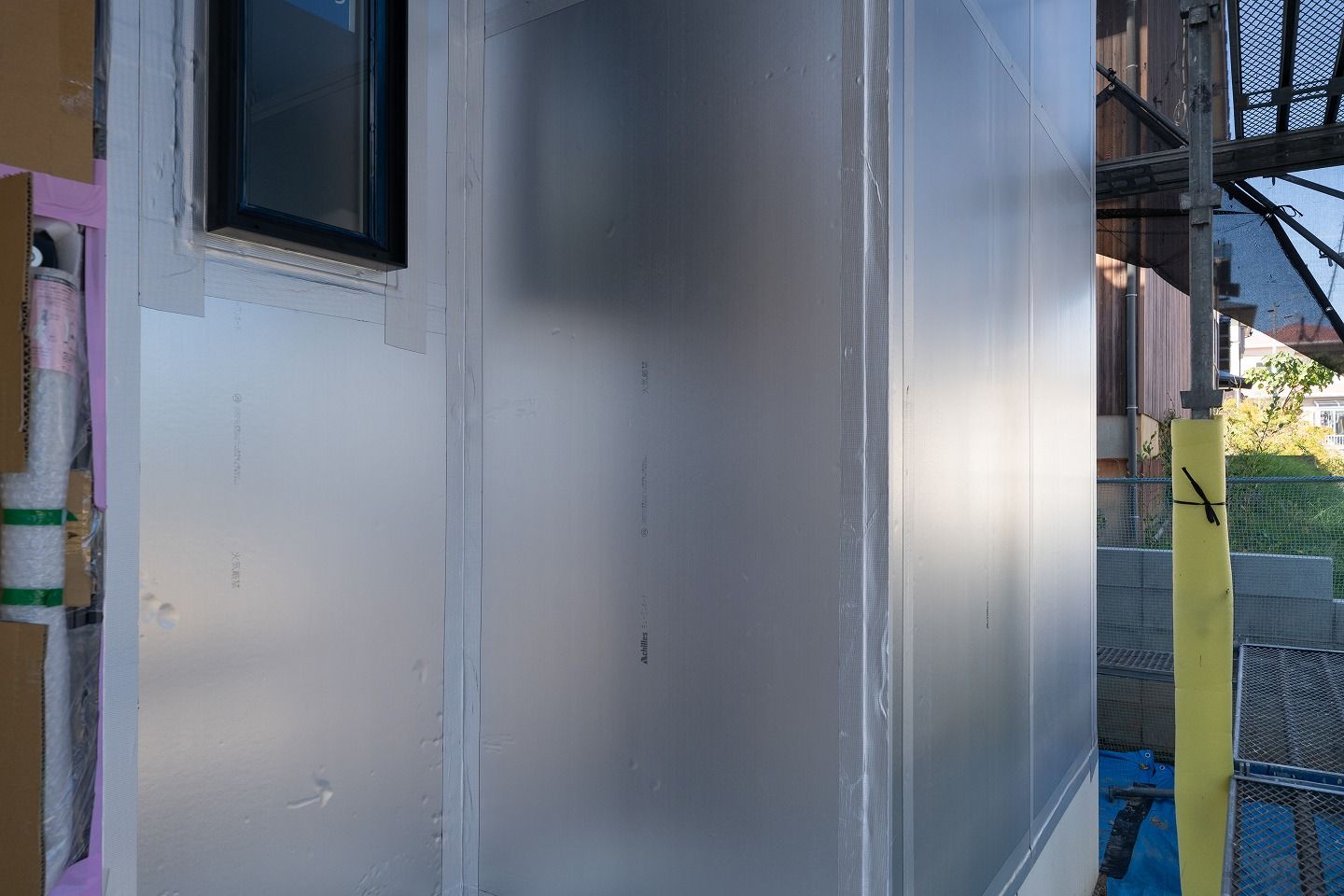 ▼外壁には外断熱材「キューワンボード」の取り付けが完了しています。キューワンボードの表面は赤外線高反射タイプのアルミ箔で覆われており、夏季の遮熱に効果があります。