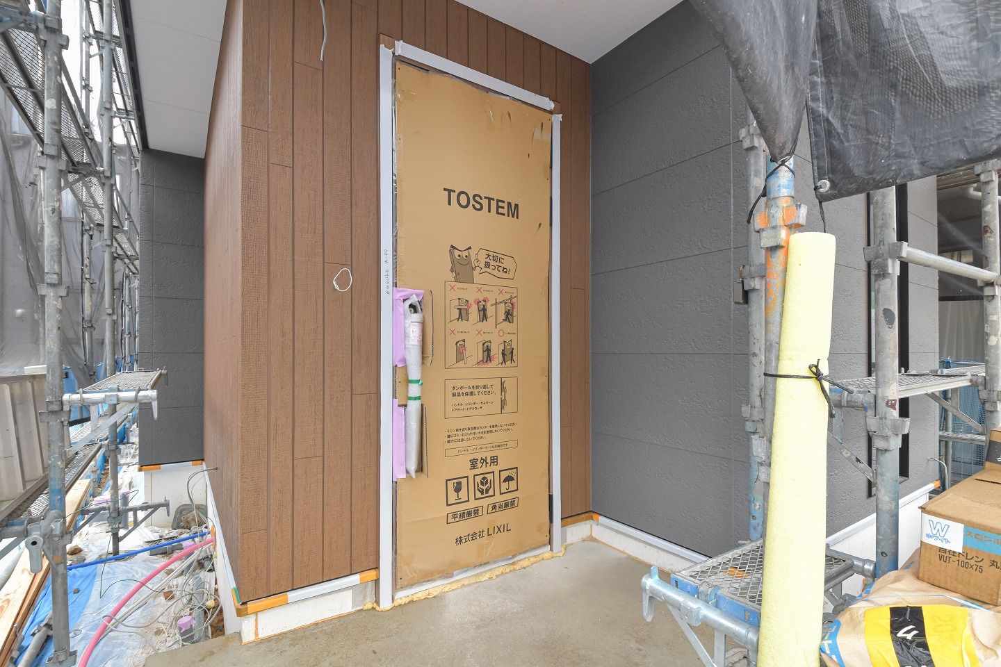 ▼まずは外観です。サイディング工事が完了しました。木目調の玄関デザインがとっても可愛いです!