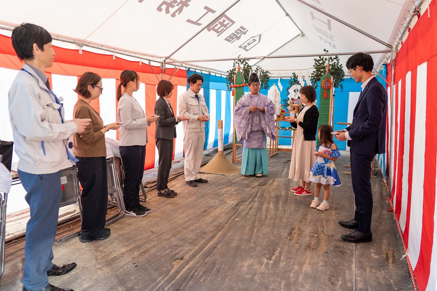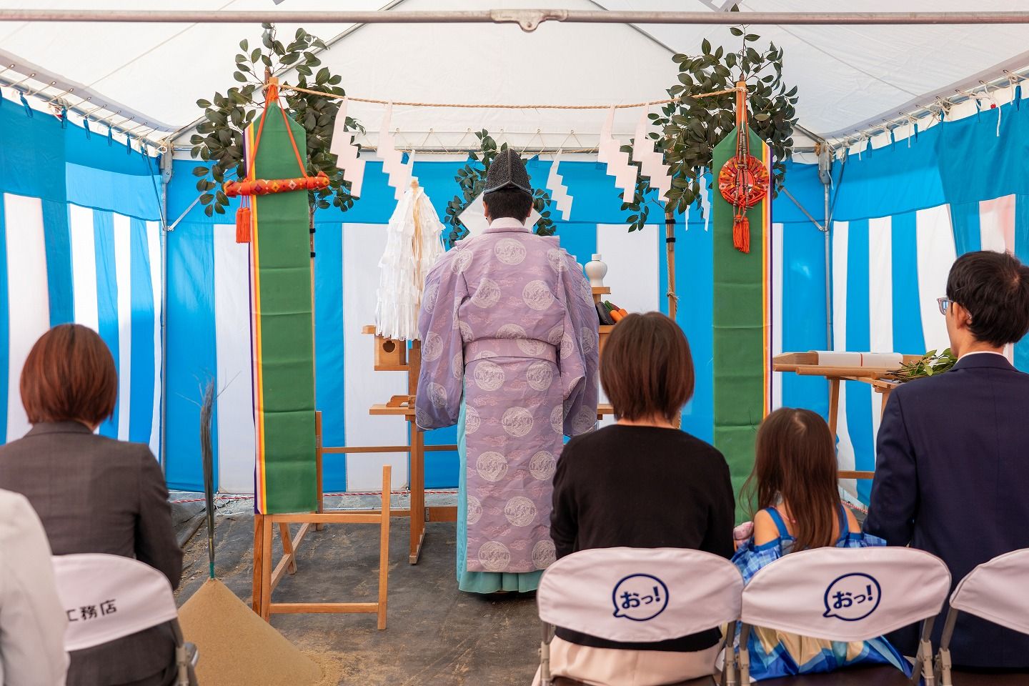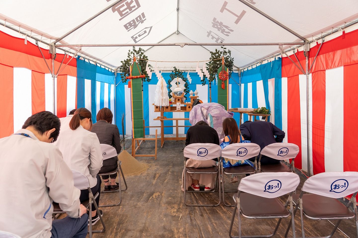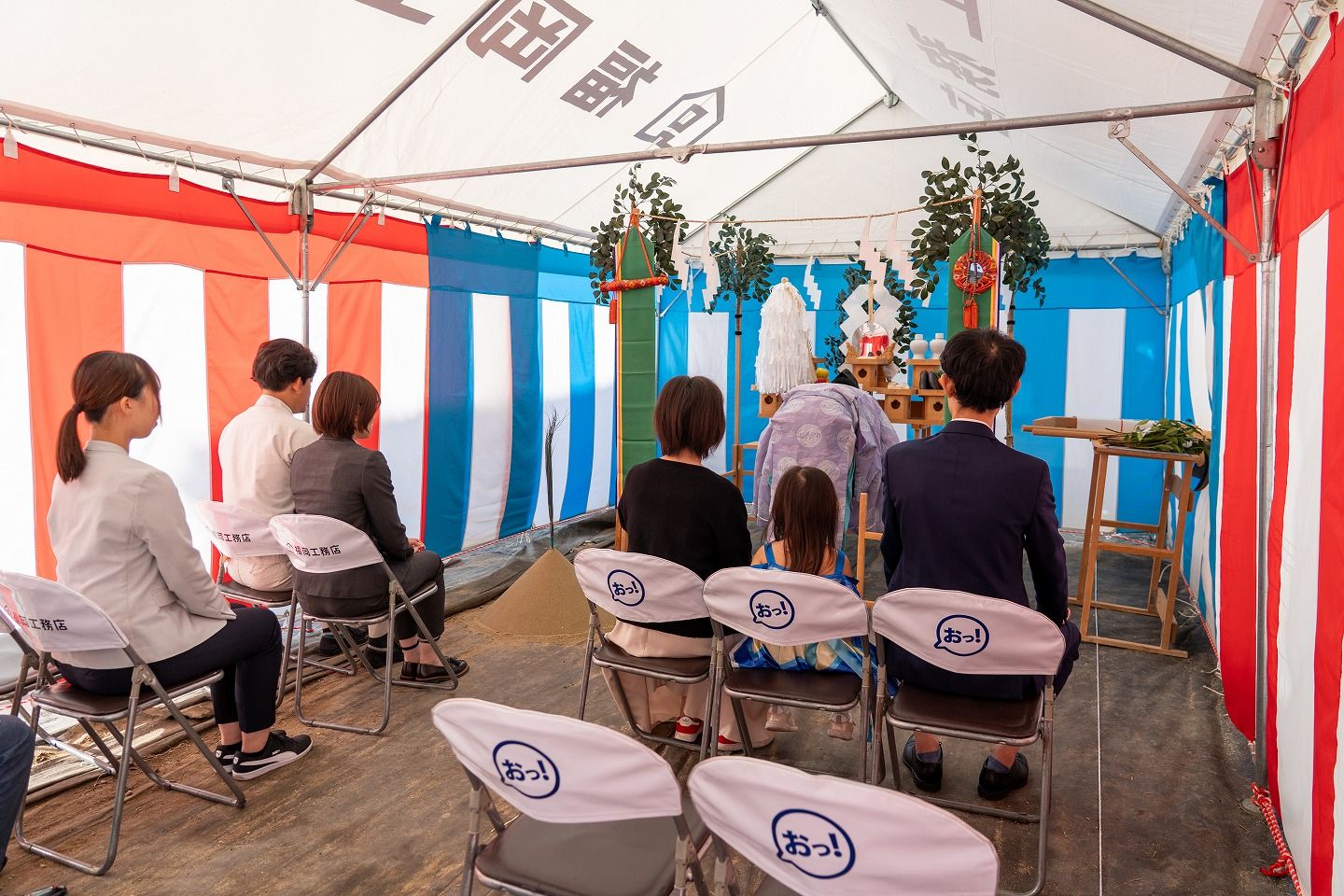 ▼本日の地鎮祭会場です。福岡工務店のロゴが入ったテントが設営されています。