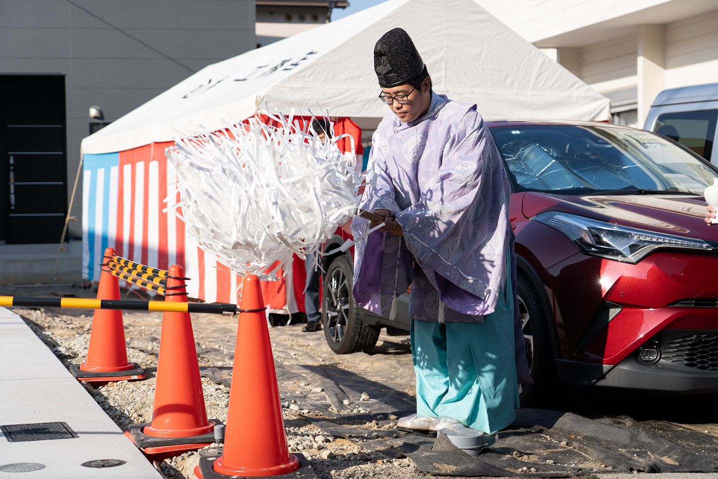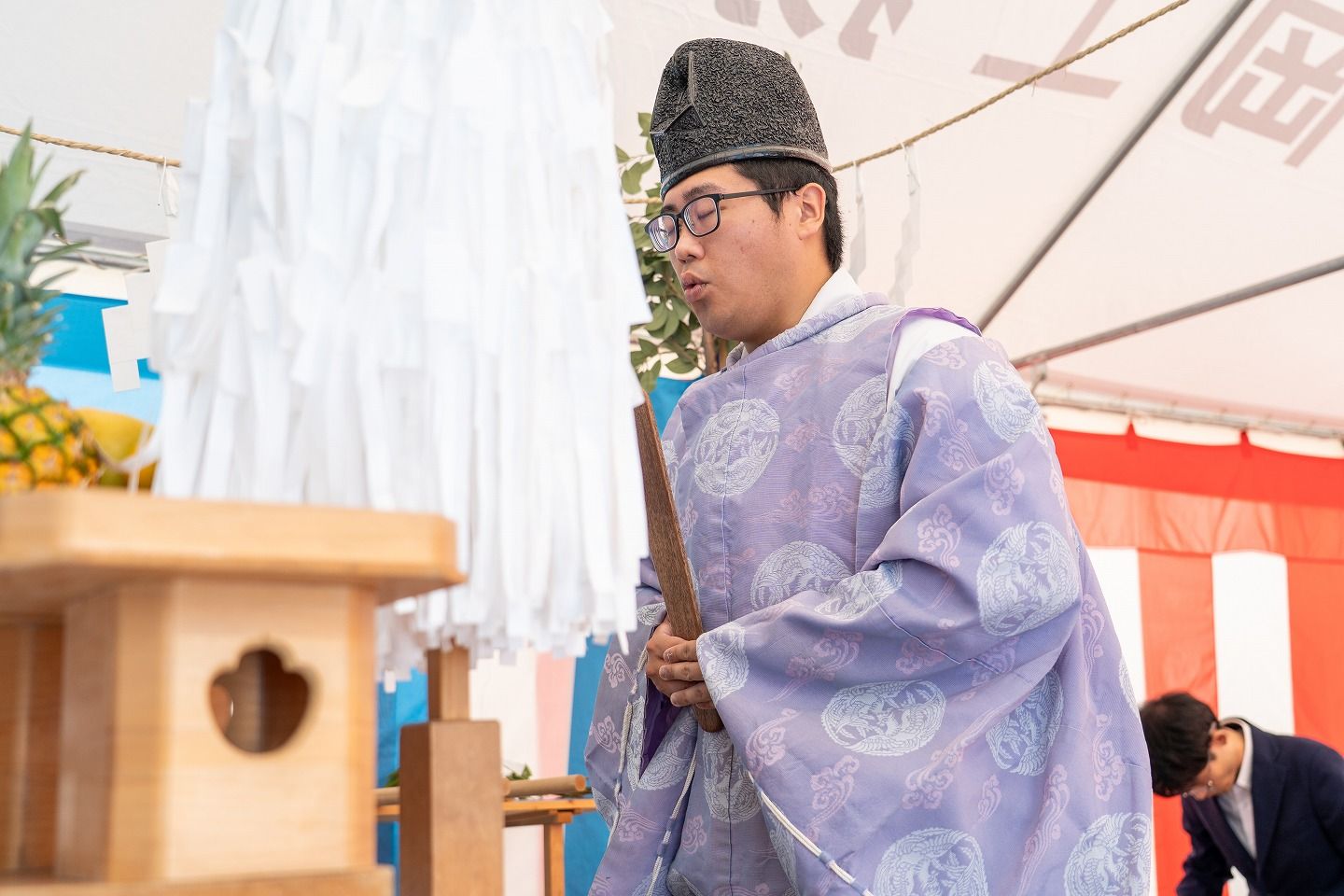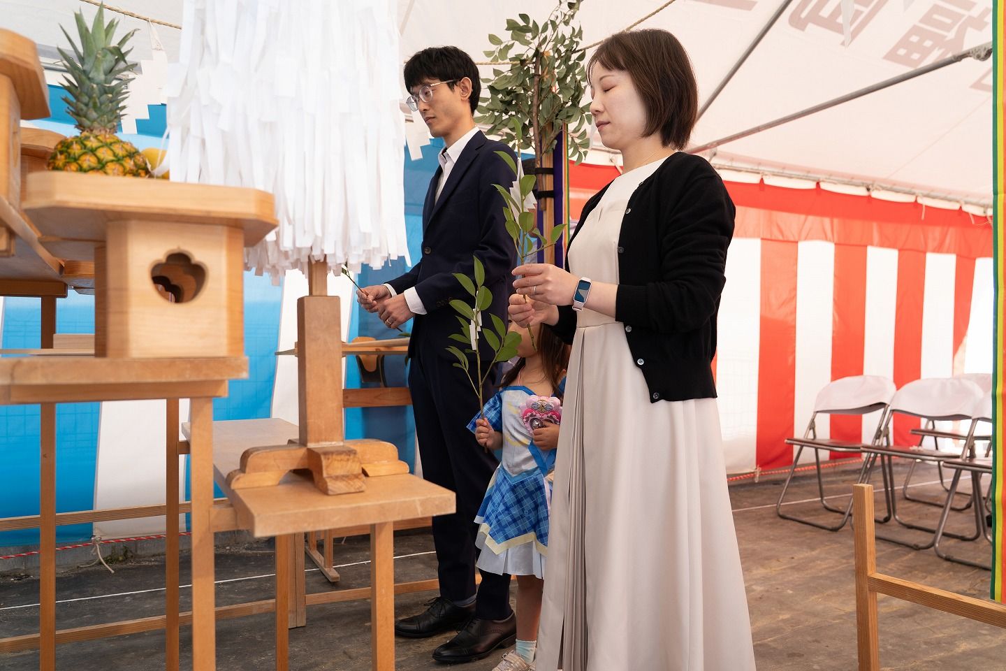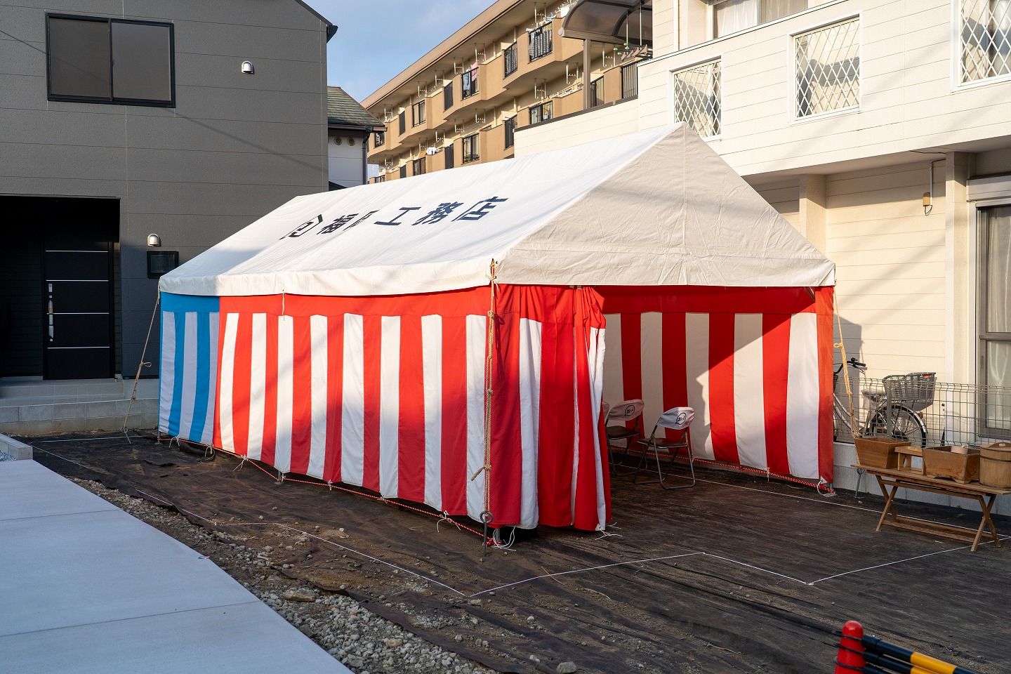 ▼本日の地鎮祭会場です。福岡工務店のロゴが入ったテントが設営されています。