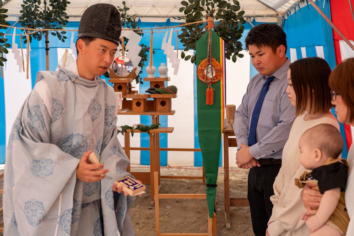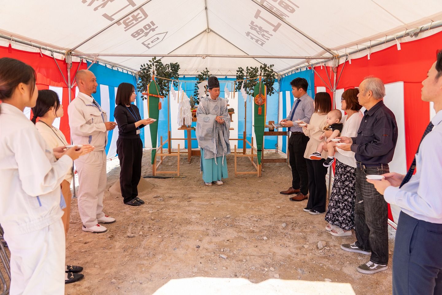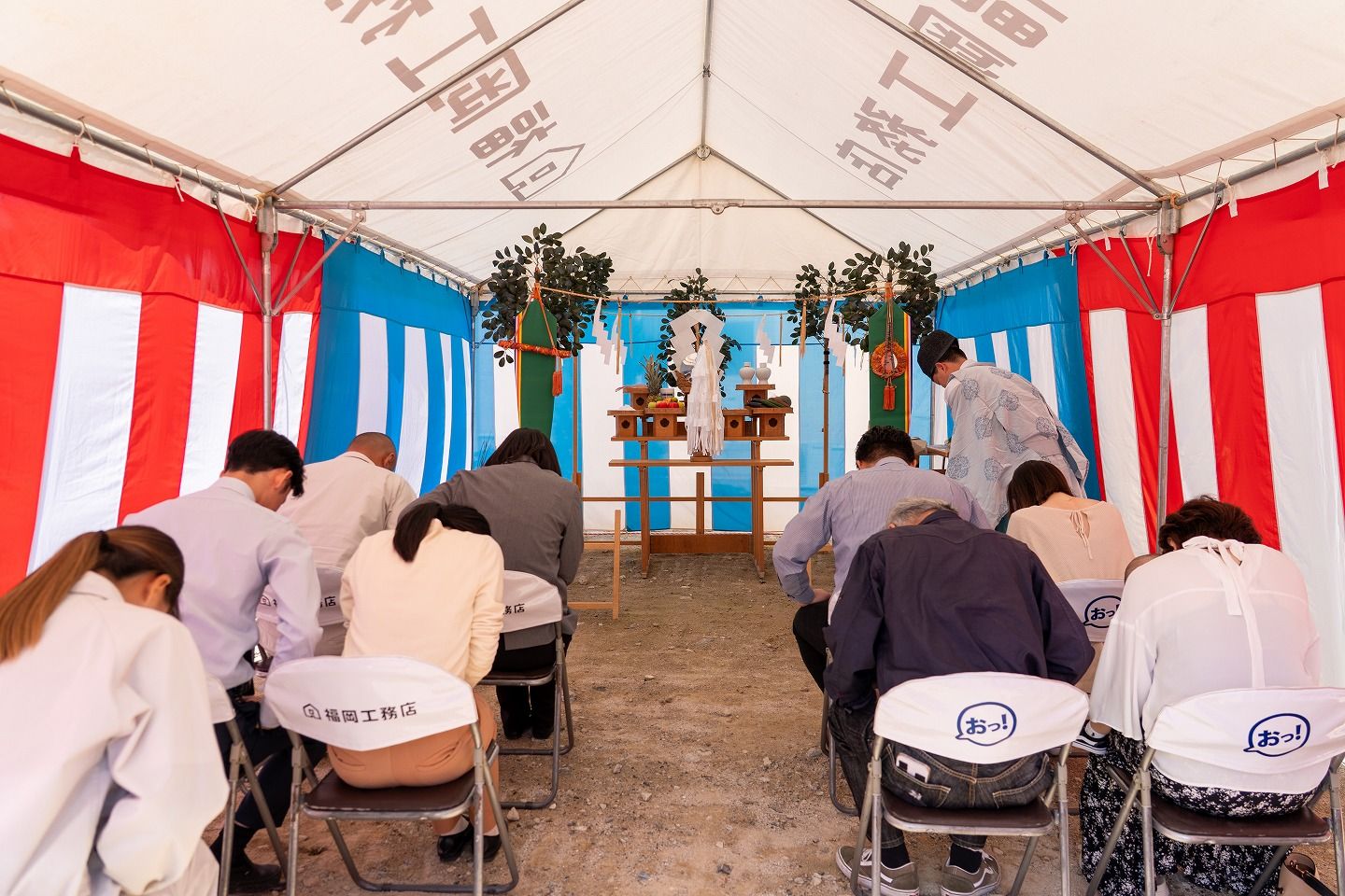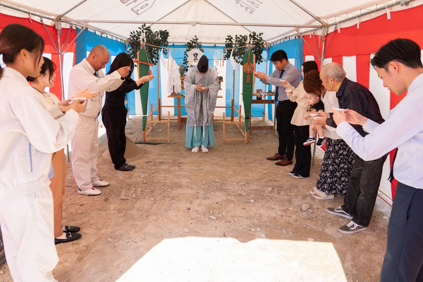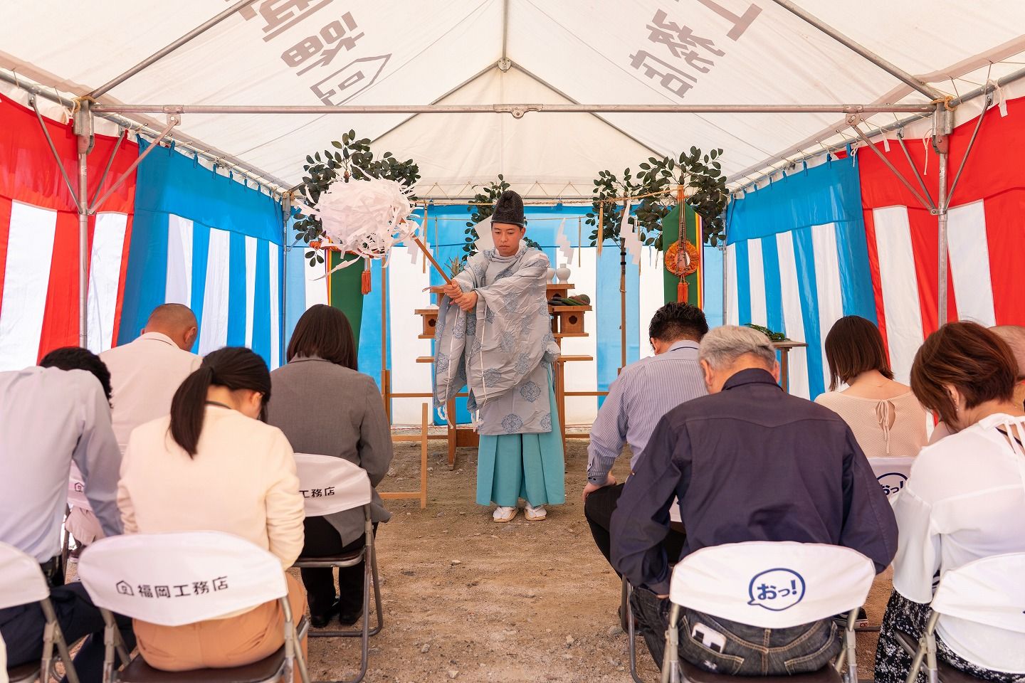 トップページ > 建築現場 > 春日市16 > 「春日市16」注文住宅現場リポート①【地鎮祭】 「春日市16」注文住宅現場リポート①【地鎮祭】 2025.10.23掲載 こんにちは。リポート担当の有村です。10月23日(木)晴れ。本日は、福岡県春日市にて地鎮祭を執り行いました。さっそくリポートしていきましょう!▼お施主様ご一家がご到着されました。まずは水でお清めを行っていただきます。▼祭事前、神主さんから地鎮祭での作法について説明があります。初めての地鎮祭という方がほとんどだと思いますが、ご安心ください!▼一通り説明が終わった後、「修祓の儀(しゅばつのぎ)」から地鎮祭が始まります。▼まずは「大幣(おおぬさ)」を振り、参列者全員のお祓いを行います。▼続いて神様をお招きする「降神の儀(こうしんのぎ)」、神様に祭祀の意義や目的を申し上げる「祝詞奏上(のりとそうじょう)」と進んでいきます。▼祝詞奏上の次は、敷地の四方をお神酒やお塩でお祓いする「四方祓いの儀(しほうはらいのぎ)」を行います。▼続いて、地鎮行事の一つである「刈初の儀(かりそめのぎ)」を行いました。大地に生えている草を刈り取り、これから家を建てると神様にお披露目する儀式となります。▼次に、土を耕し整地する意味がある「鍬入れの儀(くわいれのぎ)」を行いました。▼施工会社がしっかりとした丈夫な家を建てるという意味がある「杭打ちの儀(くいうちのぎ)」を行いました。▼次に「玉串奉奠(たまぐしほうてん)」を行いました。玉串奉奠は、工事の無事やご家族の健康など、様々な思いを玉串に乗せて、御神前に捧げる儀式となります。▼最後は「昇神の儀(しょうしんのぎ)」にて、お呼びした神様にお帰りいただきます。ご神前に深く一礼をし、これで地鎮行事は終了となります。▼地鎮祭が無事に終了し、工事安全・家内安全を祈って、全員で乾杯です。▼神主さんより、「鎮物」と「上棟札」のお渡しと説明がありました。▼本日の地鎮祭、誠におめでとうございます。これから始まる念願の家づくり、ぜひお楽しみください!▼本日のおまけ皆に大人気のお子様です!かわいいですねぇ~! もっと福岡工務店を知りたい方