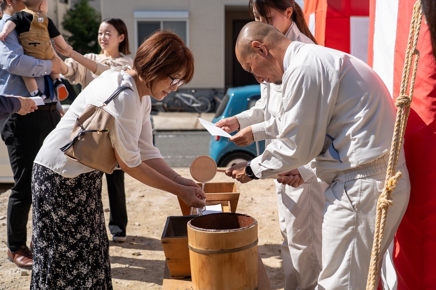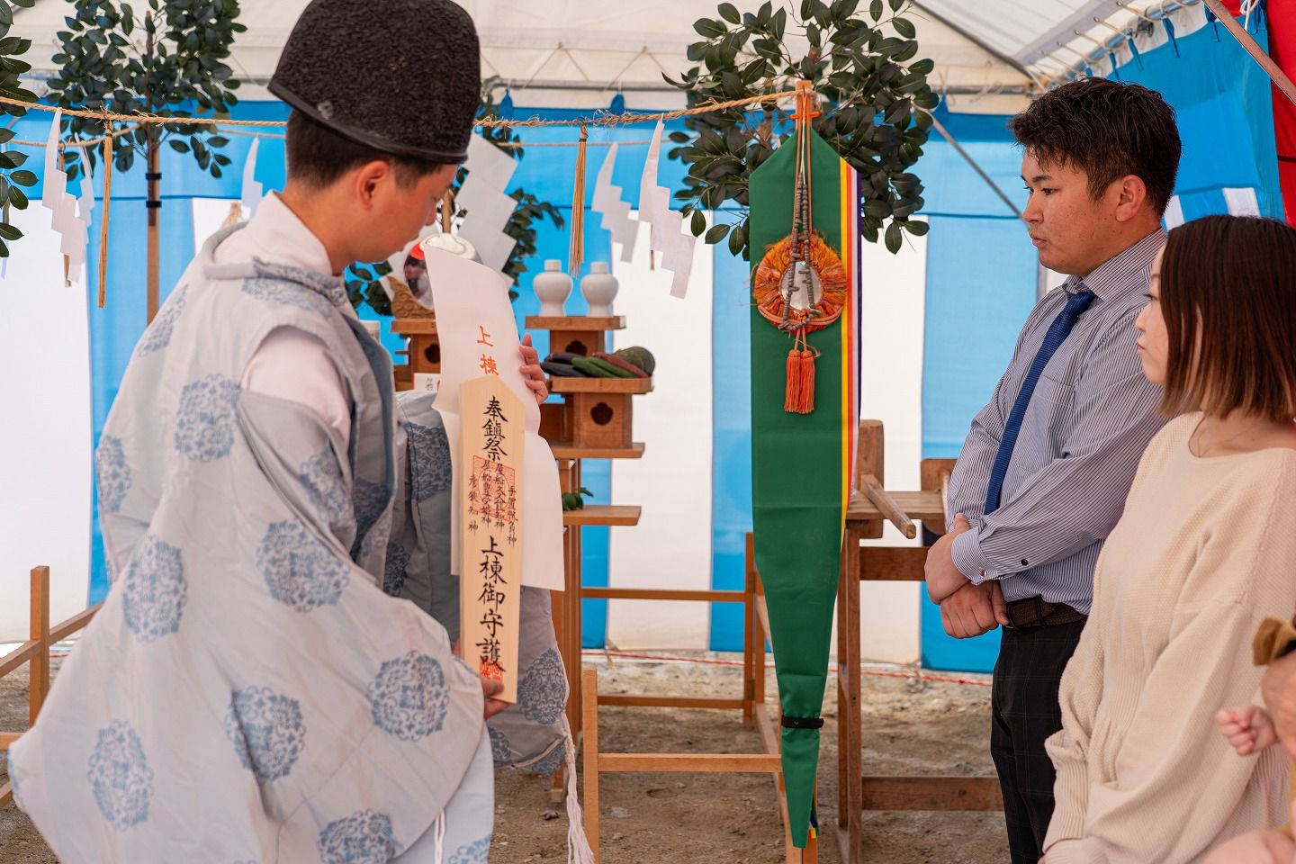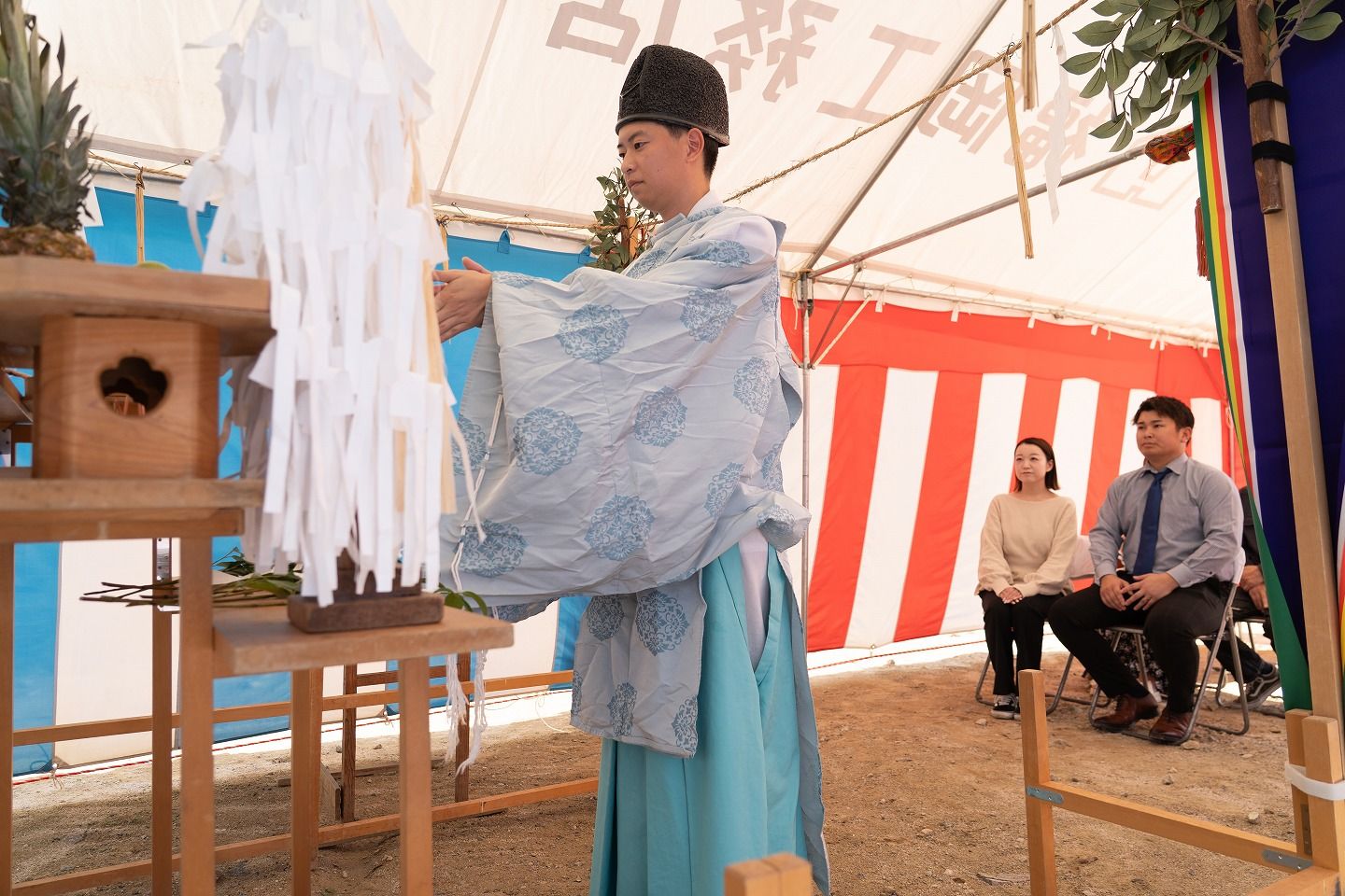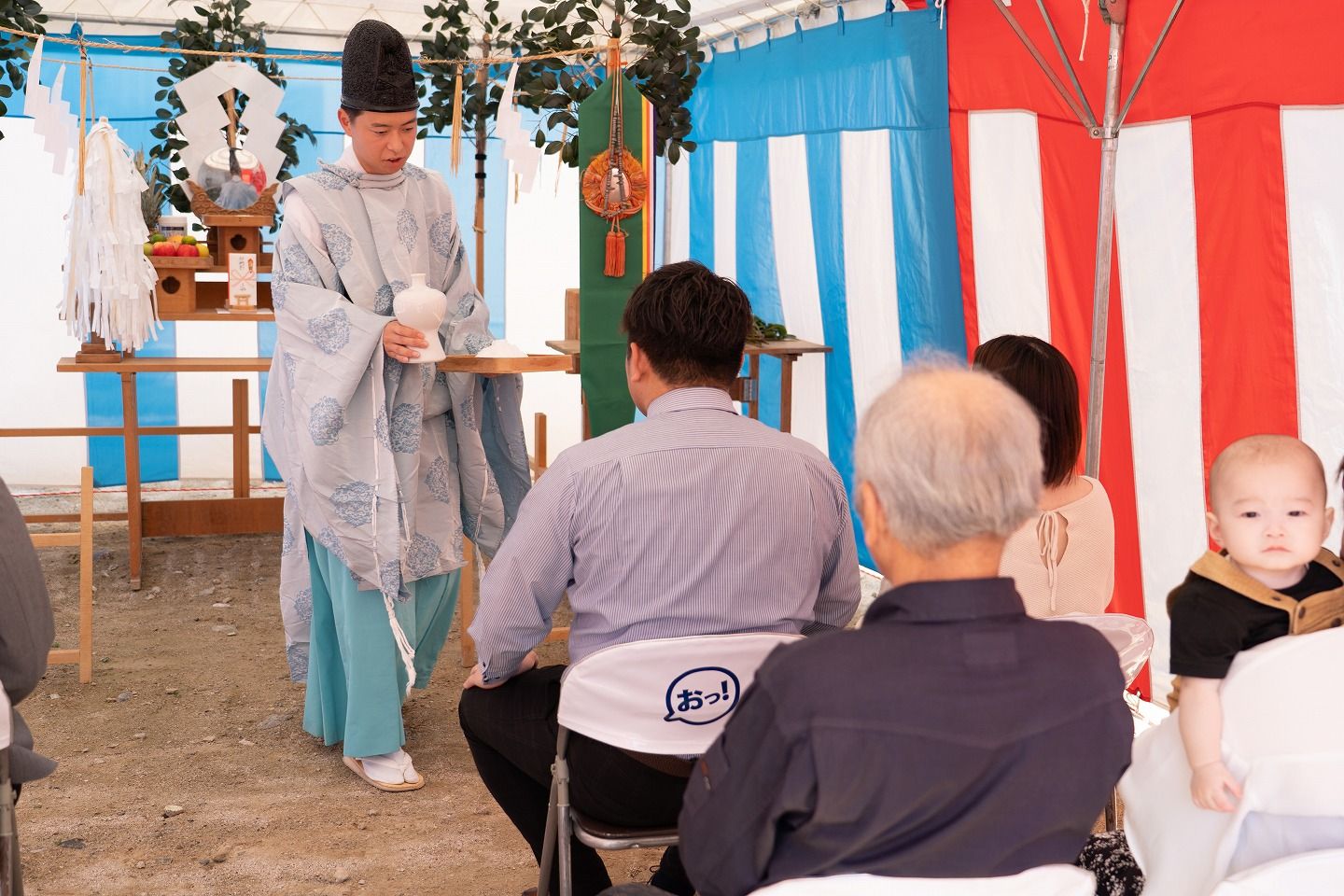 トップページ > 建築現場 > 春日市16 > 「春日市16」注文住宅現場リポート①【地鎮祭】 「春日市16」注文住宅現場リポート①【地鎮祭】 2025.10.23掲載 こんにちは。リポート担当の有村です。10月23日(木)晴れ。本日は、福岡県春日市にて地鎮祭を執り行いました。さっそくリポートしていきましょう!▼お施主様ご一家がご到着されました。まずは水でお清めを行っていただきます。▼祭事前、神主さんから地鎮祭での作法について説明があります。初めての地鎮祭という方がほとんどだと思いますが、ご安心ください!▼一通り説明が終わった後、「修祓の儀(しゅばつのぎ)」から地鎮祭が始まります。▼まずは「大幣(おおぬさ)」を振り、参列者全員のお祓いを行います。▼続いて神様をお招きする「降神の儀(こうしんのぎ)」、神様に祭祀の意義や目的を申し上げる「祝詞奏上(のりとそうじょう)」と進んでいきます。▼祝詞奏上の次は、敷地の四方をお神酒やお塩でお祓いする「四方祓いの儀(しほうはらいのぎ)」を行います。▼続いて、地鎮行事の一つである「刈初の儀(かりそめのぎ)」を行いました。大地に生えている草を刈り取り、これから家を建てると神様にお披露目する儀式となります。▼次に、土を耕し整地する意味がある「鍬入れの儀(くわいれのぎ)」を行いました。▼施工会社がしっかりとした丈夫な家を建てるという意味がある「杭打ちの儀(くいうちのぎ)」を行いました。▼次に「玉串奉奠(たまぐしほうてん)」を行いました。玉串奉奠は、工事の無事やご家族の健康など、様々な思いを玉串に乗せて、御神前に捧げる儀式となります。▼最後は「昇神の儀(しょうしんのぎ)」にて、お呼びした神様にお帰りいただきます。ご神前に深く一礼をし、これで地鎮行事は終了となります。▼地鎮祭が無事に終了し、工事安全・家内安全を祈って、全員で乾杯です。▼神主さんより、「鎮物」と「上棟札」のお渡しと説明がありました。▼本日の地鎮祭、誠におめでとうございます。これから始まる念願の家づくり、ぜひお楽しみください!▼本日のおまけ皆に大人気のお子様です!かわいいですねぇ~! もっと福岡工務店を知りたい方