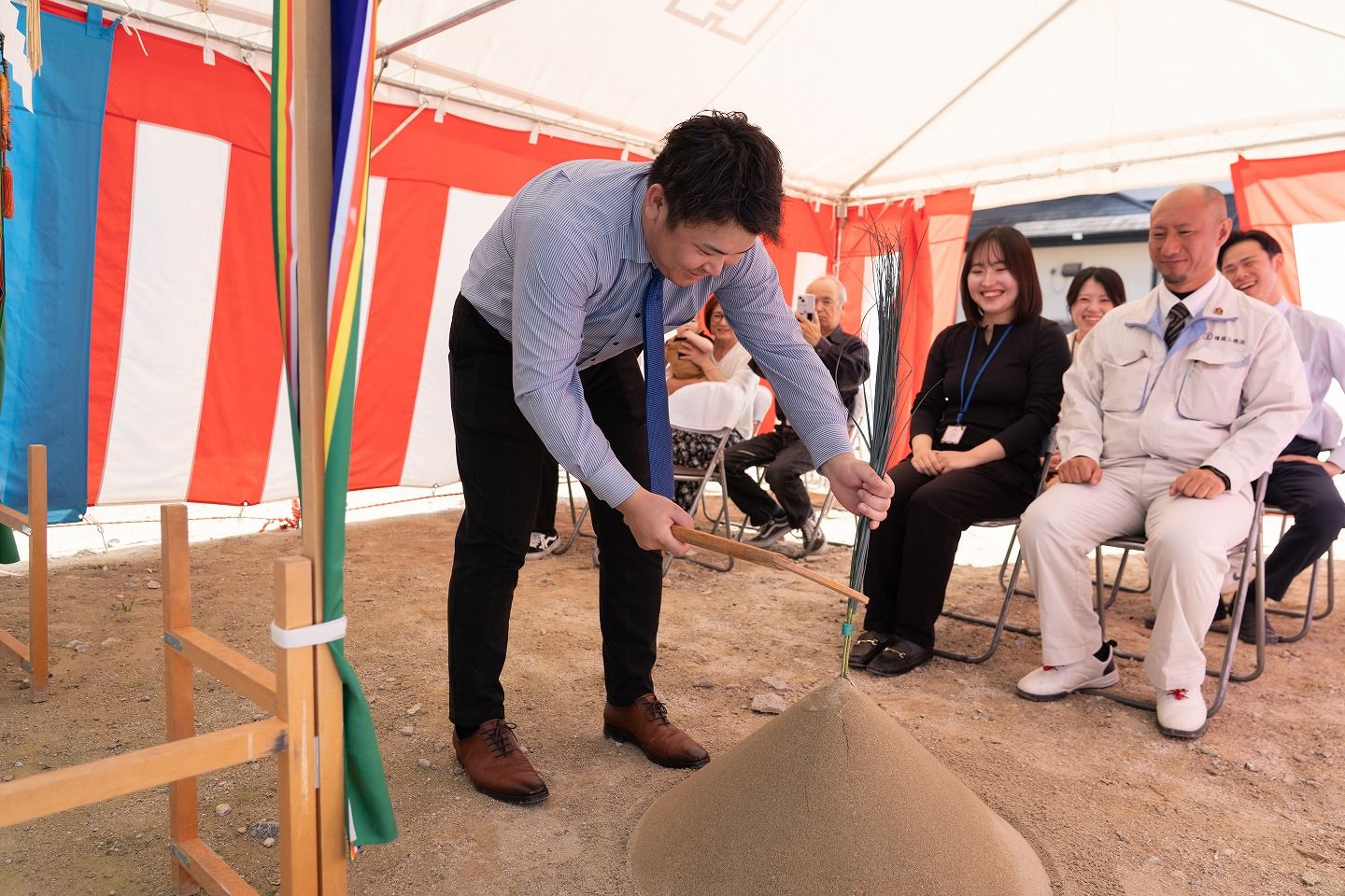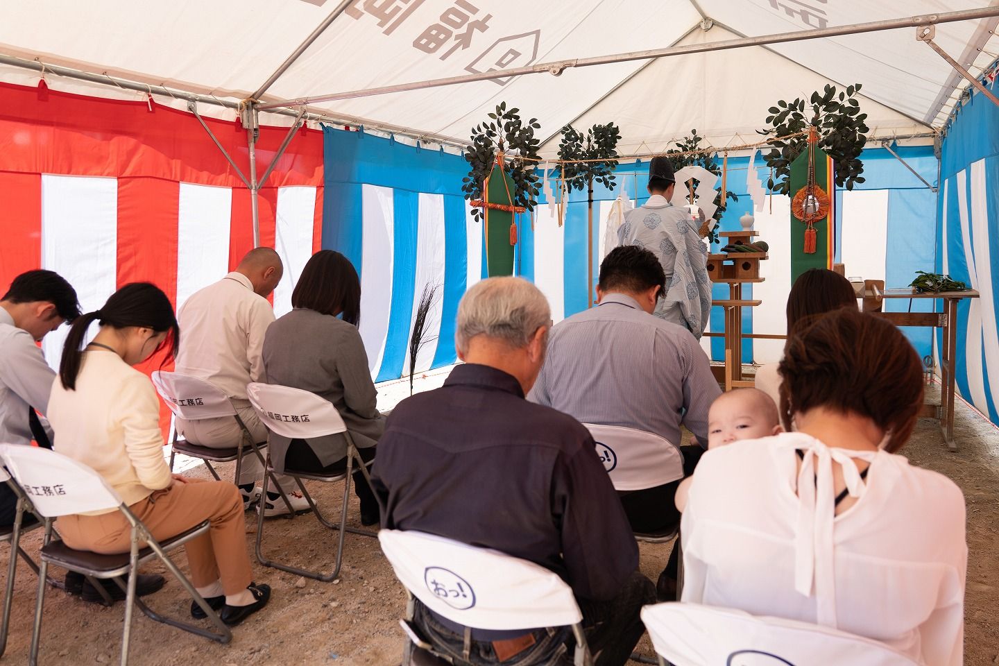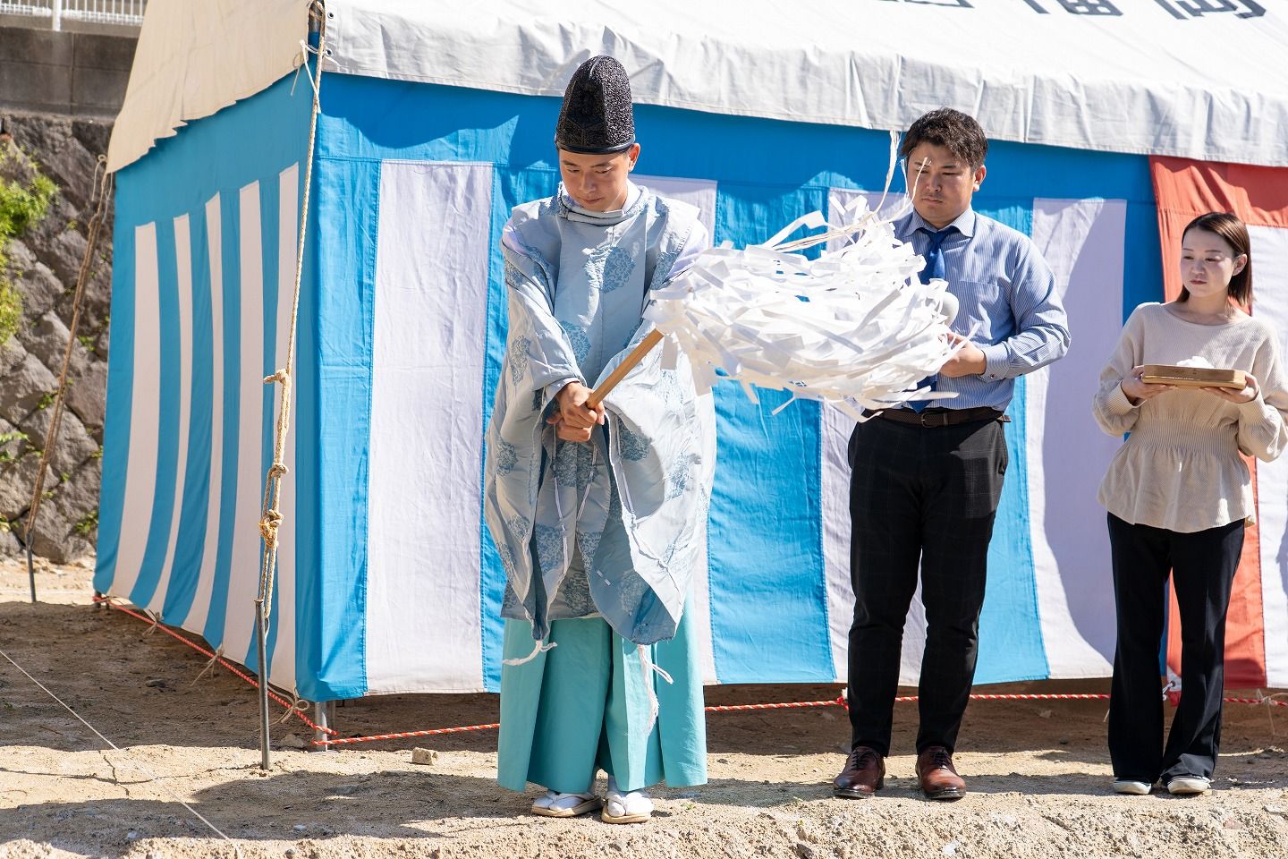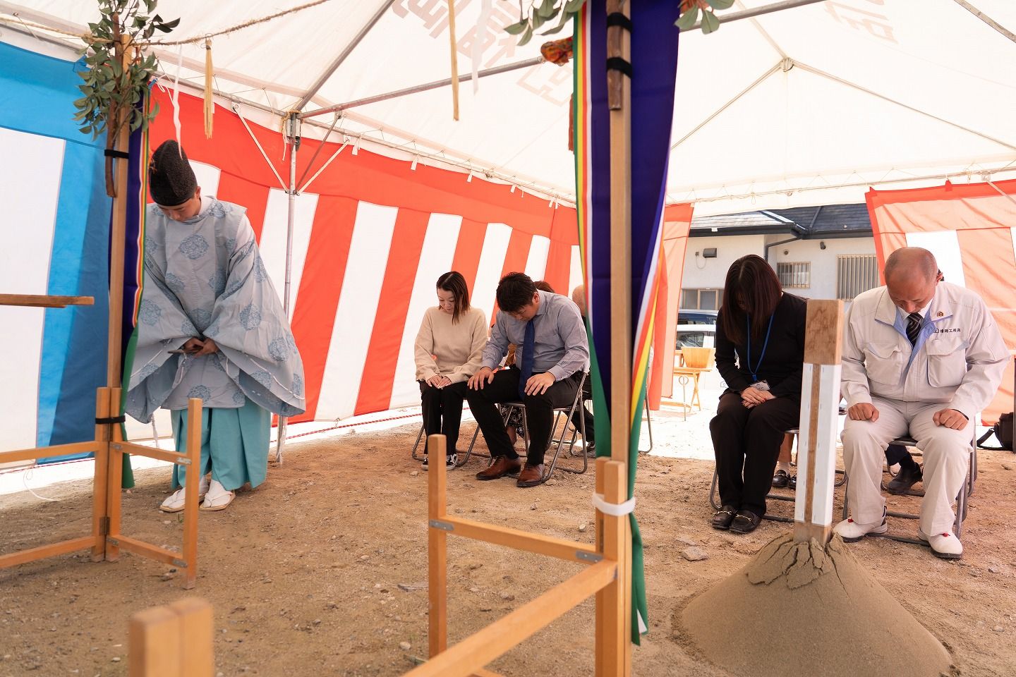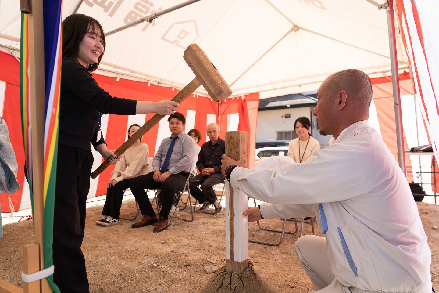 トップページ > 建築現場 > 春日市16 > 「春日市16」注文住宅現場リポート①【地鎮祭】 「春日市16」注文住宅現場リポート①【地鎮祭】 2025.10.23掲載 こんにちは。リポート担当の有村です。10月23日(木)晴れ。本日は、福岡県春日市にて地鎮祭を執り行いました。さっそくリポートしていきましょう!▼お施主様ご一家がご到着されました。まずは水でお清めを行っていただきます。▼祭事前、神主さんから地鎮祭での作法について説明があります。初めての地鎮祭という方がほとんどだと思いますが、ご安心ください!▼一通り説明が終わった後、「修祓の儀(しゅばつのぎ)」から地鎮祭が始まります。▼まずは「大幣(おおぬさ)」を振り、参列者全員のお祓いを行います。▼続いて神様をお招きする「降神の儀(こうしんのぎ)」、神様に祭祀の意義や目的を申し上げる「祝詞奏上(のりとそうじょう)」と進んでいきます。▼祝詞奏上の次は、敷地の四方をお神酒やお塩でお祓いする「四方祓いの儀(しほうはらいのぎ)」を行います。▼続いて、地鎮行事の一つである「刈初の儀(かりそめのぎ)」を行いました。大地に生えている草を刈り取り、これから家を建てると神様にお披露目する儀式となります。▼次に、土を耕し整地する意味がある「鍬入れの儀(くわいれのぎ)」を行いました。▼施工会社がしっかりとした丈夫な家を建てるという意味がある「杭打ちの儀(くいうちのぎ)」を行いました。▼次に「玉串奉奠(たまぐしほうてん)」を行いました。玉串奉奠は、工事の無事やご家族の健康など、様々な思いを玉串に乗せて、御神前に捧げる儀式となります。▼最後は「昇神の儀(しょうしんのぎ)」にて、お呼びした神様にお帰りいただきます。ご神前に深く一礼をし、これで地鎮行事は終了となります。▼地鎮祭が無事に終了し、工事安全・家内安全を祈って、全員で乾杯です。▼神主さんより、「鎮物」と「上棟札」のお渡しと説明がありました。▼本日の地鎮祭、誠におめでとうございます。これから始まる念願の家づくり、ぜひお楽しみください!▼本日のおまけ皆に大人気のお子様です!かわいいですねぇ~! もっと福岡工務店を知りたい方