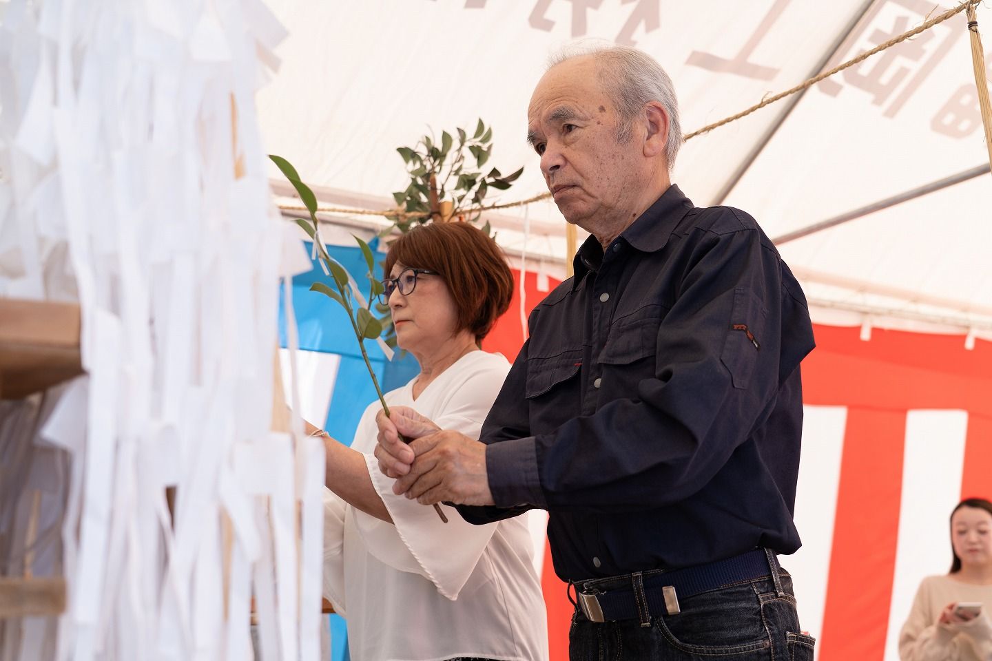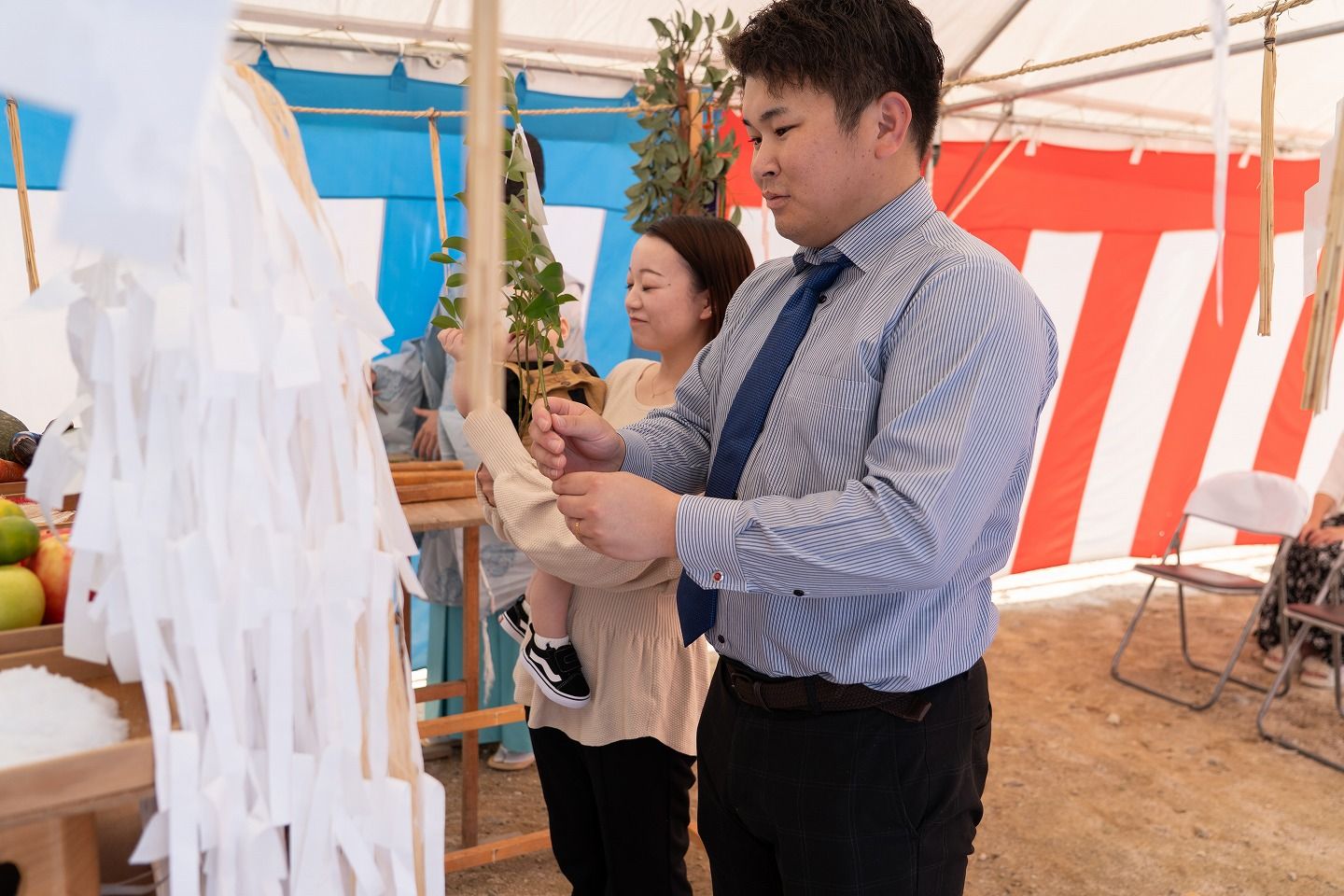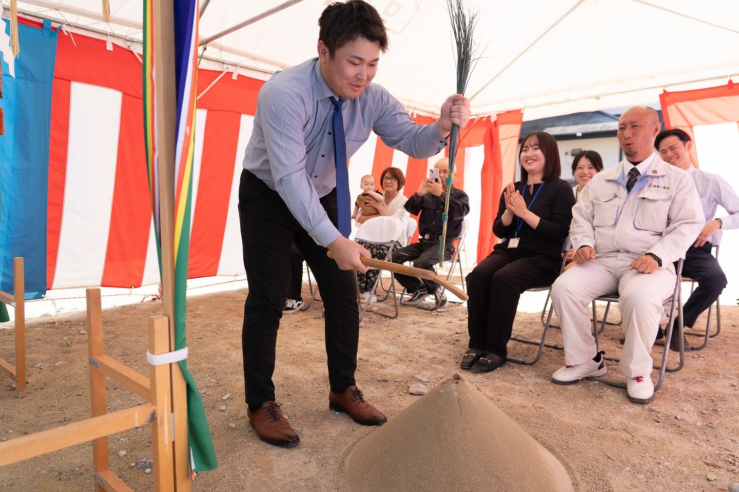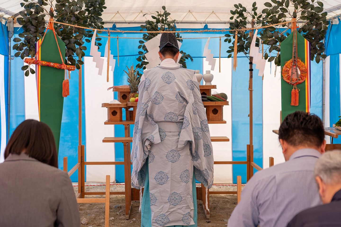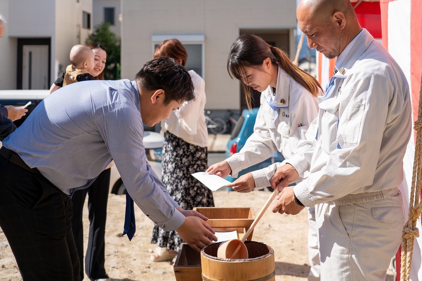 トップページ > 建築現場 > 春日市16 > 「春日市16」注文住宅現場リポート①【地鎮祭】 「春日市16」注文住宅現場リポート①【地鎮祭】 2025.10.23掲載 こんにちは。リポート担当の有村です。10月23日(木)晴れ。本日は、福岡県春日市にて地鎮祭を執り行いました。さっそくリポートしていきましょう!▼お施主様ご一家がご到着されました。まずは水でお清めを行っていただきます。▼祭事前、神主さんから地鎮祭での作法について説明があります。初めての地鎮祭という方がほとんどだと思いますが、ご安心ください!▼一通り説明が終わった後、「修祓の儀(しゅばつのぎ)」から地鎮祭が始まります。▼まずは「大幣(おおぬさ)」を振り、参列者全員のお祓いを行います。▼続いて神様をお招きする「降神の儀(こうしんのぎ)」、神様に祭祀の意義や目的を申し上げる「祝詞奏上(のりとそうじょう)」と進んでいきます。▼祝詞奏上の次は、敷地の四方をお神酒やお塩でお祓いする「四方祓いの儀(しほうはらいのぎ)」を行います。▼続いて、地鎮行事の一つである「刈初の儀(かりそめのぎ)」を行いました。大地に生えている草を刈り取り、これから家を建てると神様にお披露目する儀式となります。▼次に、土を耕し整地する意味がある「鍬入れの儀(くわいれのぎ)」を行いました。▼施工会社がしっかりとした丈夫な家を建てるという意味がある「杭打ちの儀(くいうちのぎ)」を行いました。▼次に「玉串奉奠(たまぐしほうてん)」を行いました。玉串奉奠は、工事の無事やご家族の健康など、様々な思いを玉串に乗せて、御神前に捧げる儀式となります。▼最後は「昇神の儀(しょうしんのぎ)」にて、お呼びした神様にお帰りいただきます。ご神前に深く一礼をし、これで地鎮行事は終了となります。▼地鎮祭が無事に終了し、工事安全・家内安全を祈って、全員で乾杯です。▼神主さんより、「鎮物」と「上棟札」のお渡しと説明がありました。▼本日の地鎮祭、誠におめでとうございます。これから始まる念願の家づくり、ぜひお楽しみください!▼本日のおまけ皆に大人気のお子様です!かわいいですねぇ~! もっと福岡工務店を知りたい方