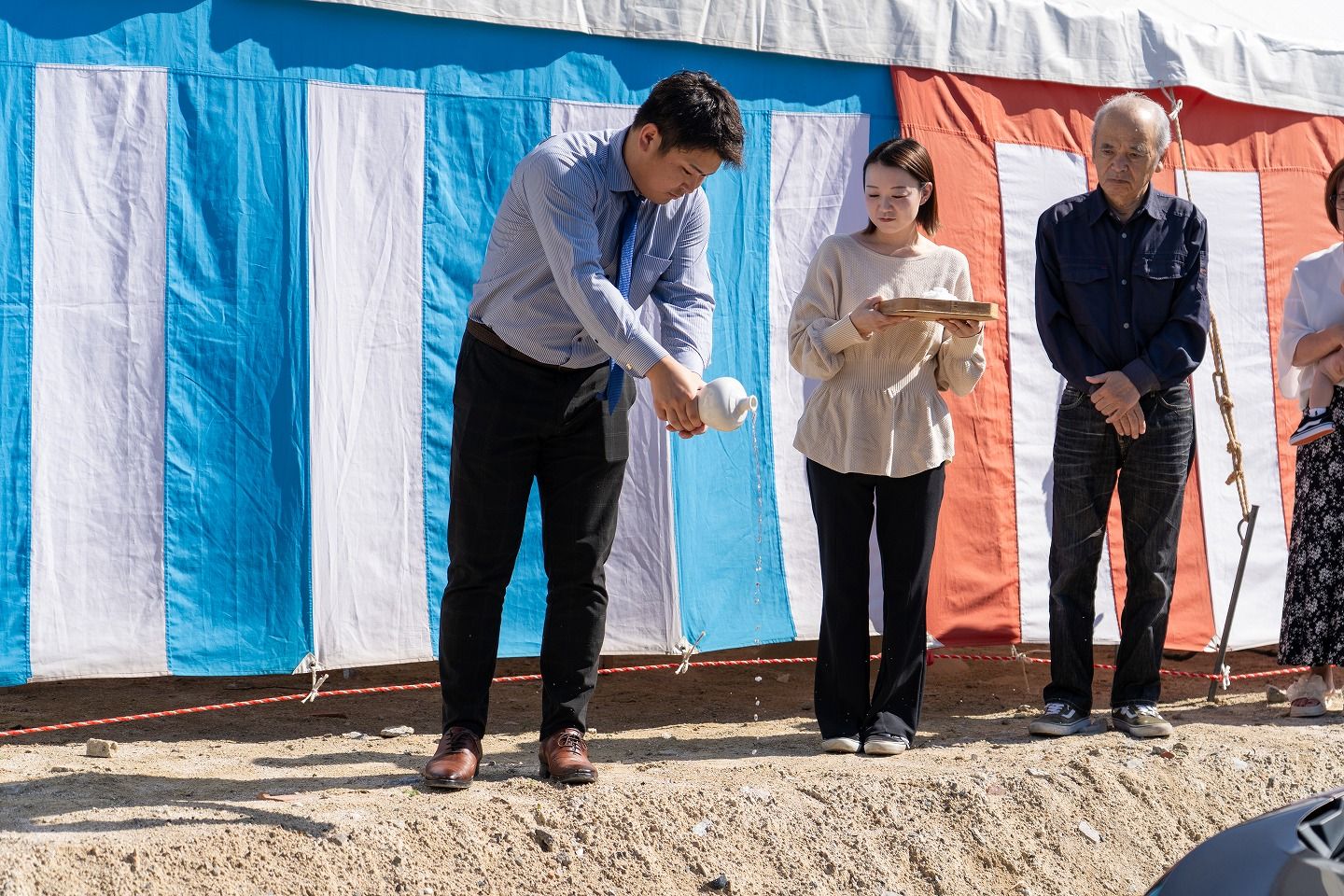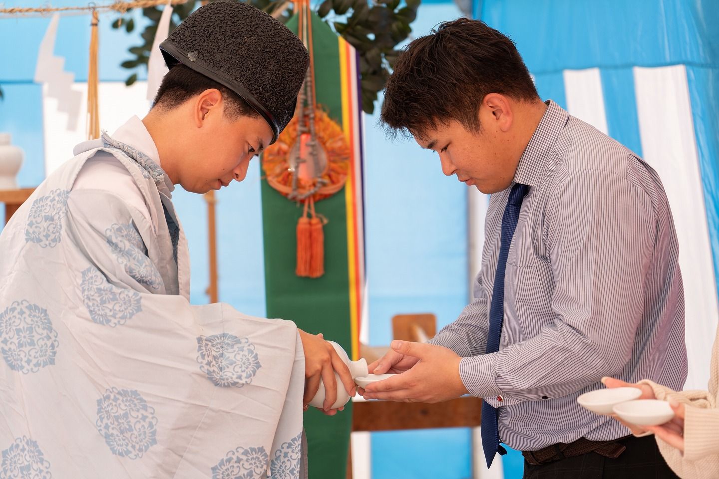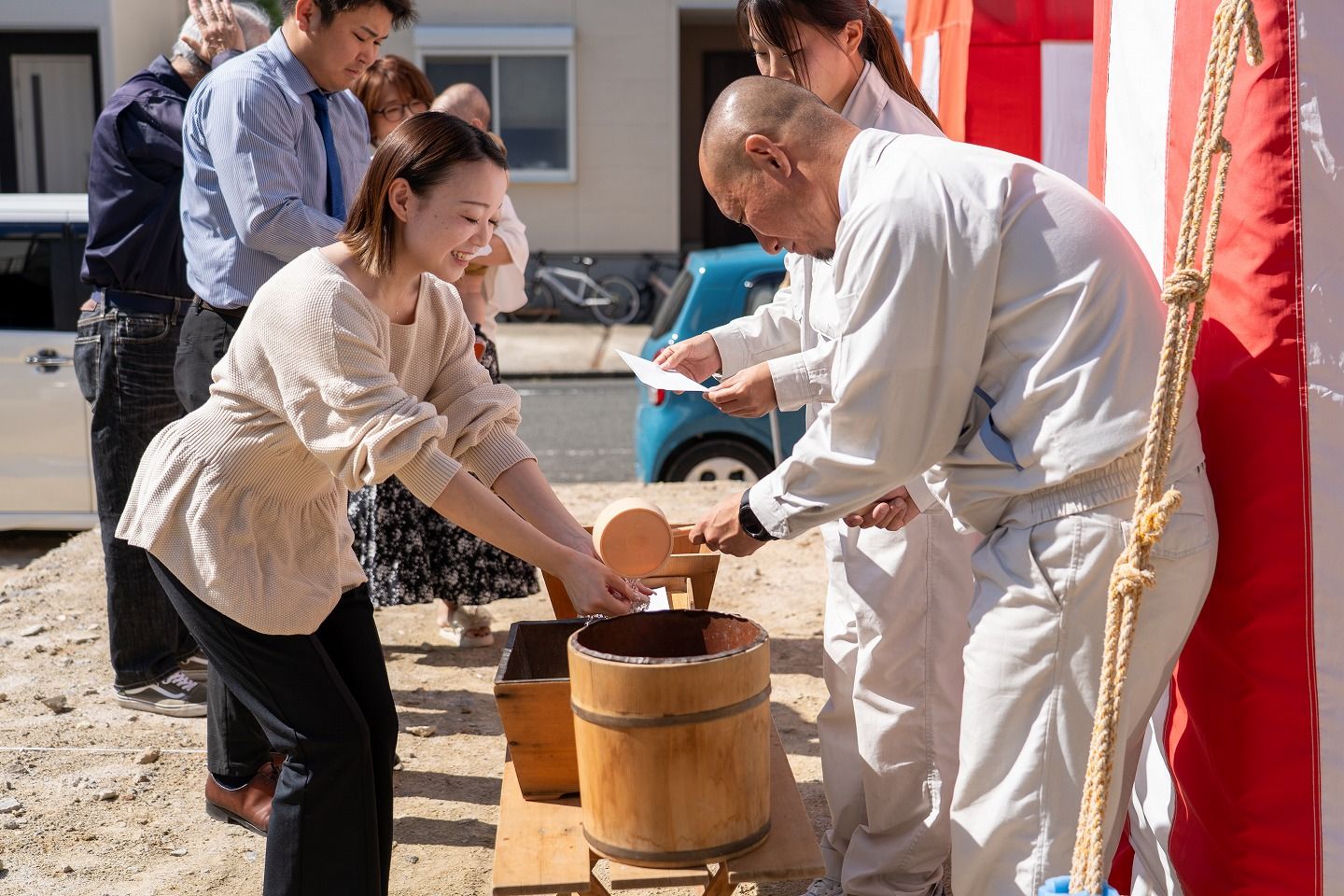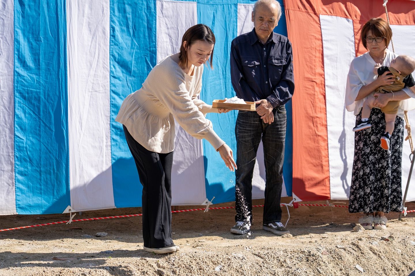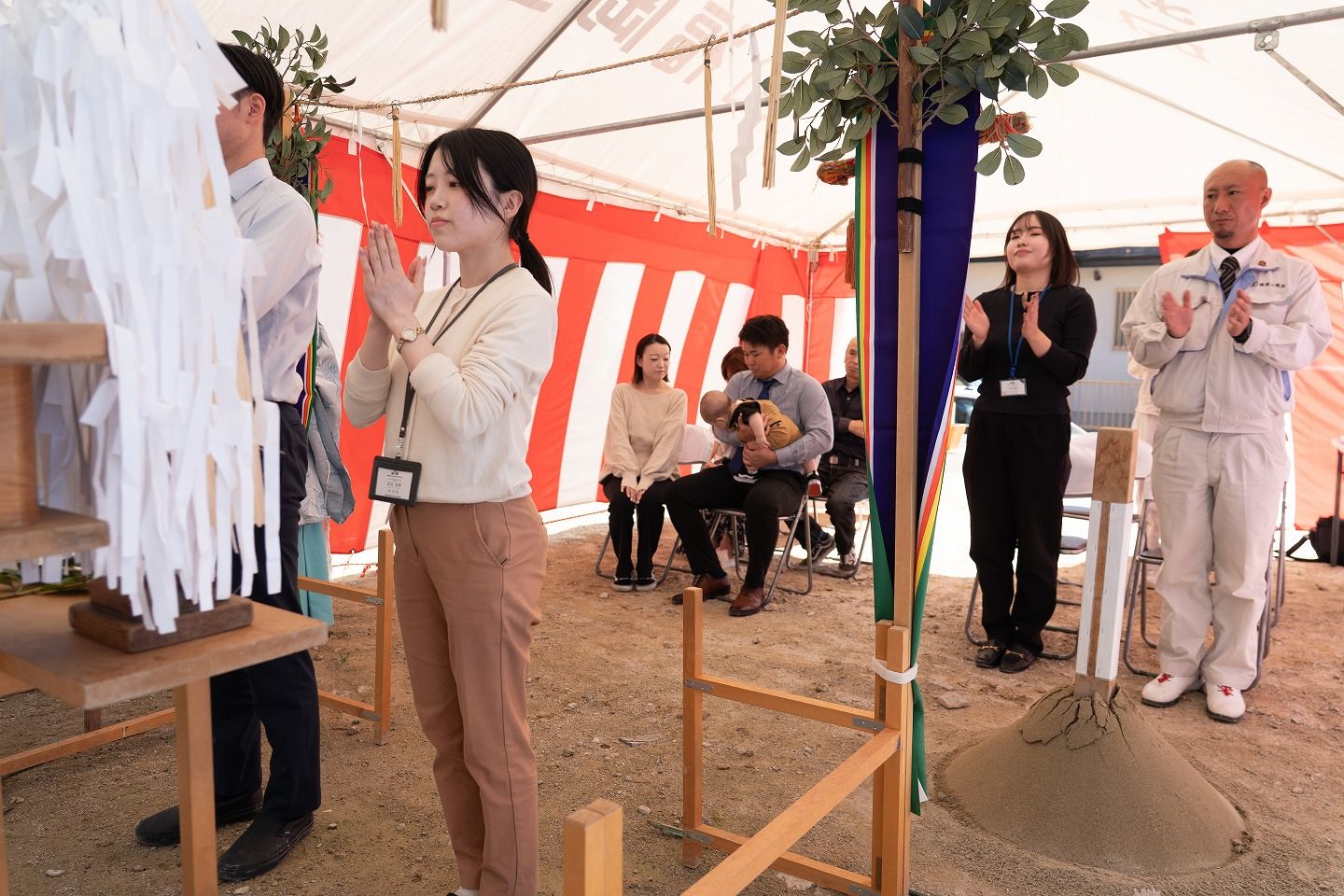 トップページ > 建築現場 > 春日市16 > 「春日市16」注文住宅現場リポート①【地鎮祭】 「春日市16」注文住宅現場リポート①【地鎮祭】 2025.10.23掲載 こんにちは。リポート担当の有村です。10月23日(木)晴れ。本日は、福岡県春日市にて地鎮祭を執り行いました。さっそくリポートしていきましょう!▼お施主様ご一家がご到着されました。まずは水でお清めを行っていただきます。▼祭事前、神主さんから地鎮祭での作法について説明があります。初めての地鎮祭という方がほとんどだと思いますが、ご安心ください!▼一通り説明が終わった後、「修祓の儀(しゅばつのぎ)」から地鎮祭が始まります。▼まずは「大幣(おおぬさ)」を振り、参列者全員のお祓いを行います。▼続いて神様をお招きする「降神の儀(こうしんのぎ)」、神様に祭祀の意義や目的を申し上げる「祝詞奏上(のりとそうじょう)」と進んでいきます。▼祝詞奏上の次は、敷地の四方をお神酒やお塩でお祓いする「四方祓いの儀(しほうはらいのぎ)」を行います。▼続いて、地鎮行事の一つである「刈初の儀(かりそめのぎ)」を行いました。大地に生えている草を刈り取り、これから家を建てると神様にお披露目する儀式となります。▼次に、土を耕し整地する意味がある「鍬入れの儀(くわいれのぎ)」を行いました。▼施工会社がしっかりとした丈夫な家を建てるという意味がある「杭打ちの儀(くいうちのぎ)」を行いました。▼次に「玉串奉奠(たまぐしほうてん)」を行いました。玉串奉奠は、工事の無事やご家族の健康など、様々な思いを玉串に乗せて、御神前に捧げる儀式となります。▼最後は「昇神の儀(しょうしんのぎ)」にて、お呼びした神様にお帰りいただきます。ご神前に深く一礼をし、これで地鎮行事は終了となります。▼地鎮祭が無事に終了し、工事安全・家内安全を祈って、全員で乾杯です。▼神主さんより、「鎮物」と「上棟札」のお渡しと説明がありました。▼本日の地鎮祭、誠におめでとうございます。これから始まる念願の家づくり、ぜひお楽しみください!▼本日のおまけ皆に大人気のお子様です!かわいいですねぇ~! もっと福岡工務店を知りたい方