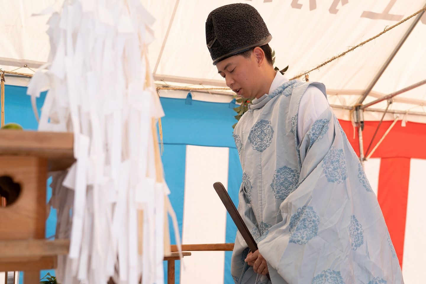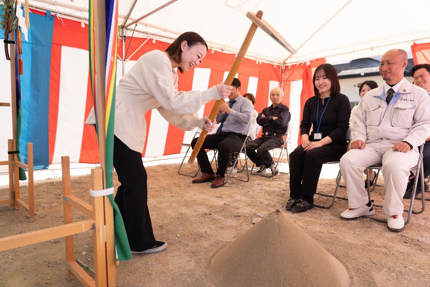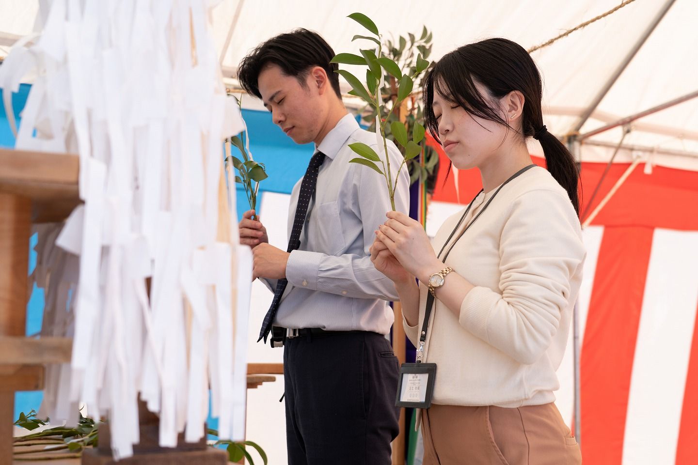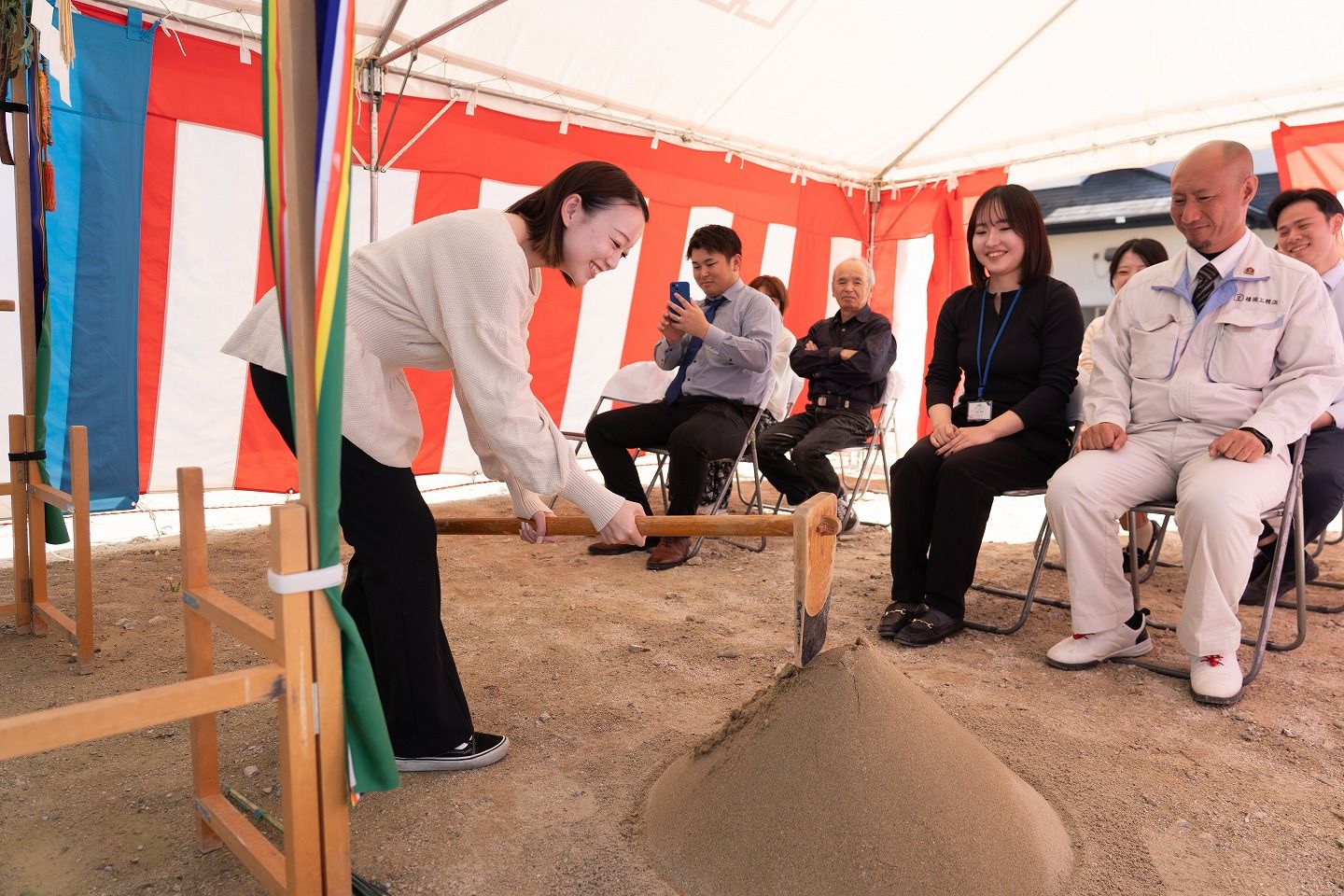 トップページ > 建築現場 > 春日市16 > 「春日市16」注文住宅現場リポート①【地鎮祭】 「春日市16」注文住宅現場リポート①【地鎮祭】 2025.10.23掲載 こんにちは。リポート担当の有村です。10月23日(木)晴れ。本日は、福岡県春日市にて地鎮祭を執り行いました。さっそくリポートしていきましょう!▼お施主様ご一家がご到着されました。まずは水でお清めを行っていただきます。▼祭事前、神主さんから地鎮祭での作法について説明があります。初めての地鎮祭という方がほとんどだと思いますが、ご安心ください!▼一通り説明が終わった後、「修祓の儀(しゅばつのぎ)」から地鎮祭が始まります。▼まずは「大幣(おおぬさ)」を振り、参列者全員のお祓いを行います。▼続いて神様をお招きする「降神の儀(こうしんのぎ)」、神様に祭祀の意義や目的を申し上げる「祝詞奏上(のりとそうじょう)」と進んでいきます。▼祝詞奏上の次は、敷地の四方をお神酒やお塩でお祓いする「四方祓いの儀(しほうはらいのぎ)」を行います。▼続いて、地鎮行事の一つである「刈初の儀(かりそめのぎ)」を行いました。大地に生えている草を刈り取り、これから家を建てると神様にお披露目する儀式となります。▼次に、土を耕し整地する意味がある「鍬入れの儀(くわいれのぎ)」を行いました。▼施工会社がしっかりとした丈夫な家を建てるという意味がある「杭打ちの儀(くいうちのぎ)」を行いました。▼次に「玉串奉奠(たまぐしほうてん)」を行いました。玉串奉奠は、工事の無事やご家族の健康など、様々な思いを玉串に乗せて、御神前に捧げる儀式となります。▼最後は「昇神の儀(しょうしんのぎ)」にて、お呼びした神様にお帰りいただきます。ご神前に深く一礼をし、これで地鎮行事は終了となります。▼地鎮祭が無事に終了し、工事安全・家内安全を祈って、全員で乾杯です。▼神主さんより、「鎮物」と「上棟札」のお渡しと説明がありました。▼本日の地鎮祭、誠におめでとうございます。これから始まる念願の家づくり、ぜひお楽しみください!▼本日のおまけ皆に大人気のお子様です!かわいいですねぇ~! もっと福岡工務店を知りたい方