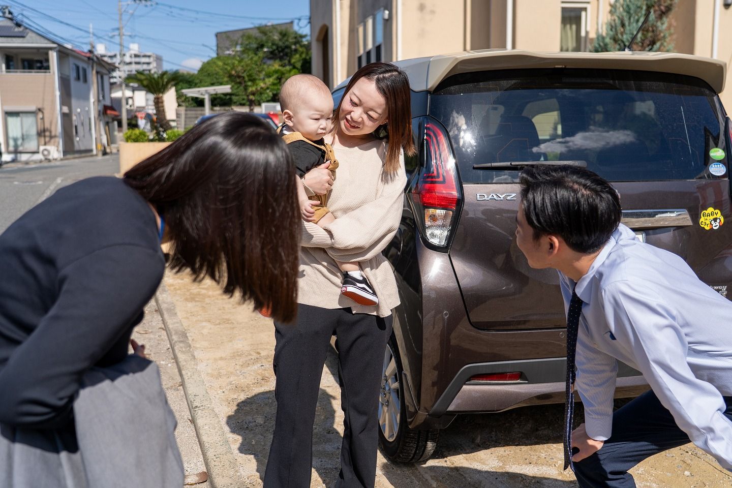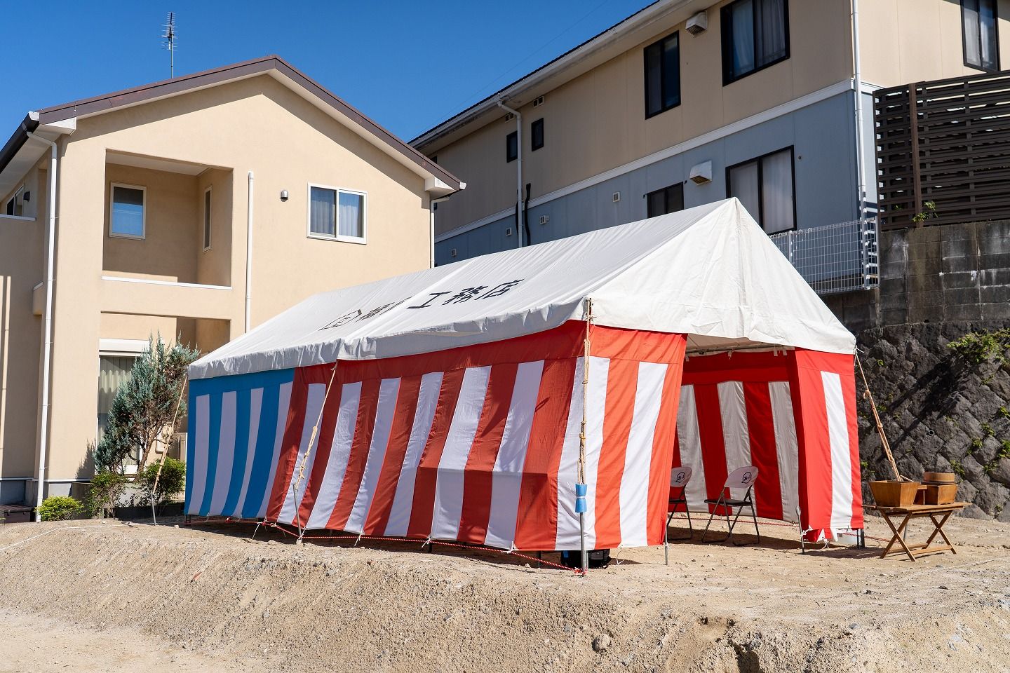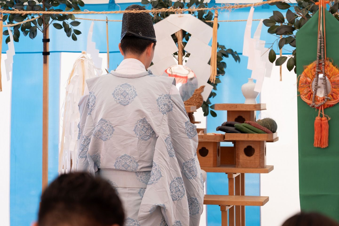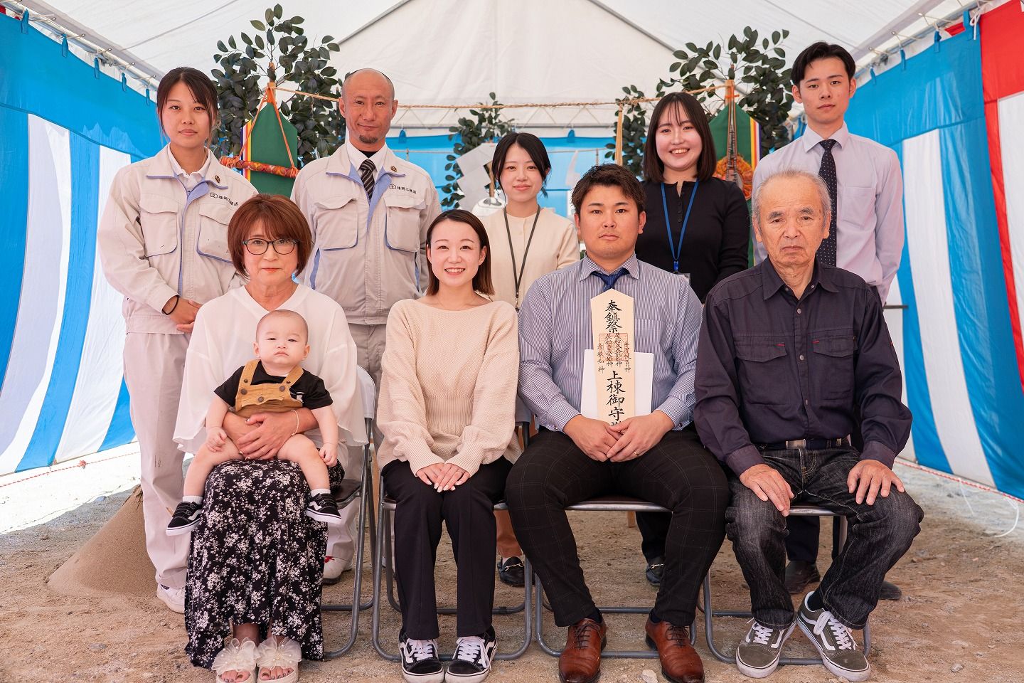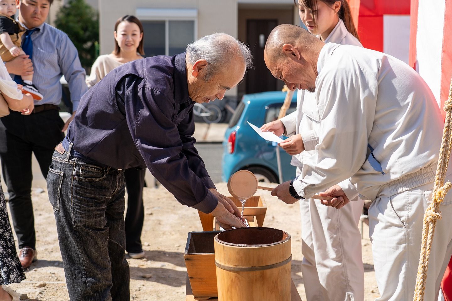 トップページ > 建築現場 > 春日市16 > 「春日市16」注文住宅現場リポート①【地鎮祭】 「春日市16」注文住宅現場リポート①【地鎮祭】 2025.10.23掲載 こんにちは。リポート担当の有村です。10月23日(木)晴れ。本日は、福岡県春日市にて地鎮祭を執り行いました。さっそくリポートしていきましょう!▼お施主様ご一家がご到着されました。まずは水でお清めを行っていただきます。▼祭事前、神主さんから地鎮祭での作法について説明があります。初めての地鎮祭という方がほとんどだと思いますが、ご安心ください!▼一通り説明が終わった後、「修祓の儀(しゅばつのぎ)」から地鎮祭が始まります。▼まずは「大幣(おおぬさ)」を振り、参列者全員のお祓いを行います。▼続いて神様をお招きする「降神の儀(こうしんのぎ)」、神様に祭祀の意義や目的を申し上げる「祝詞奏上(のりとそうじょう)」と進んでいきます。▼祝詞奏上の次は、敷地の四方をお神酒やお塩でお祓いする「四方祓いの儀(しほうはらいのぎ)」を行います。▼続いて、地鎮行事の一つである「刈初の儀(かりそめのぎ)」を行いました。大地に生えている草を刈り取り、これから家を建てると神様にお披露目する儀式となります。▼次に、土を耕し整地する意味がある「鍬入れの儀(くわいれのぎ)」を行いました。▼施工会社がしっかりとした丈夫な家を建てるという意味がある「杭打ちの儀(くいうちのぎ)」を行いました。▼次に「玉串奉奠(たまぐしほうてん)」を行いました。玉串奉奠は、工事の無事やご家族の健康など、様々な思いを玉串に乗せて、御神前に捧げる儀式となります。▼最後は「昇神の儀(しょうしんのぎ)」にて、お呼びした神様にお帰りいただきます。ご神前に深く一礼をし、これで地鎮行事は終了となります。▼地鎮祭が無事に終了し、工事安全・家内安全を祈って、全員で乾杯です。▼神主さんより、「鎮物」と「上棟札」のお渡しと説明がありました。▼本日の地鎮祭、誠におめでとうございます。これから始まる念願の家づくり、ぜひお楽しみください!▼本日のおまけ皆に大人気のお子様です!かわいいですねぇ~! もっと福岡工務店を知りたい方