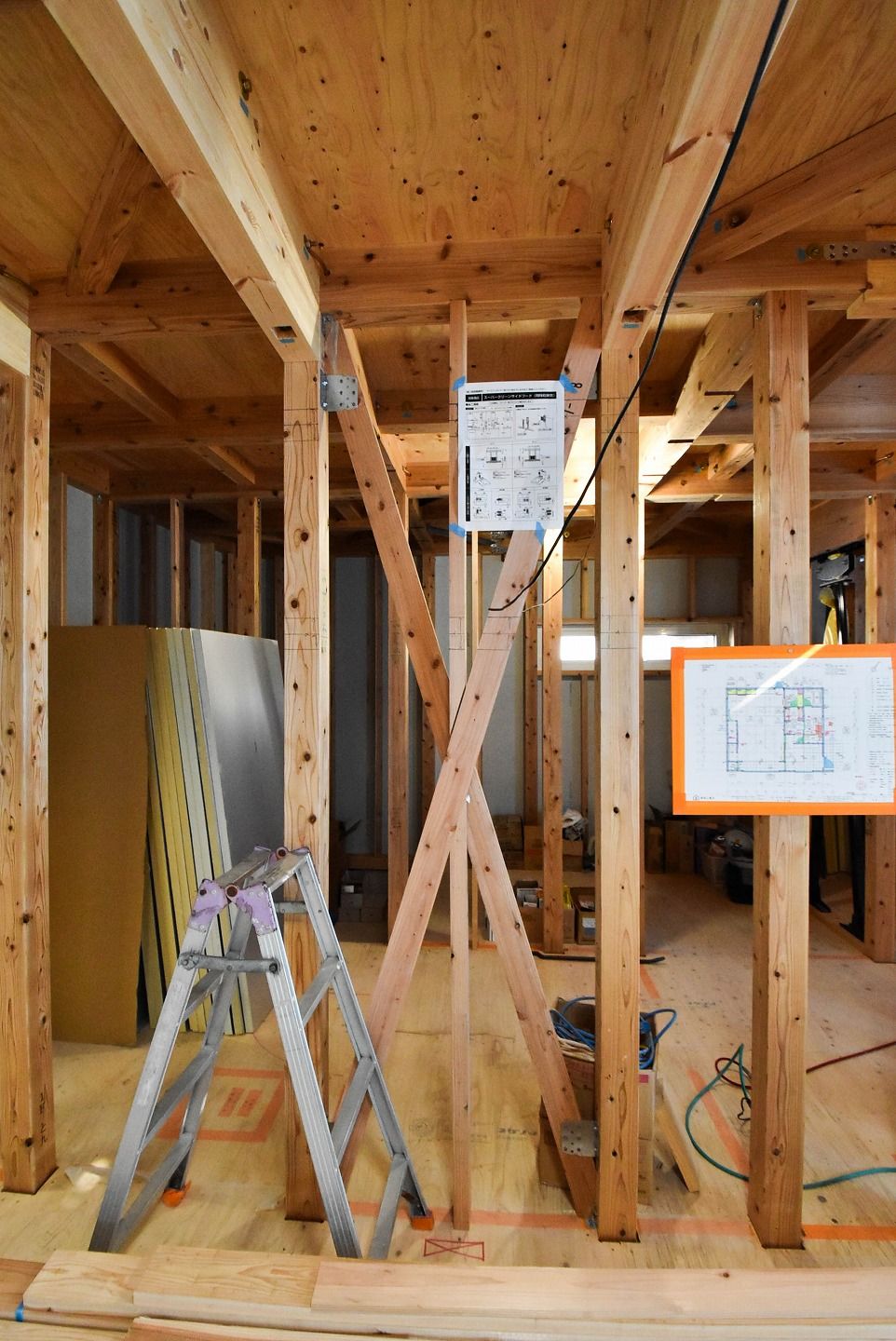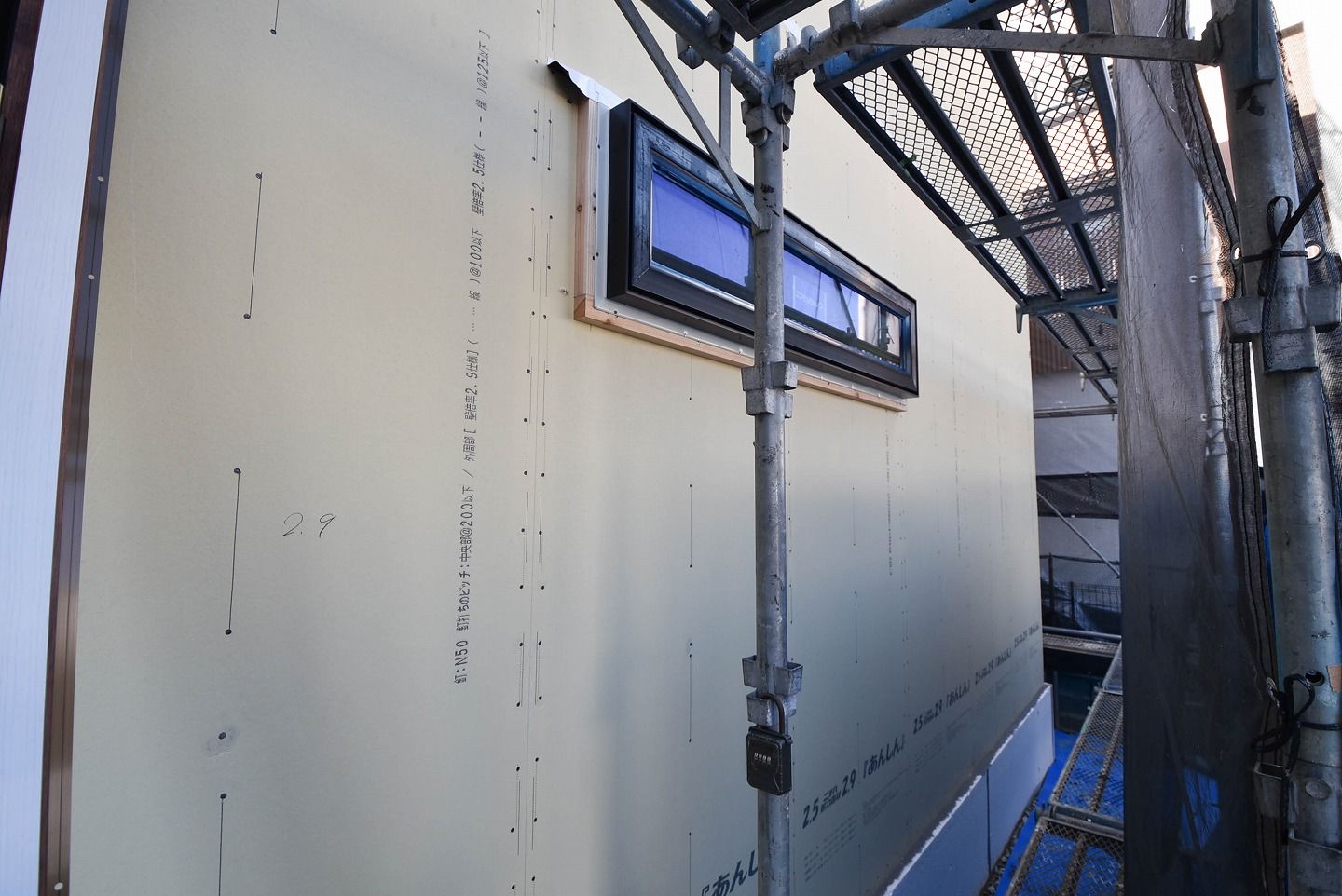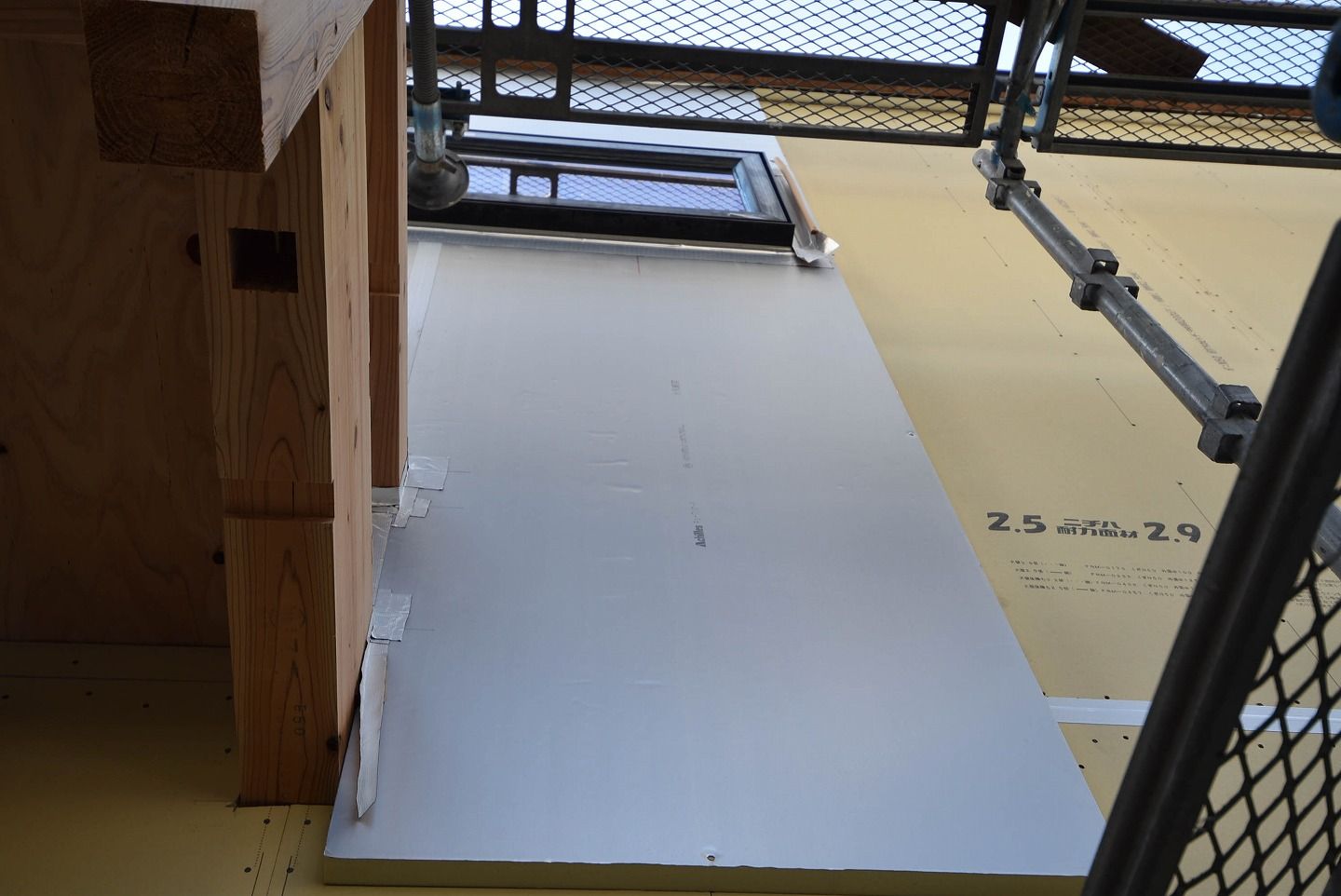 ▼外部は、耐力面材あんしんの上に一部外断熱材キューワンボードの取り付けが行われています😊