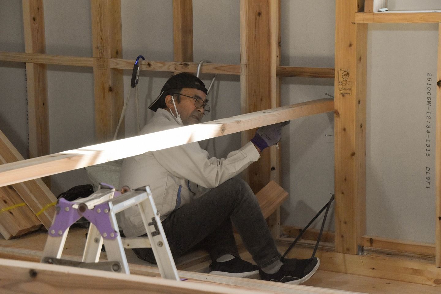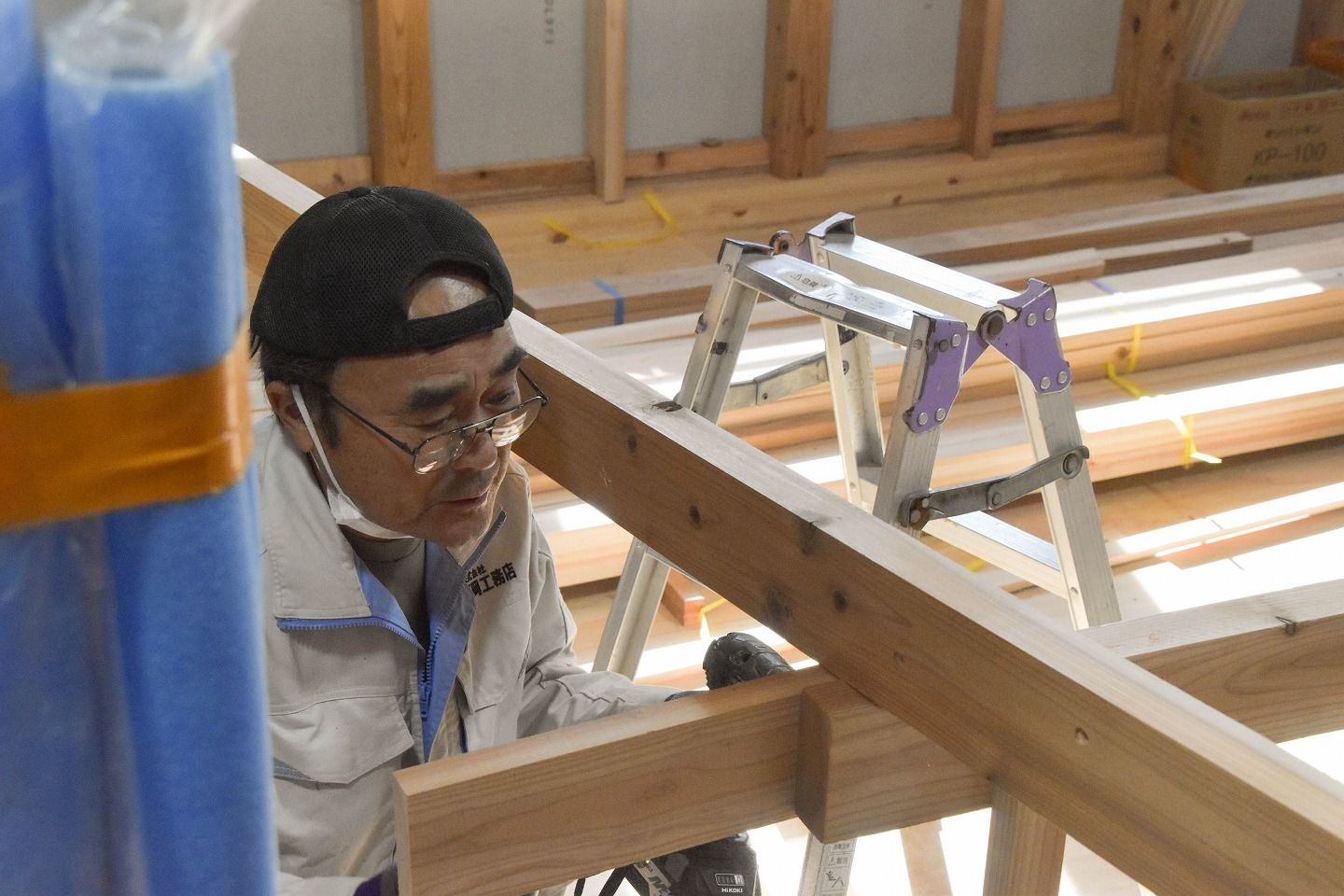 ▼棟梁土崎大工の父 細かい作業も丁寧に行っています。
