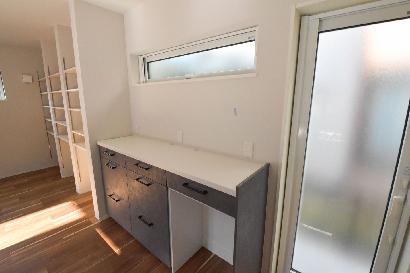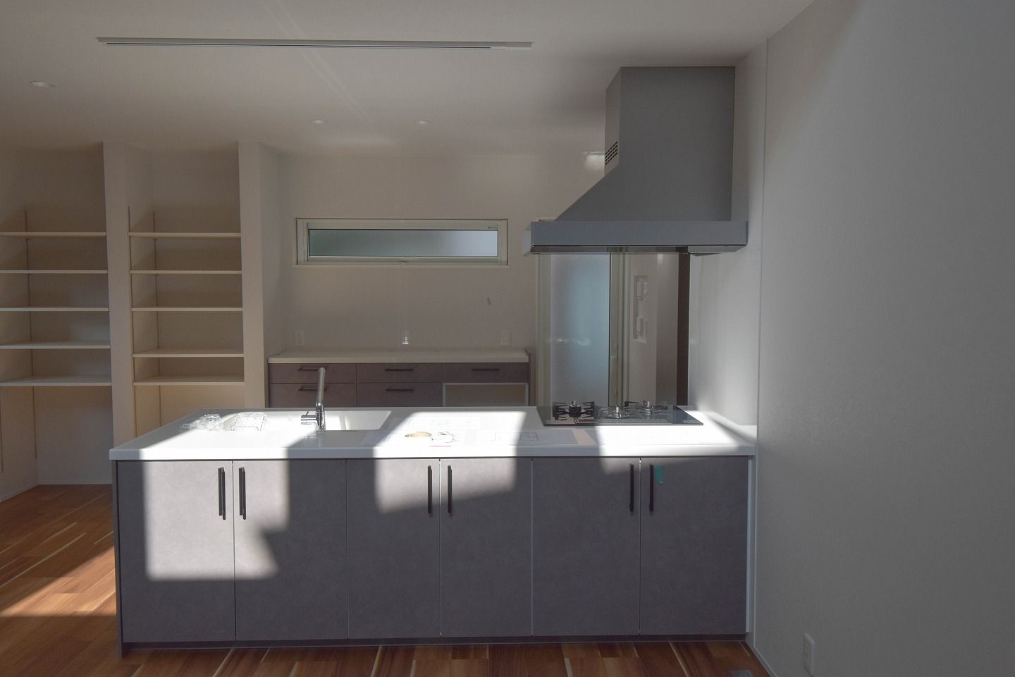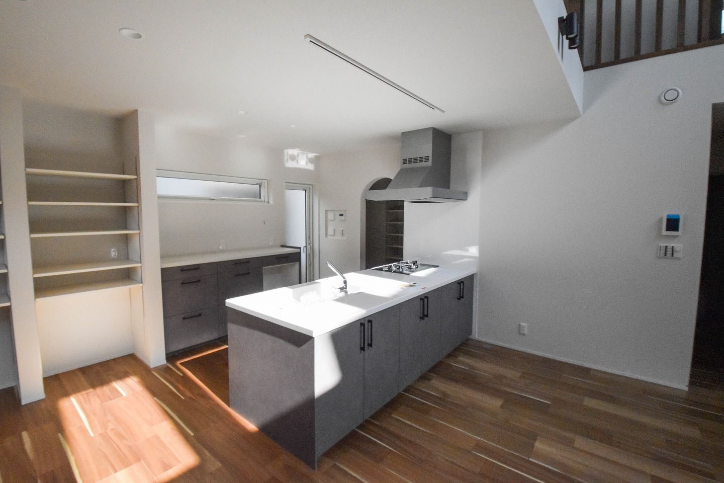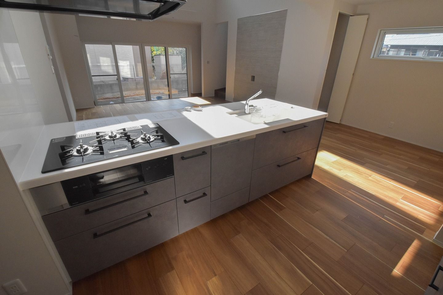 ▼清潔感のあるホワイトの中に、アクセントのグレーが映えるスタイリッシュな空間。お料理中も、縦長窓から降り注ぐ柔らかな光をたっぷり感じられる、開放感あふれるキッチン