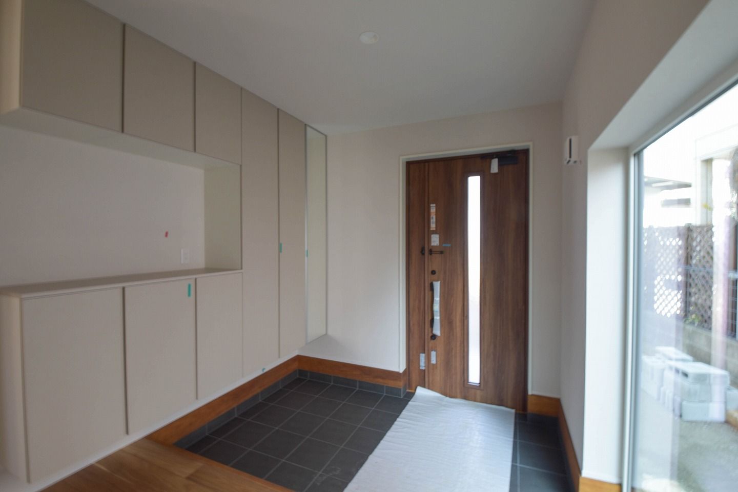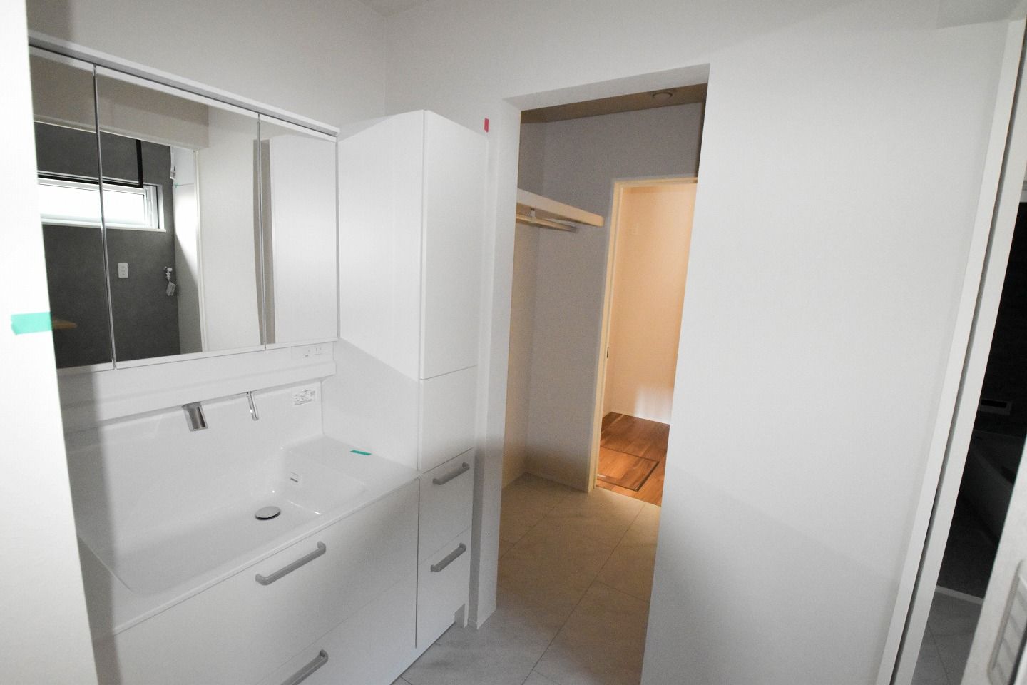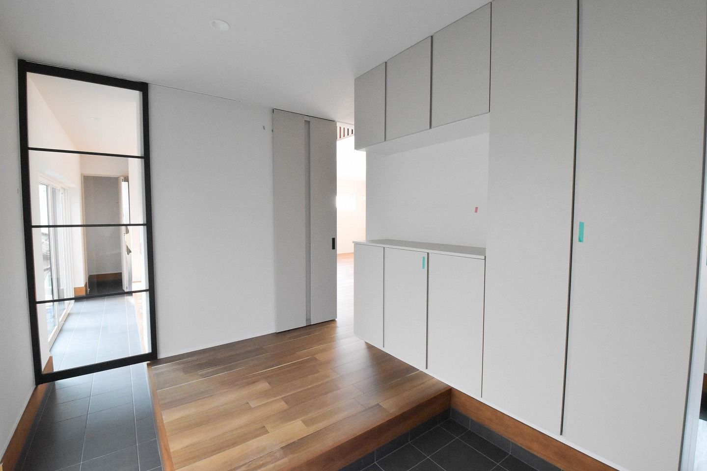 ▼続いては玄関部分です。玄関には、家族全員の靴をすっきりと収める大容量のシューズボックスを。扉に備え付けた大きな鏡が、お出かけ前のひとときをスマートに支え、暮らしに心地よいリズムを届けてくれます。