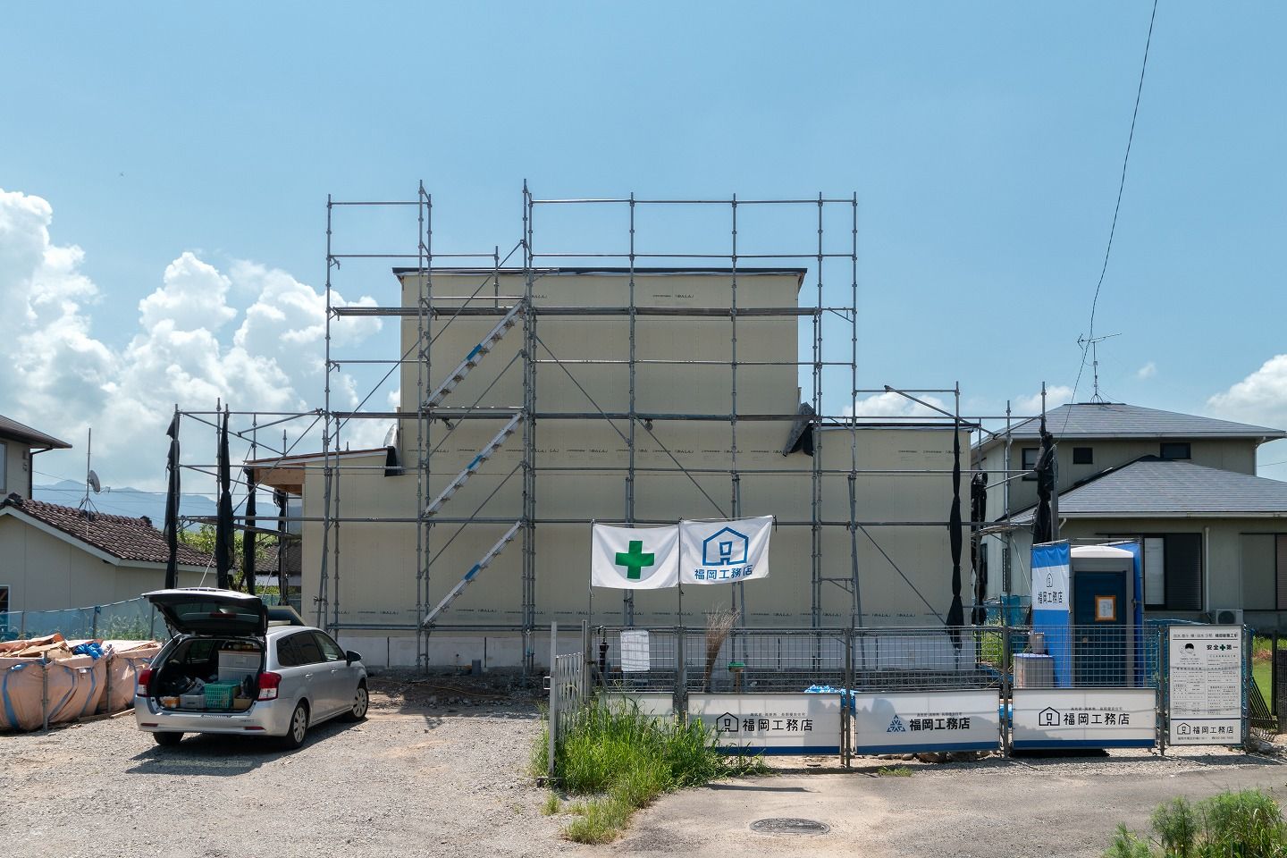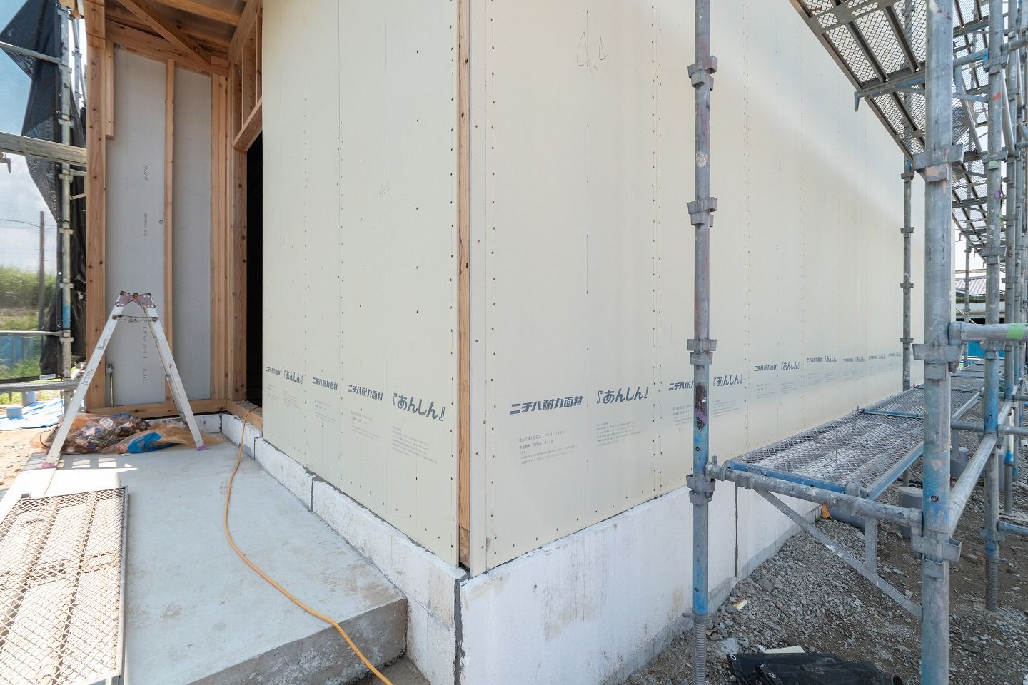 この後、サッシ取り付け、玄関ドア設置と施工が進んでいき、中間検査を迎えます。