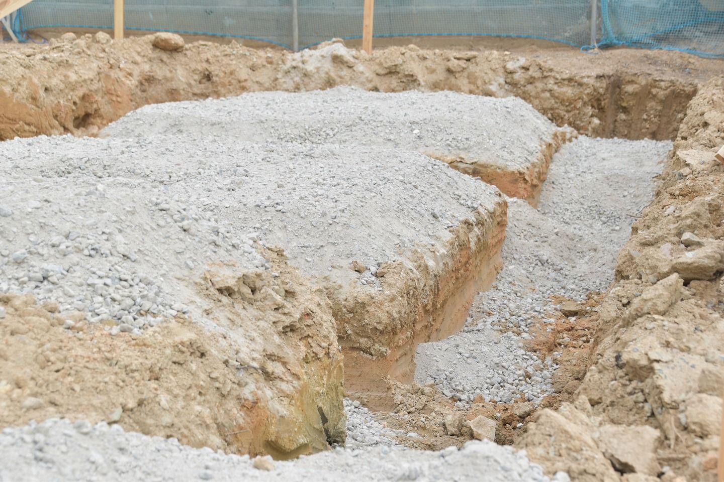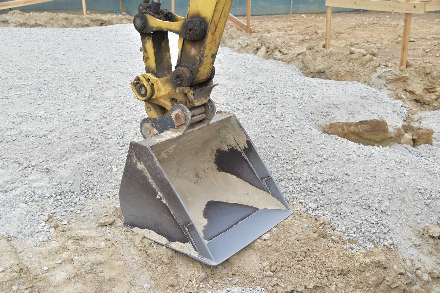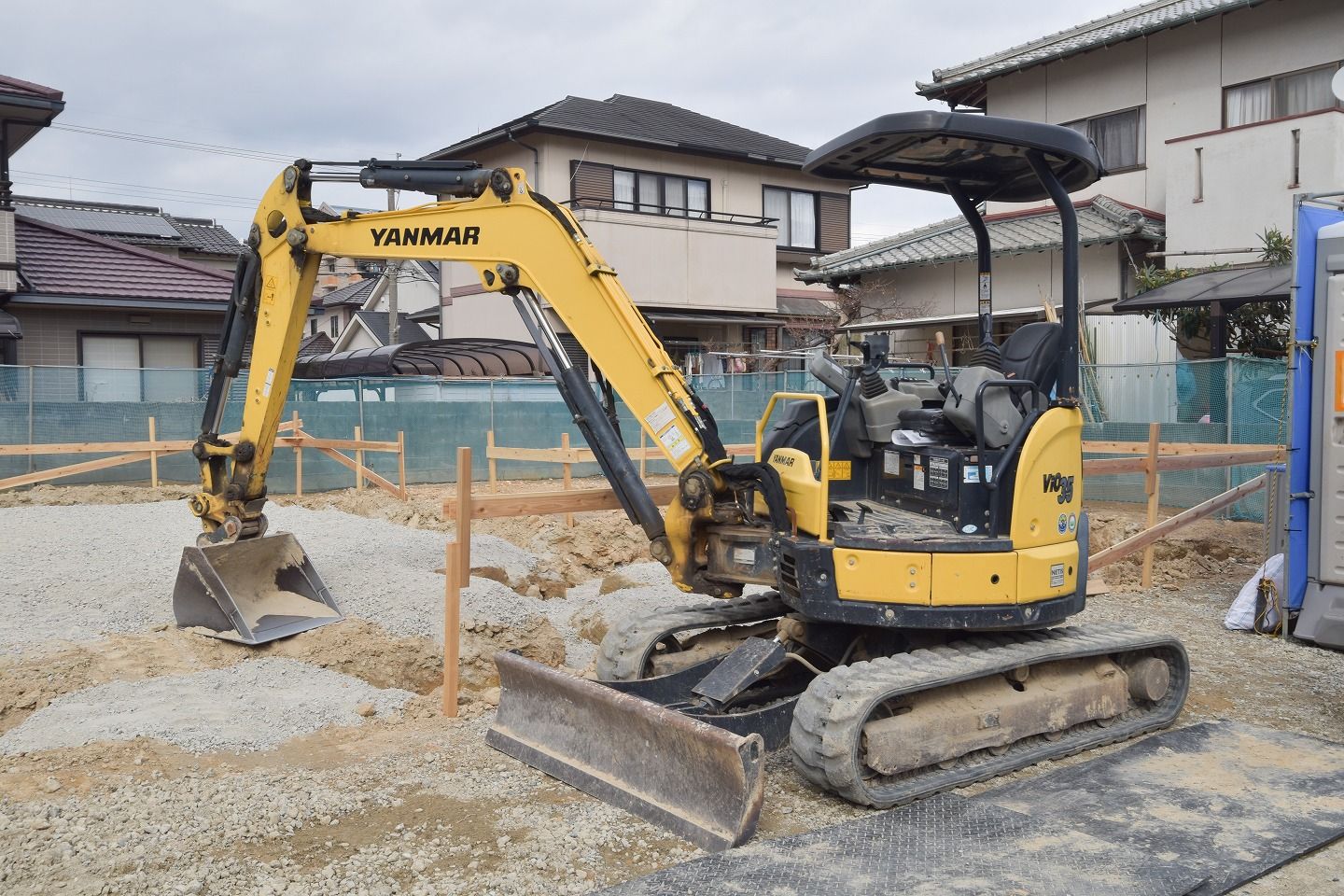 ▼遣り方の次に、現在ショベルカーによって行われている作業が、「根切(ねぎり)」と「砕石(さいせき)」です。根切とは図面で決められた建物の形に合わせて、地面を掘削する作業。深さ・幅を正確に掘っていきます。その後に砕石です。砕石を敷くことにより、地盤は平坦になり、安定が増し、建物の沈下を防ぐ効果があります。