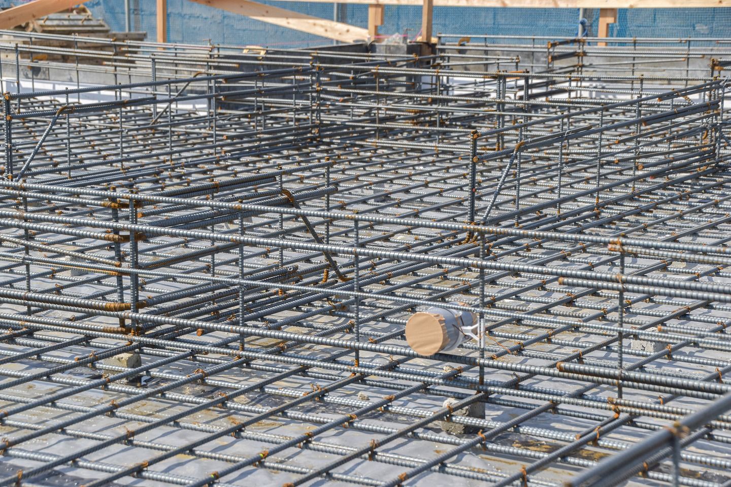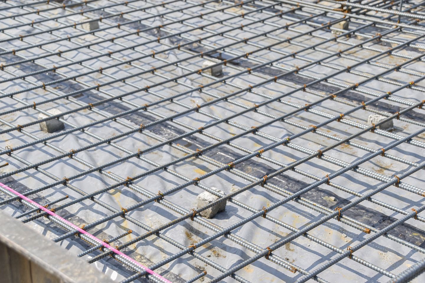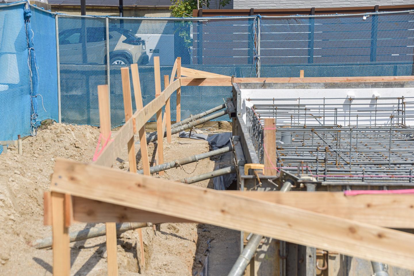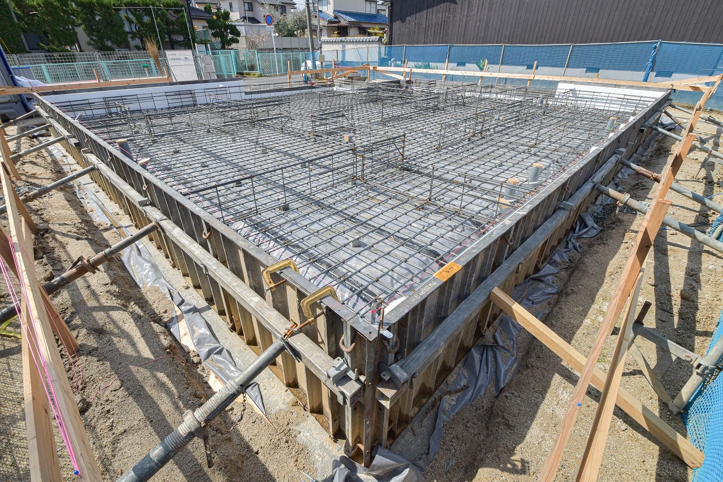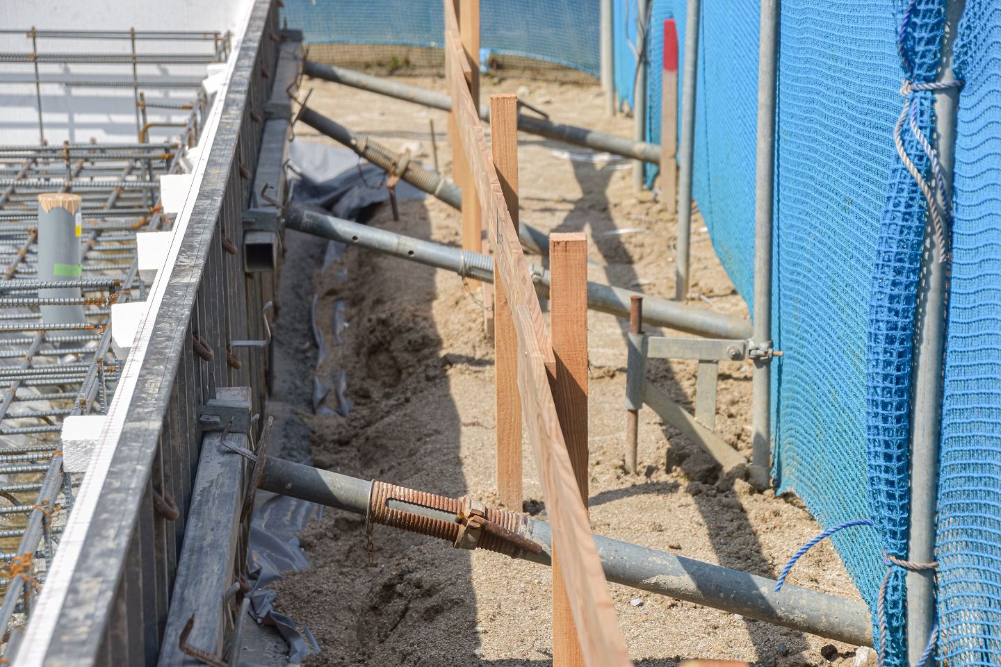 ▼遣り方のさらに内側には「型枠」が施工されています。この後流し込む「立ち上がりコンクリート」の型となるものです。大量のコンクリートがしっかり乾いて固まるまで支える必要があるため、セパレーターやフォームタイ、何本もの単管パイプで頑丈に固定されています。