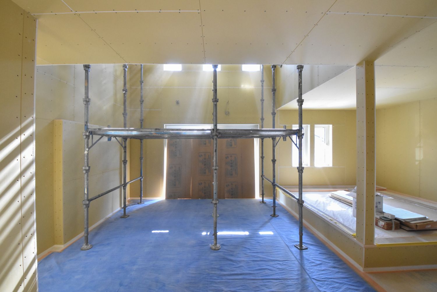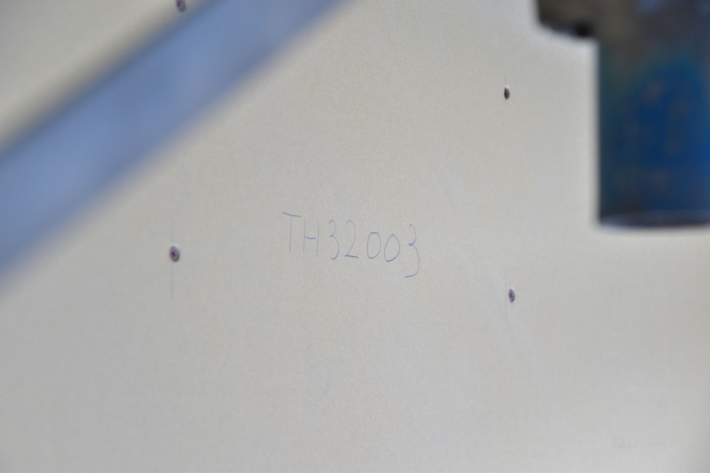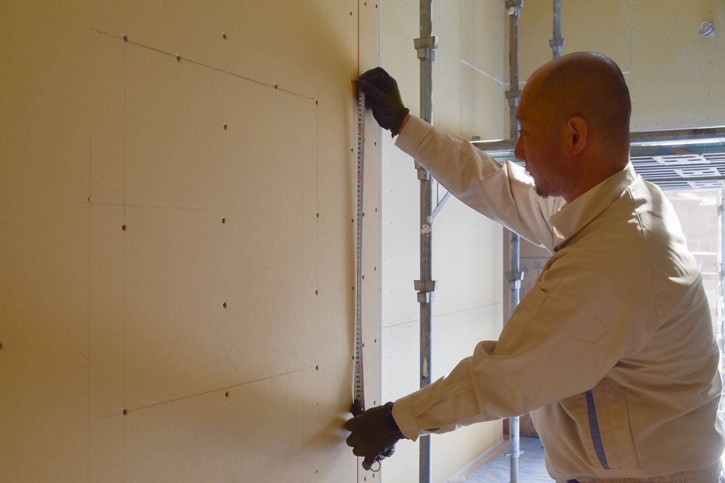 ▼石膏ボードには貼るクロスの品番が記入され、ビスが正しく適切な位置に埋め込まれているかのチェックも行われていました。
