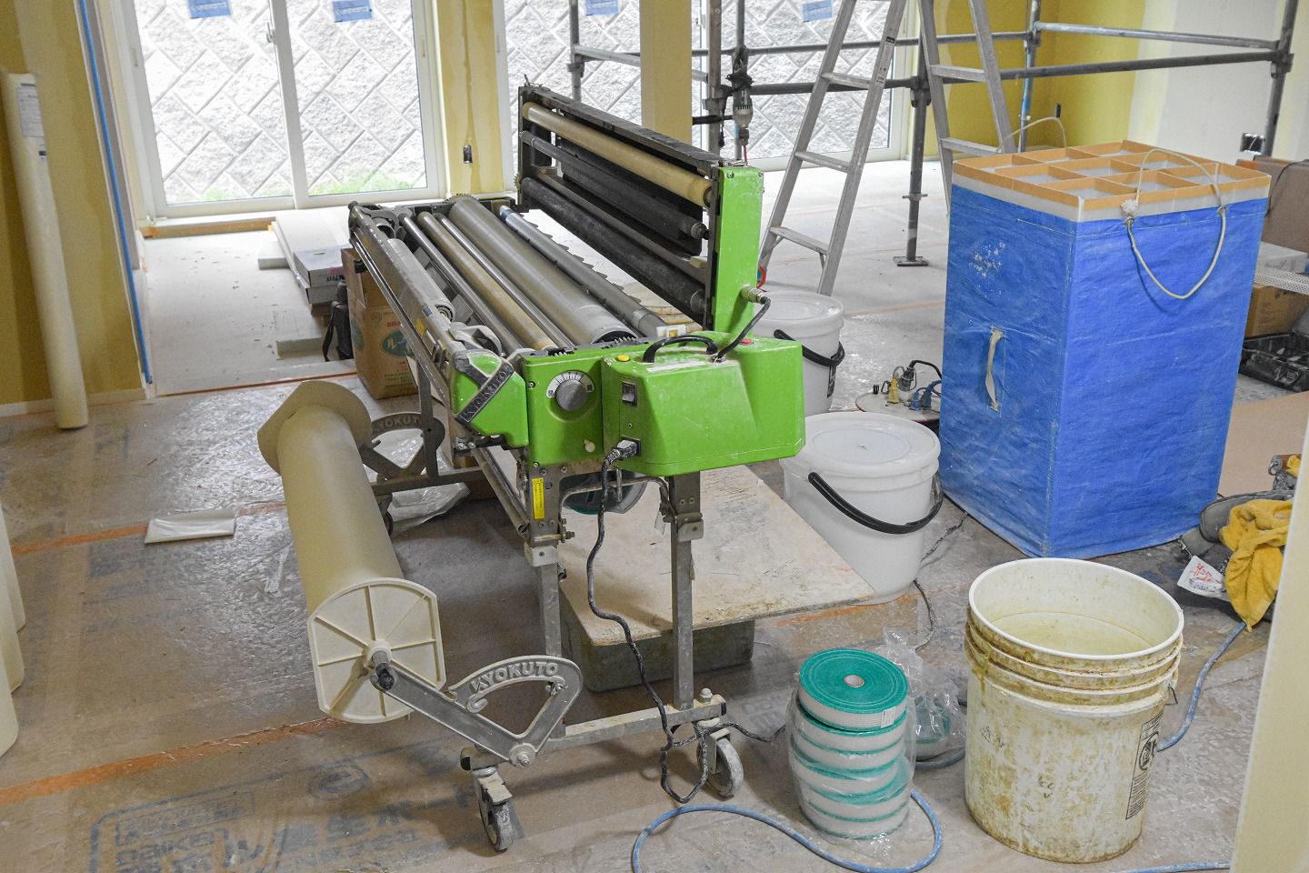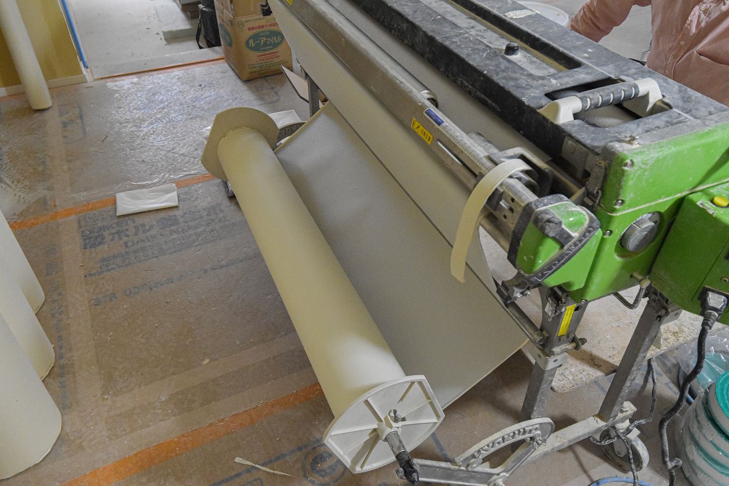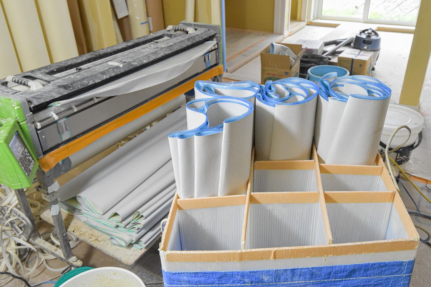 ▼ノリが塗られたクロスはこの入れ物に差し込み、いっぺんに運んで運んでいきます。クロスでまた内装イメージが変わるので、次回リポートに来るのがとっても楽しみです!