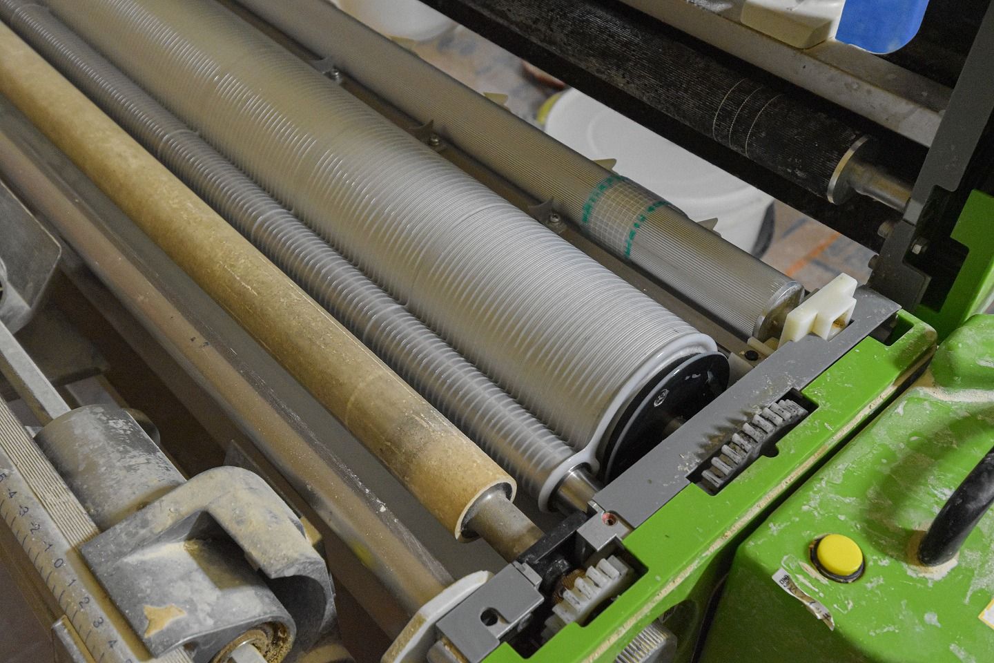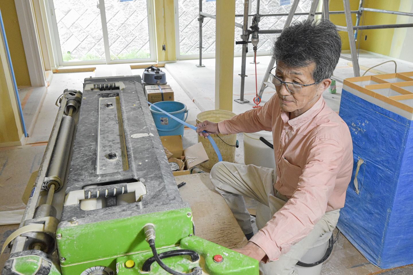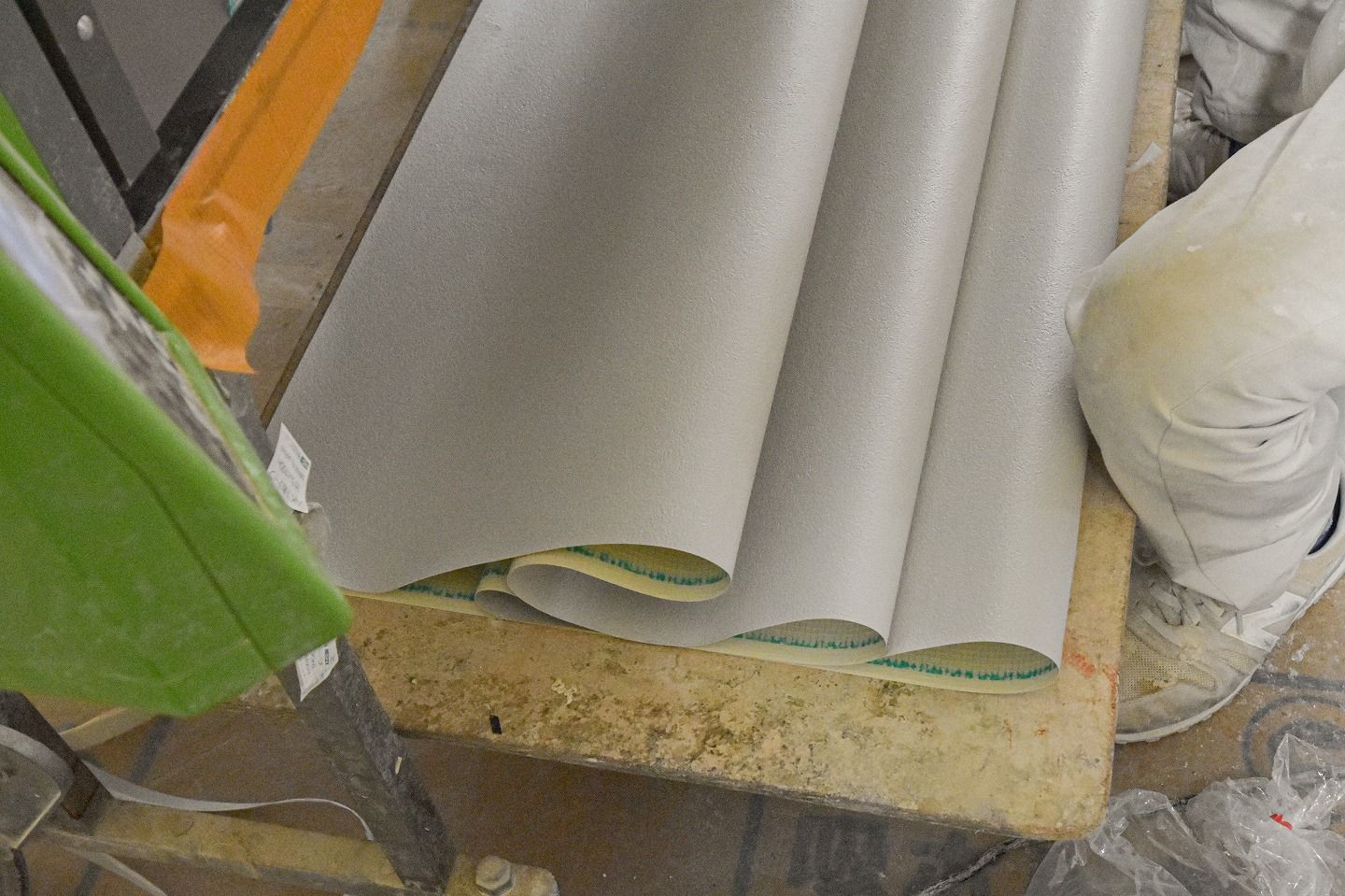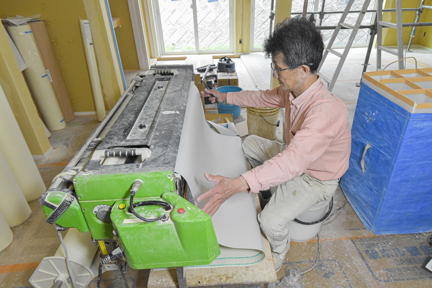 ▼ノリが塗られたクロスはこの入れ物に差し込み、いっぺんに運んで運んでいきます。クロスでまた内装イメージが変わるので、次回リポートに来るのがとっても楽しみです!