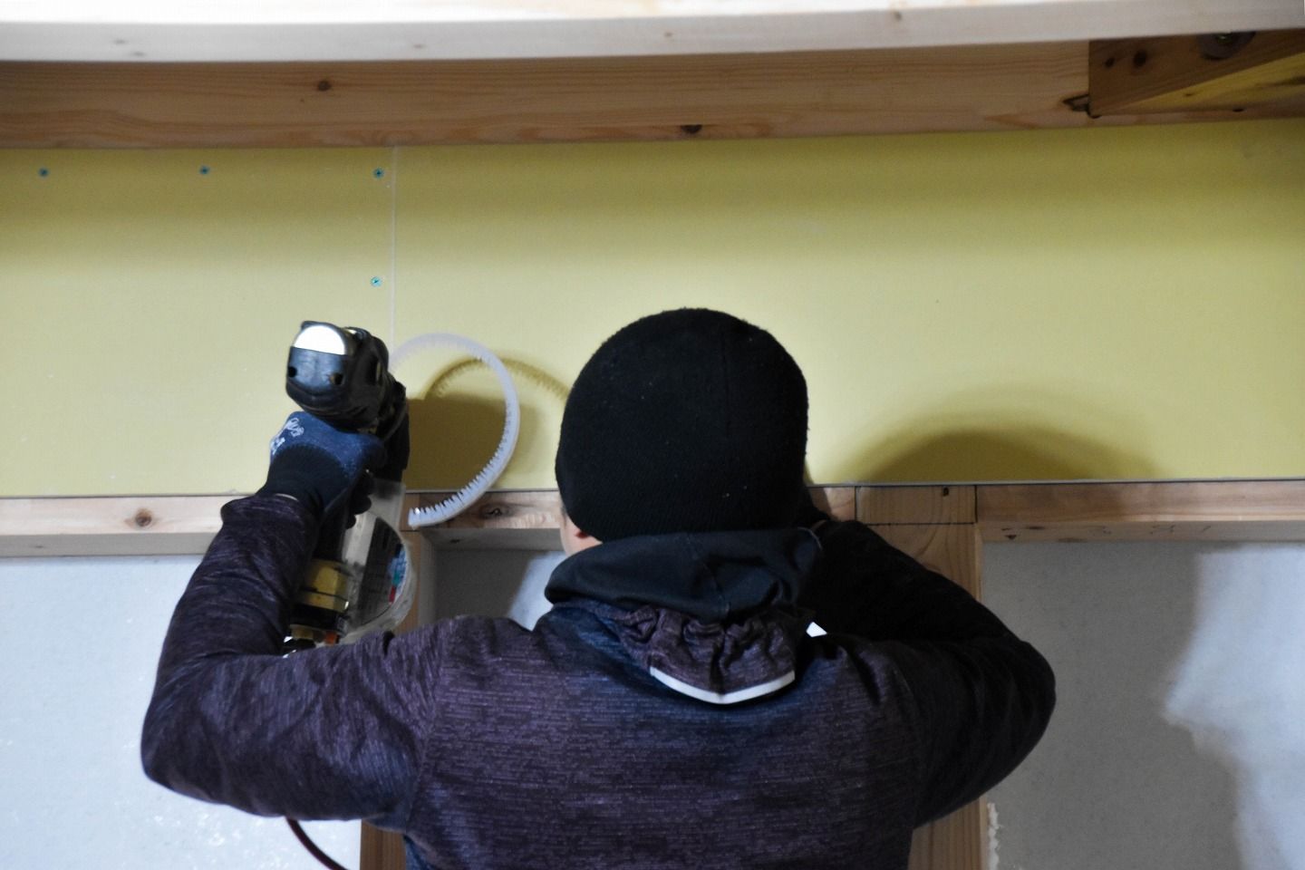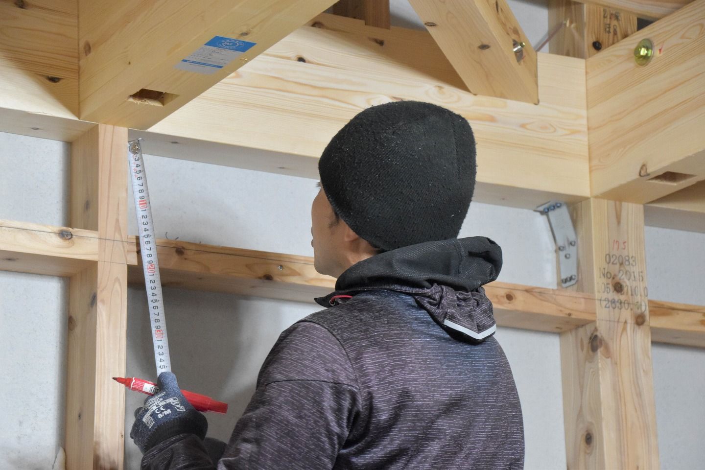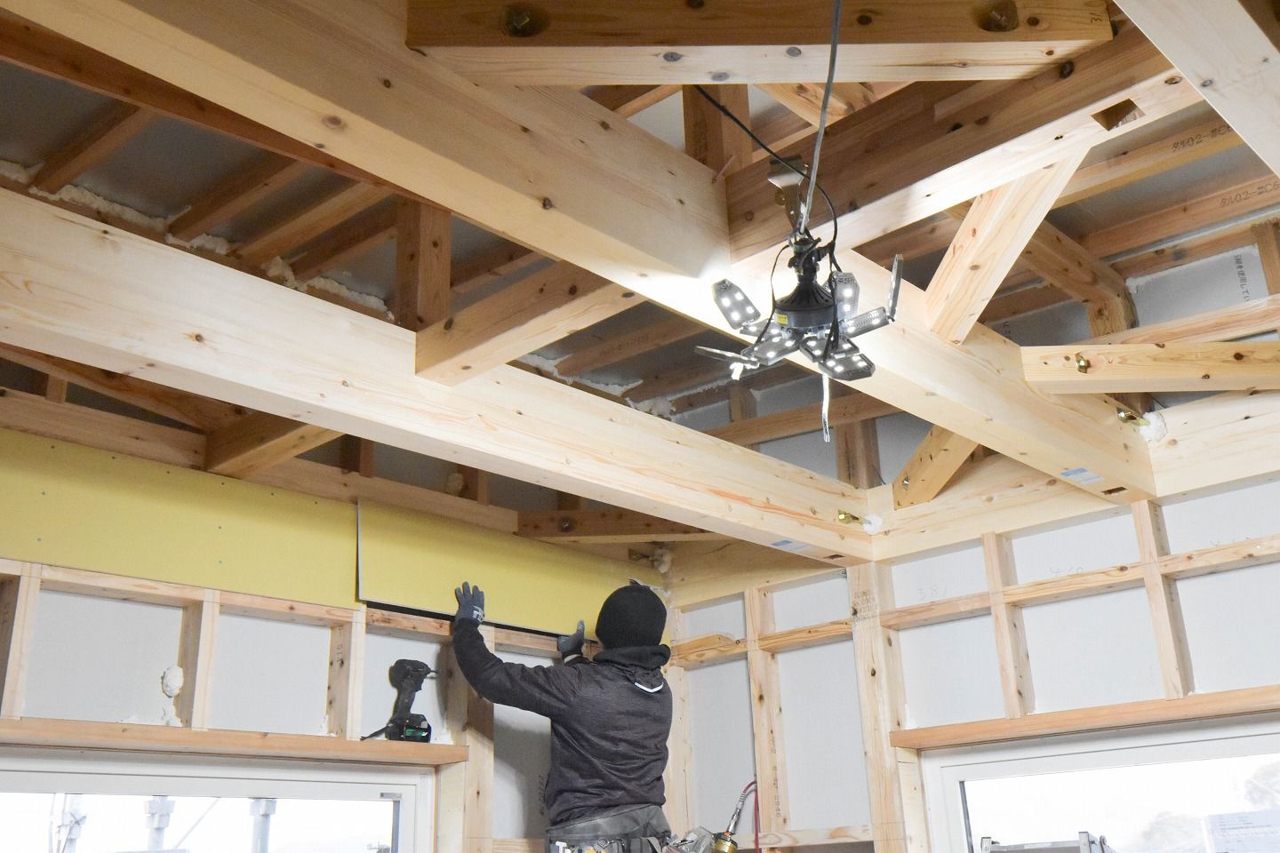 ▼棟梁の土崎大工です。本日は2階壁面の石膏ボードの作業を進めていました。サイズ通りにボードをカッティングし、リズミカルに壁に打ち付けていきます。