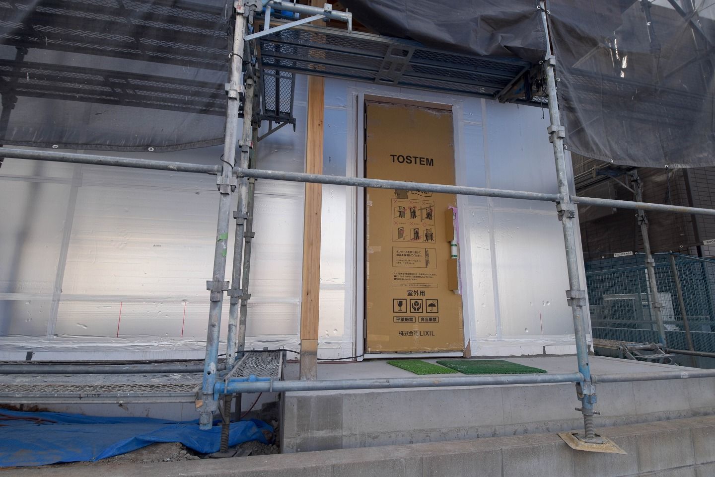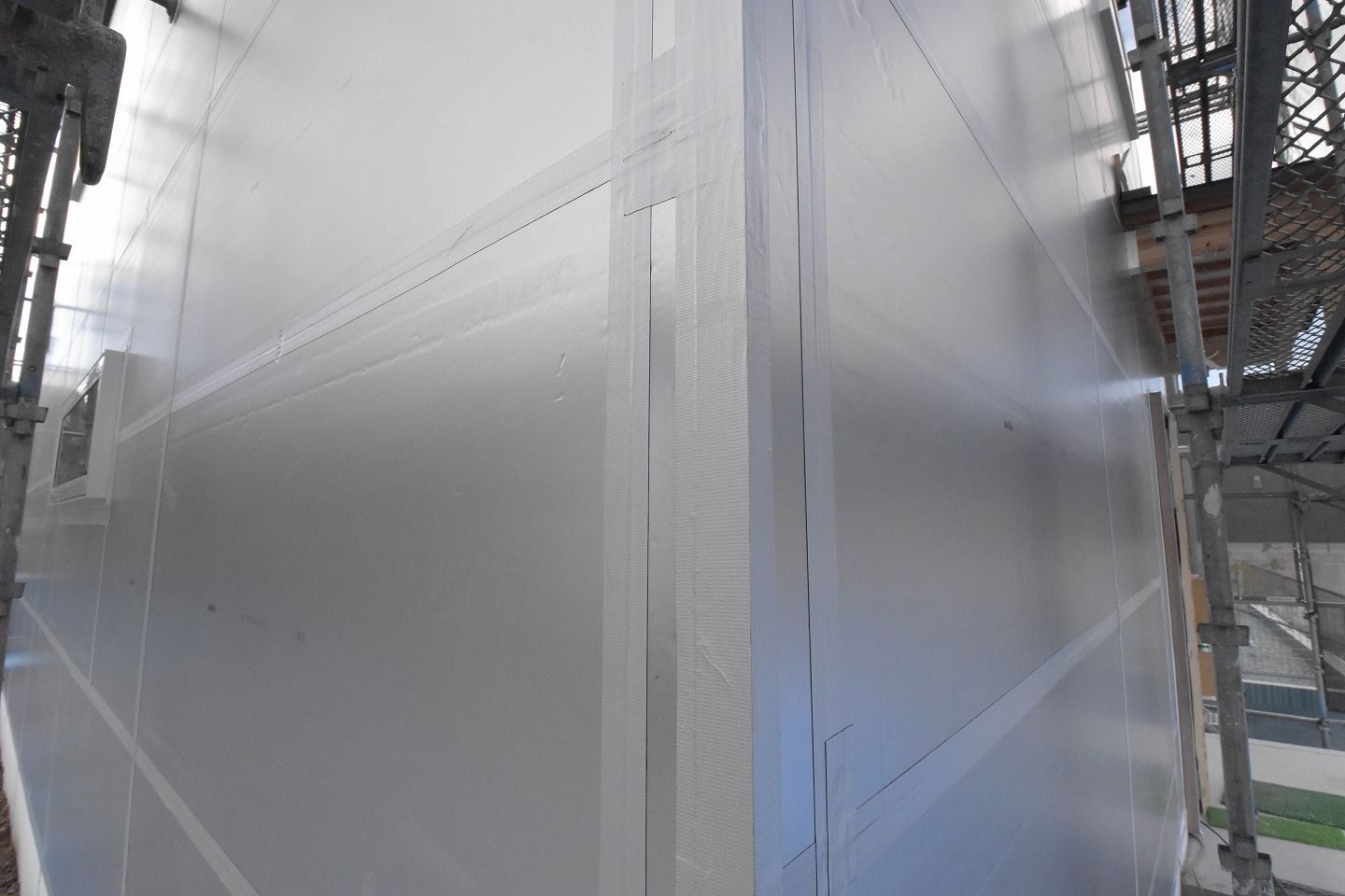 ■扉を囲むようにシルバーの壁で覆われています。「耐力面材あんしん」の上に、外断熱材のキューワンボードが取り付けられています。高い赤外線反射率によって夏季の遮熱に効果があるアルミ箔です。さらに、高性能硬質ウレタンフォームの断熱性能と併せることにより、住宅の省エネルギーに貢献してくれます!