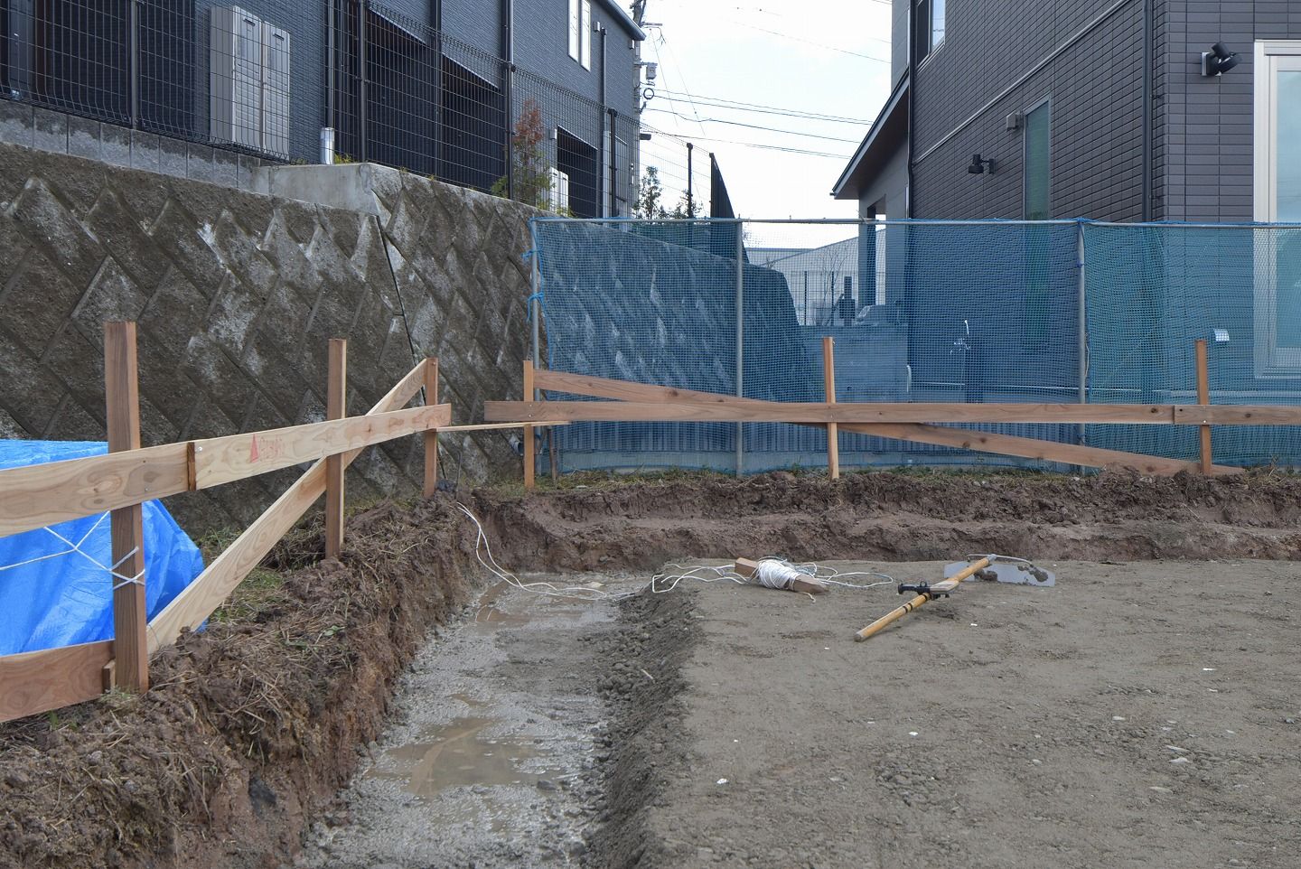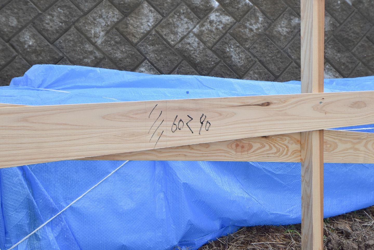 ▼ぐるりと土地を囲むように取り付けられている板は「遣り方(やりかた)」です。これは、基礎工事の一番初めに建物の位置を出していく作業です。これから進む建築の全ての「基準」となる、とても重要なものです。