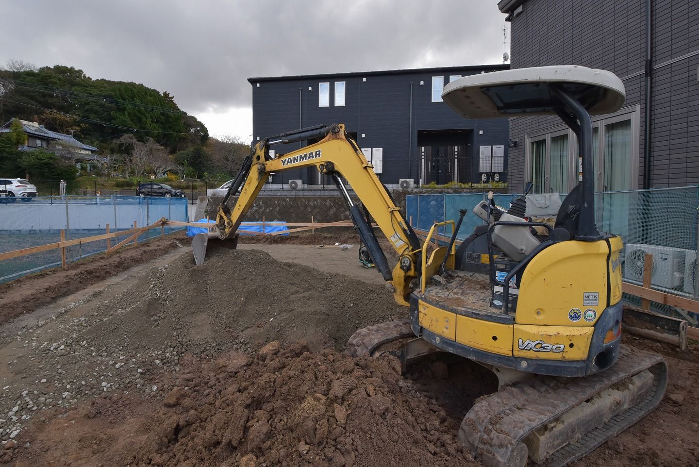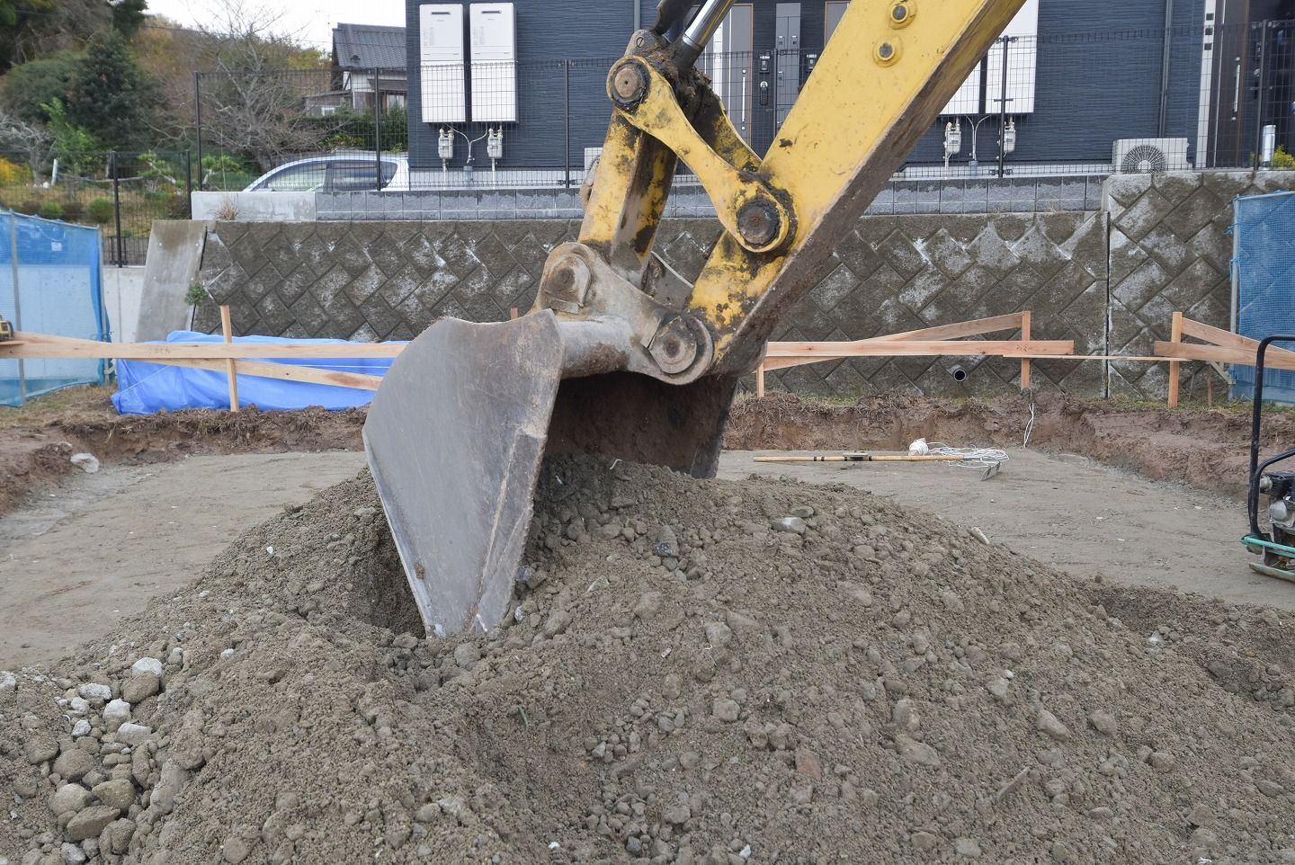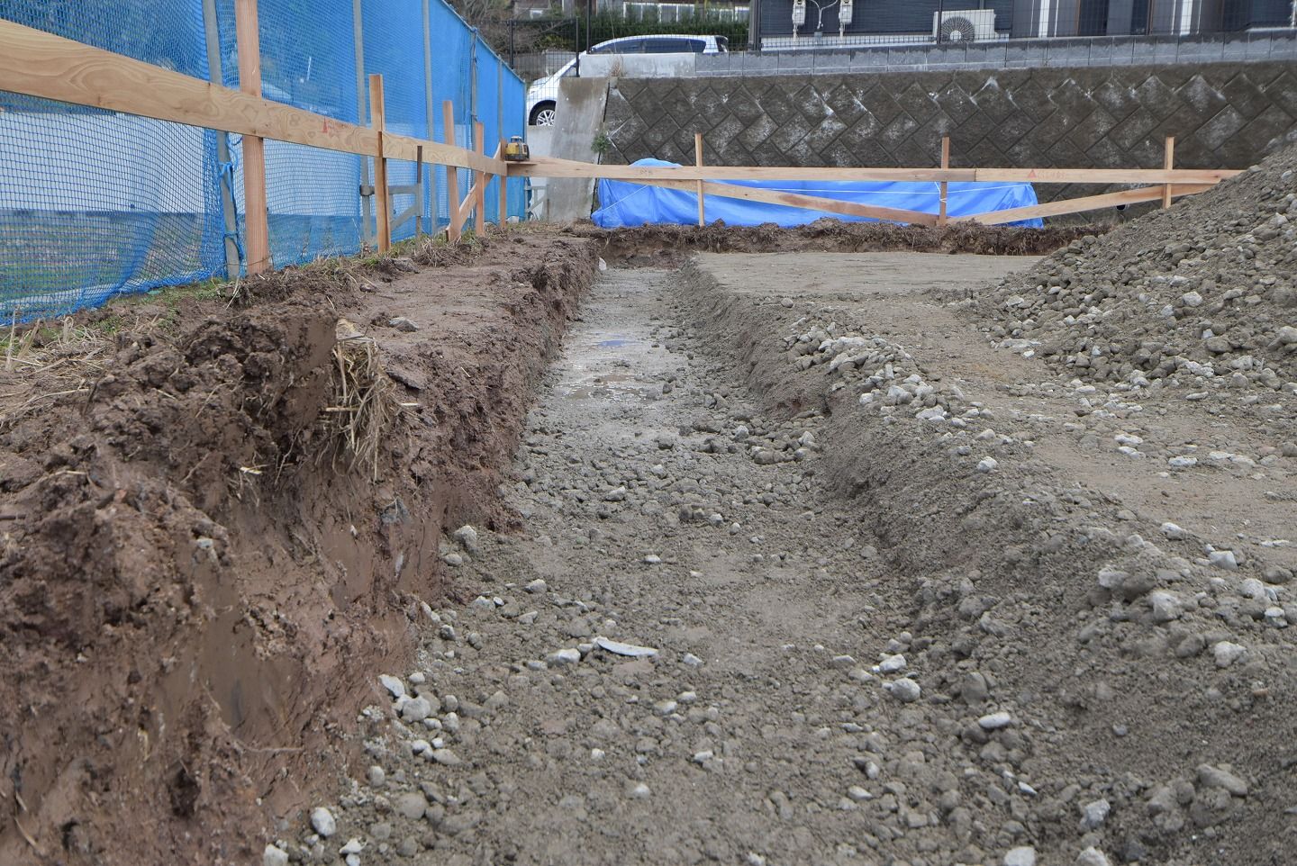 ▼本日は「根切り」と呼ばれる基礎工事が作業されていました。これは図面で決められた建物の形に合わせて、地面を掘削する作業です。深さ・幅を正確に掘っていきます。