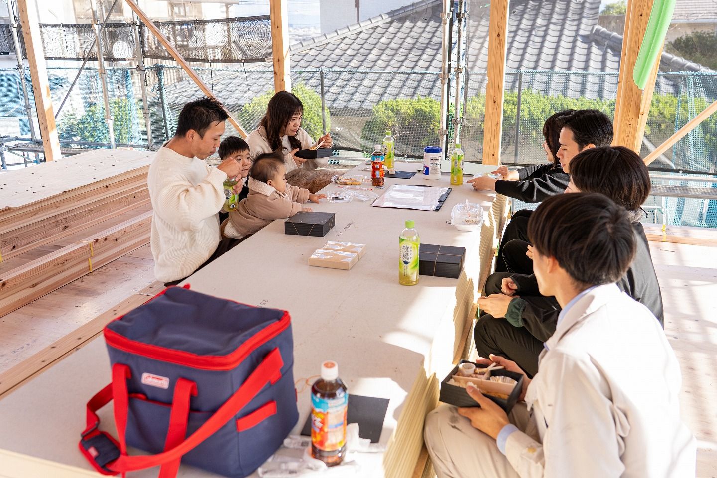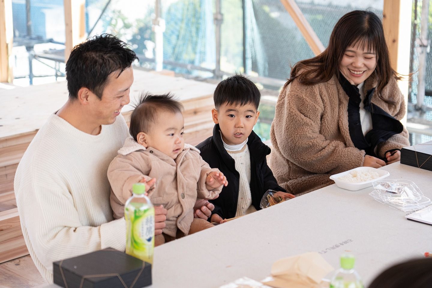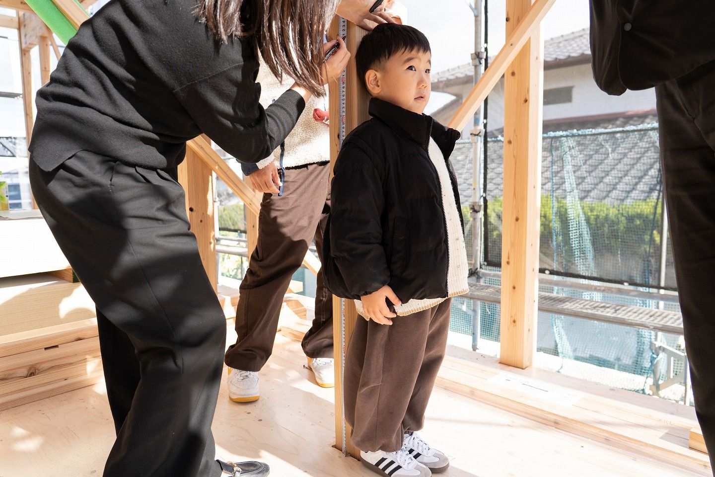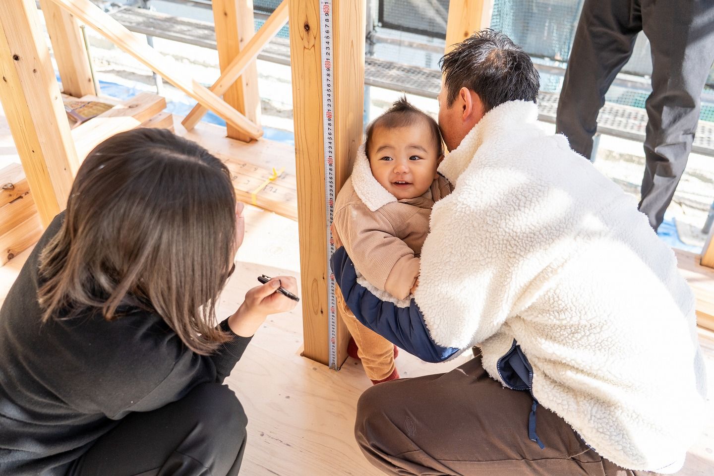 トップページ > 建築現場 > 西区10 > 「福岡市西区10」注文住宅現場リポート④【上棟式】 「福岡市西区10」注文住宅現場リポート④【上棟式】 2025.12.22掲載 こんにちは!リポート担当の有村です。12月22日(月)晴れ。本日は福岡市西区にて上棟式を執り行いました!それではさっそくリポートしていきましょう!▼お昼の様子です。施工が着々と進んでいます!▼中では昼食会が行われていました!▼図面を見ながら現場案内をさせていただきました!実際に現場を見て回ることでイメージがしやすくなりますね!▼案内後には、柱に身長を刻みました!これからお家と一緒に成長していくのが楽しみですね!▼お子様がクレーン車が好きとのことで乗せてもらいました!なかなか乗れないですよ~!▼最後に大工さんたちにお土産を頂きました!ありがとうございます!▼この度の上棟式、誠におめでとうございます!これから本格的に始まる家づくり、ぜひ楽しまれてください! もっと福岡工務店を知りたい方 関連記事を見る 2025.12.15 「福岡市西区10」注文住宅現場リポート③【基礎工事】【立ち上がりコン】 2025.11.10 「福岡市西区10」注文住宅現場リポート②【基礎工事】【根切り】 2025.10.31 「福岡市西区10」注文住宅現場リポート①【地鎮祭】