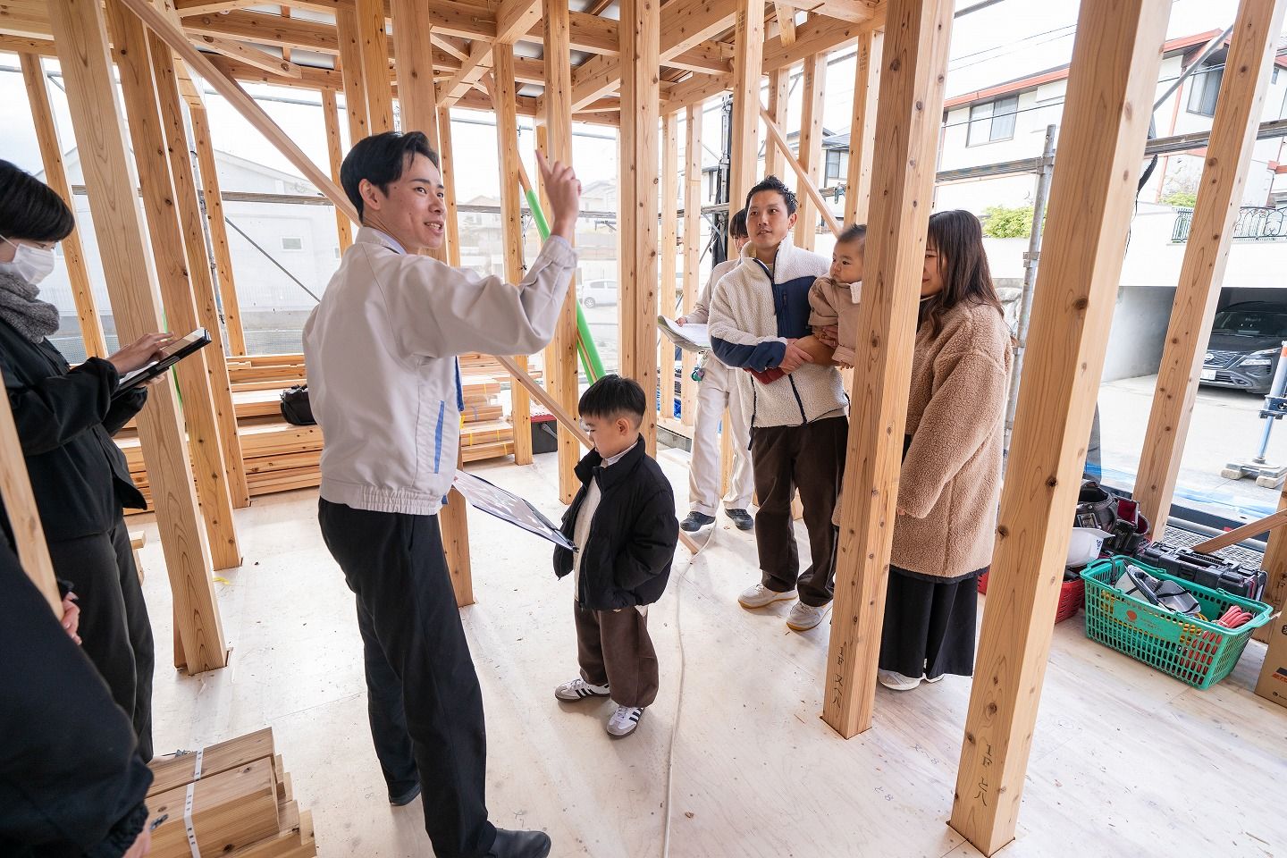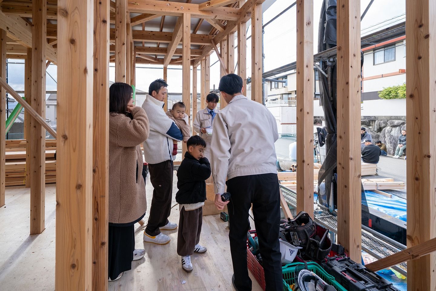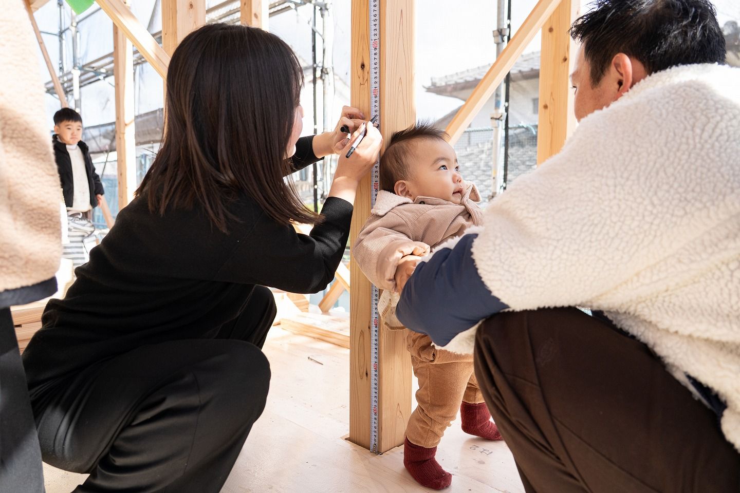 トップページ > 建築現場 > 西区10 > 「福岡市西区10」注文住宅現場リポート④【上棟式】 「福岡市西区10」注文住宅現場リポート④【上棟式】 2025.12.22掲載 こんにちは!リポート担当の有村です。12月22日(月)晴れ。本日は福岡市西区にて上棟式を執り行いました!それではさっそくリポートしていきましょう!▼お昼の様子です。施工が着々と進んでいます!▼中では昼食会が行われていました!▼図面を見ながら現場案内をさせていただきました!実際に現場を見て回ることでイメージがしやすくなりますね!▼案内後には、柱に身長を刻みました!これからお家と一緒に成長していくのが楽しみですね!▼お子様がクレーン車が好きとのことで乗せてもらいました!なかなか乗れないですよ~!▼最後に大工さんたちにお土産を頂きました!ありがとうございます!▼この度の上棟式、誠におめでとうございます!これから本格的に始まる家づくり、ぜひ楽しまれてください! もっと福岡工務店を知りたい方 関連記事を見る 2025.12.15 「福岡市西区10」注文住宅現場リポート③【基礎工事】【立ち上がりコン】 2025.11.10 「福岡市西区10」注文住宅現場リポート②【基礎工事】【根切り】 2025.10.31 「福岡市西区10」注文住宅現場リポート①【地鎮祭】