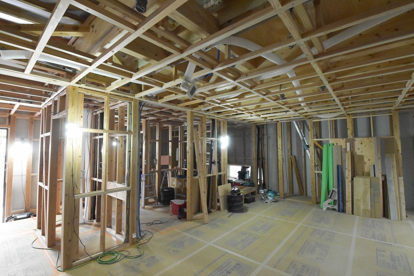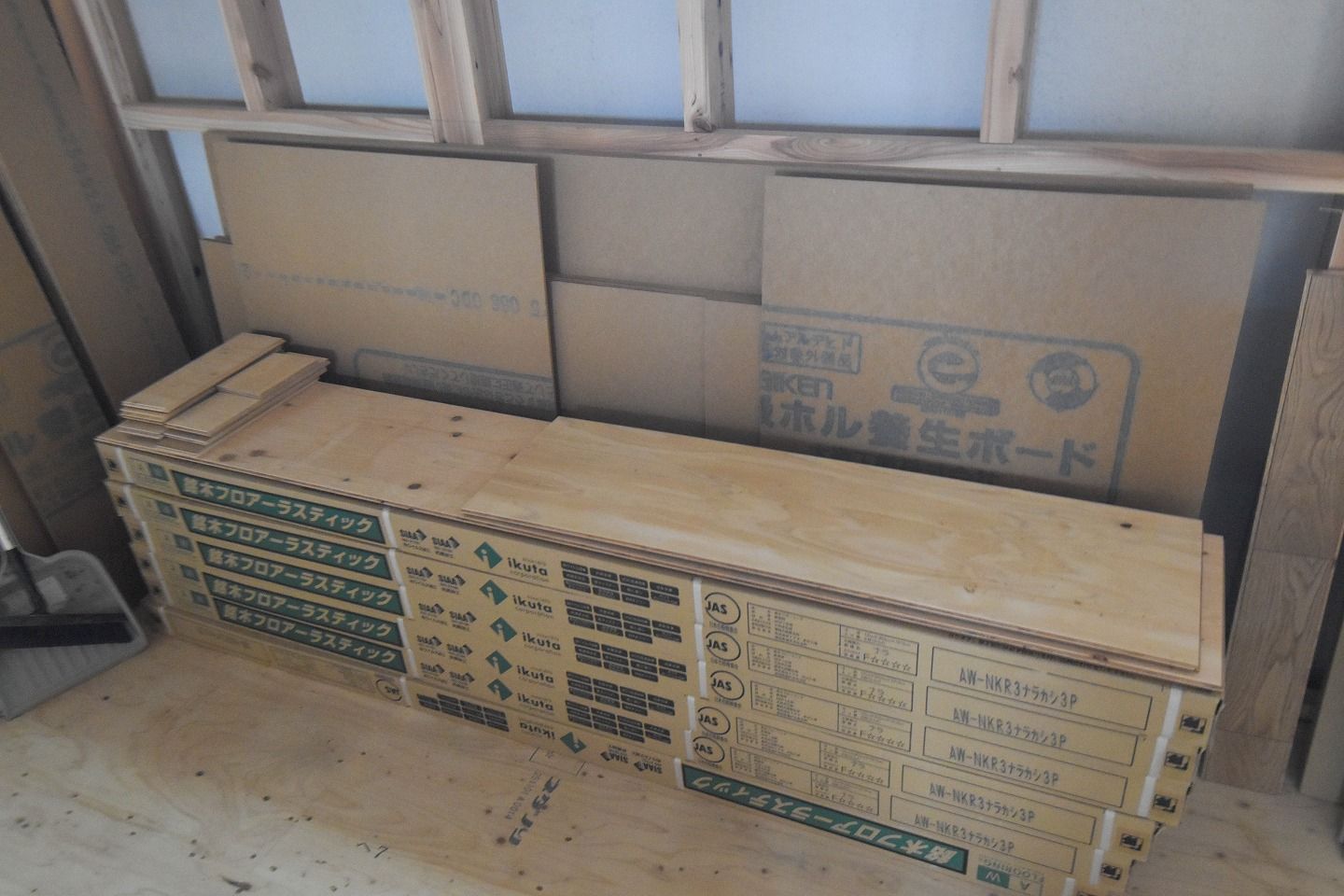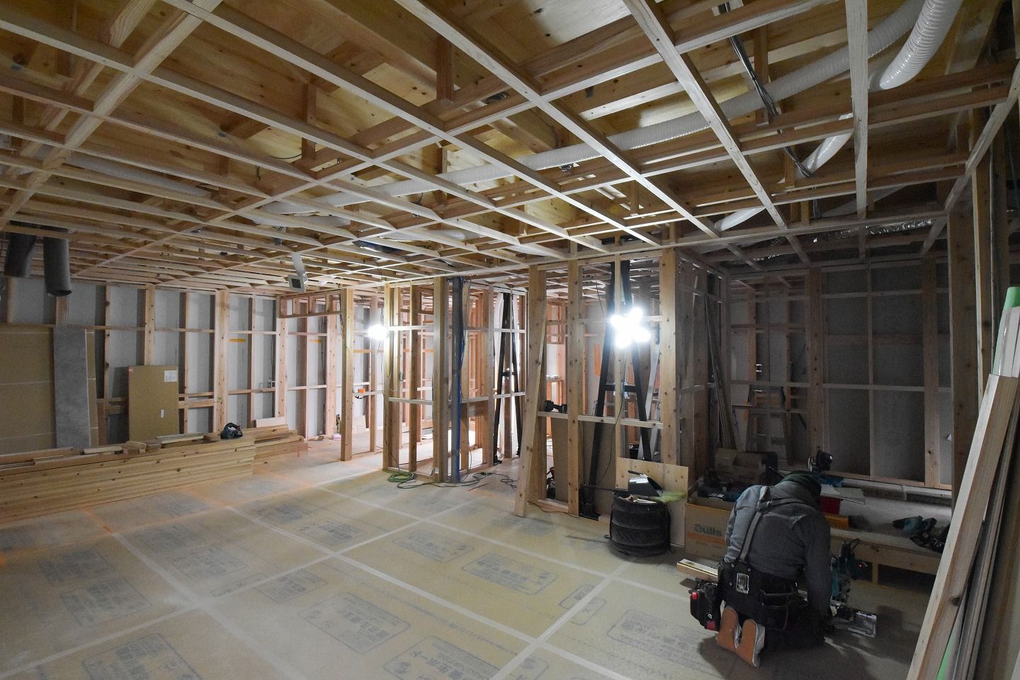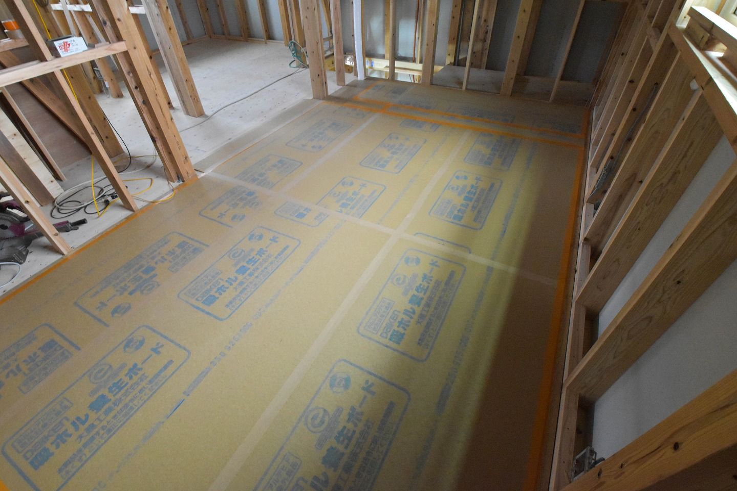 - ▼一部床材が施工されていました。傷が付かないように養生ボードでガードしています。