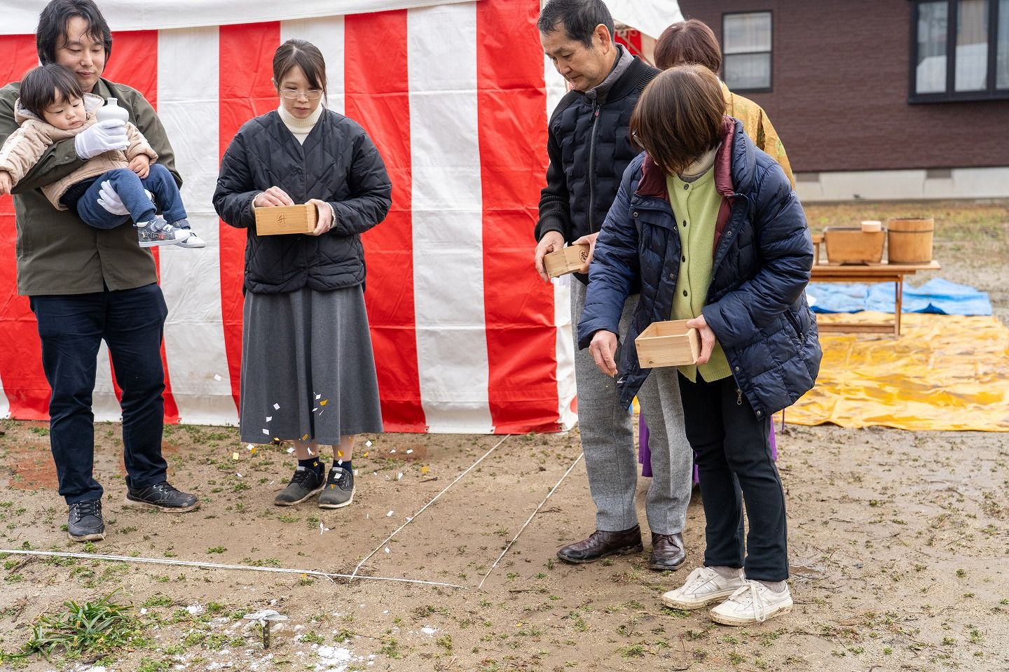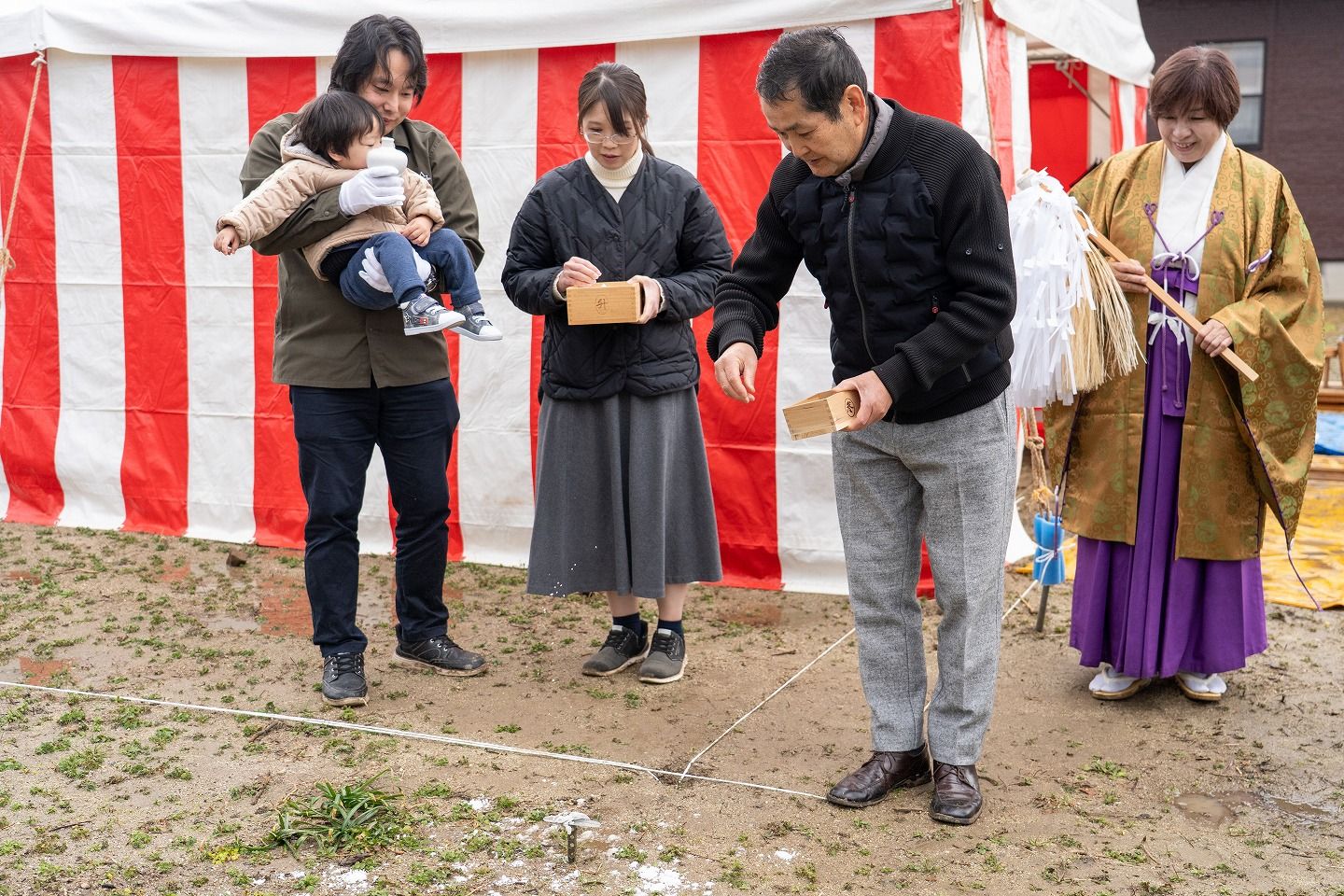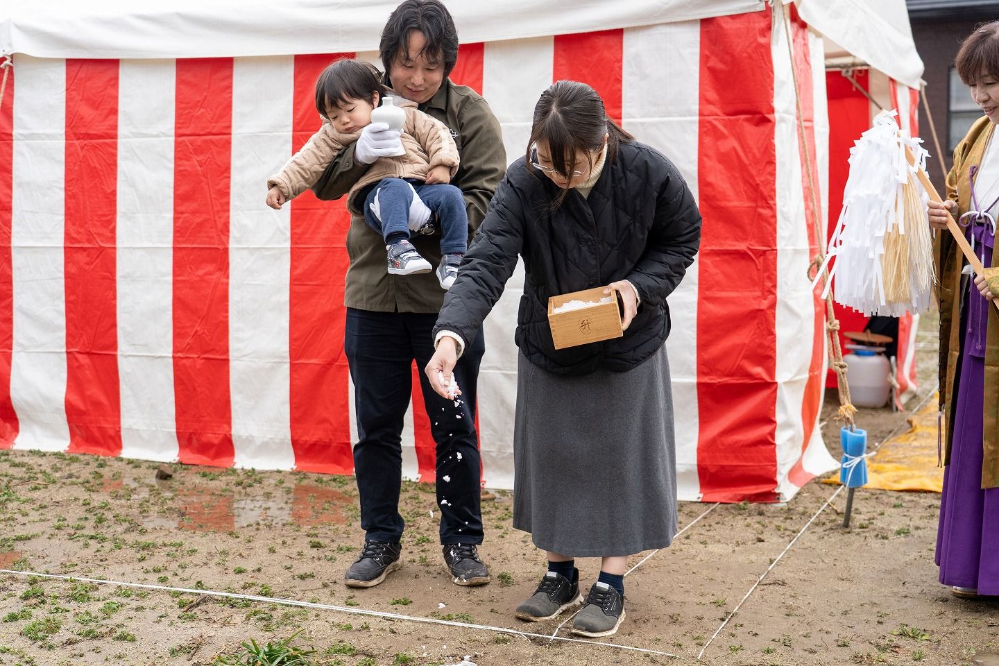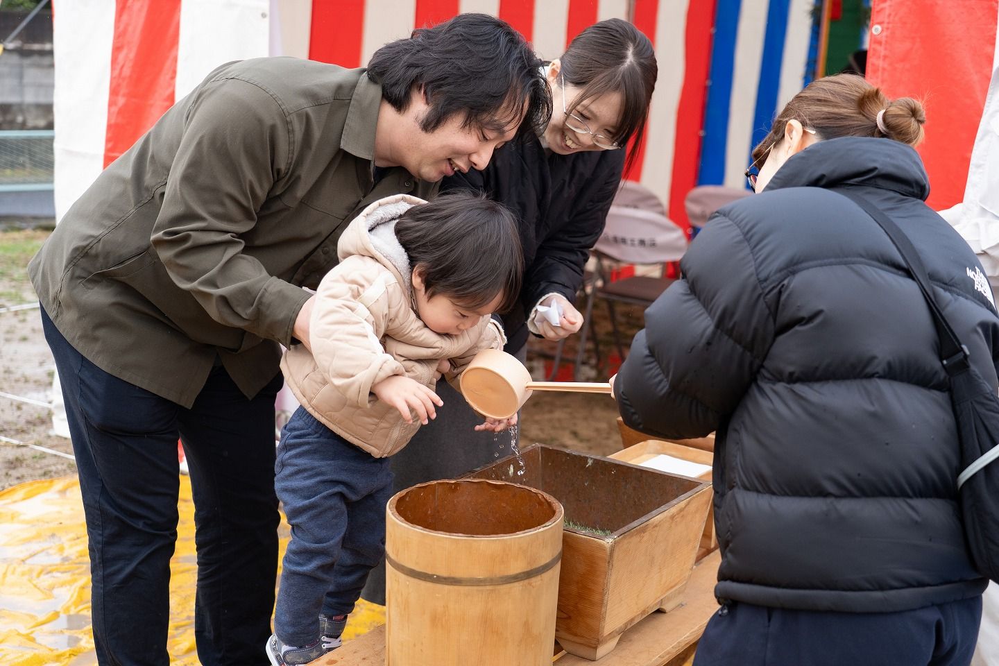 ▼お施主様ご一家がご到着されました。まずは水でお清めを行っていただきます。