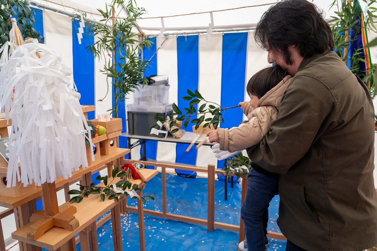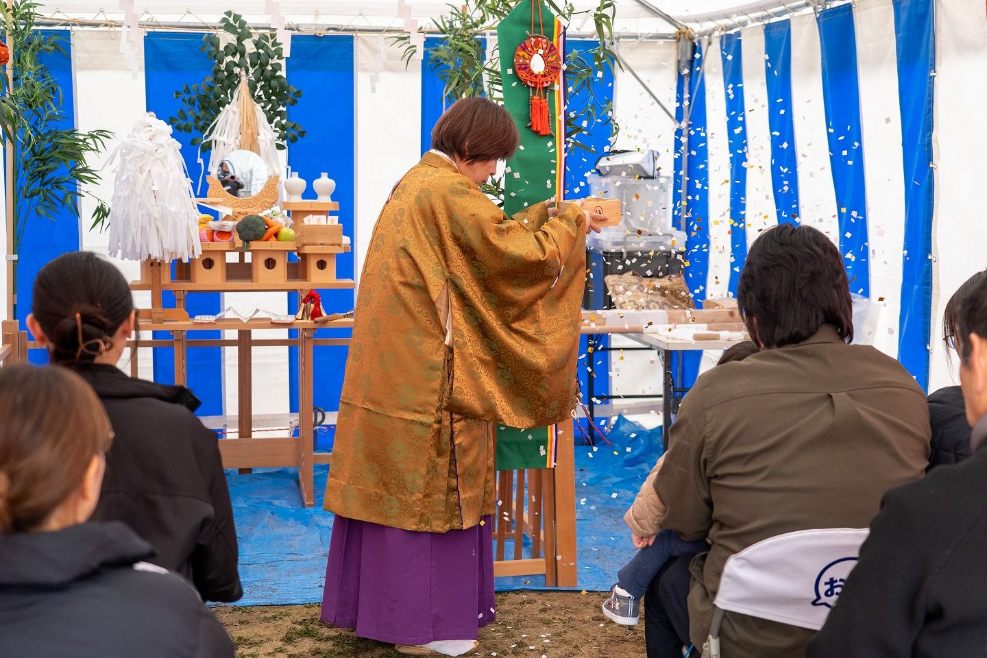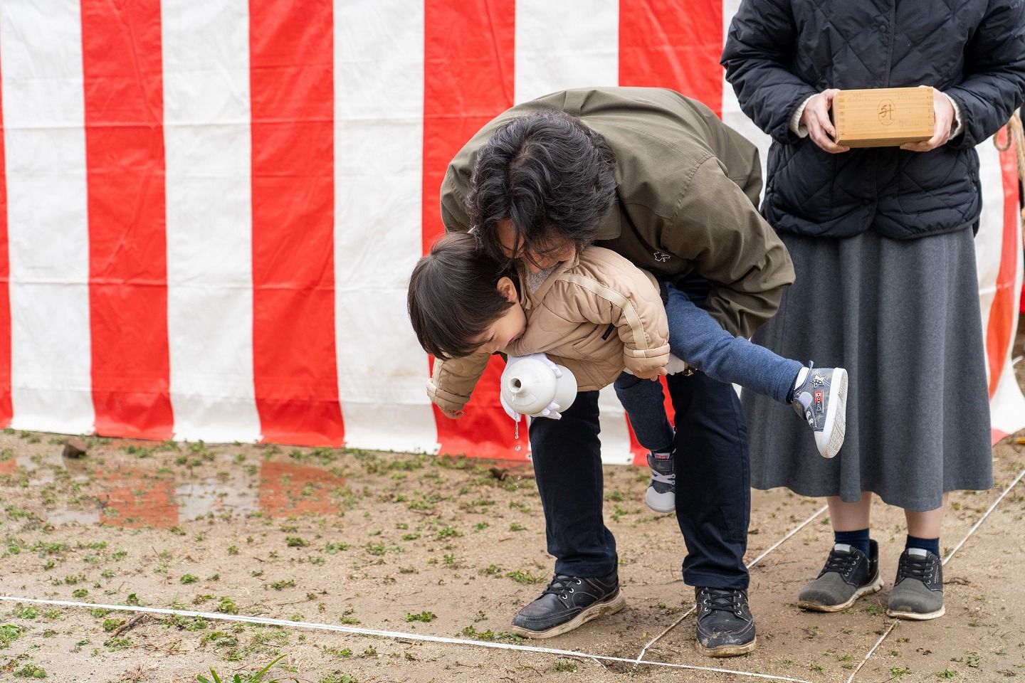 ▼お施主様ご一家がご到着されました。まずは水でお清めを行っていただきます。