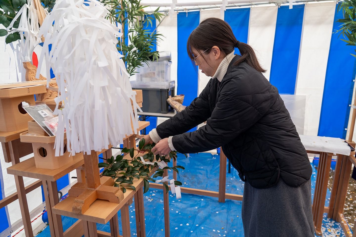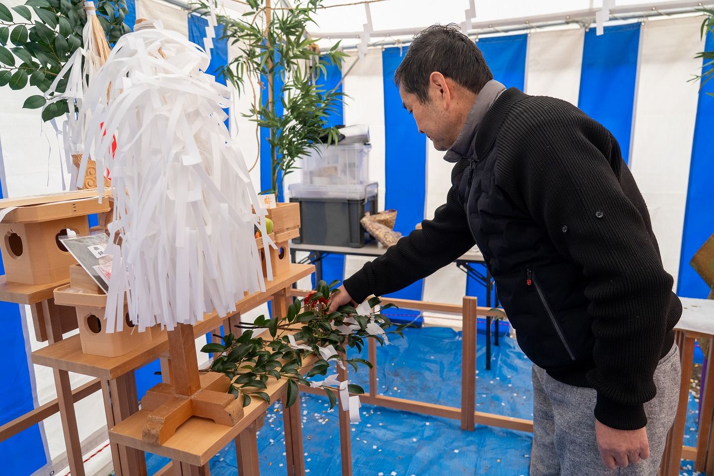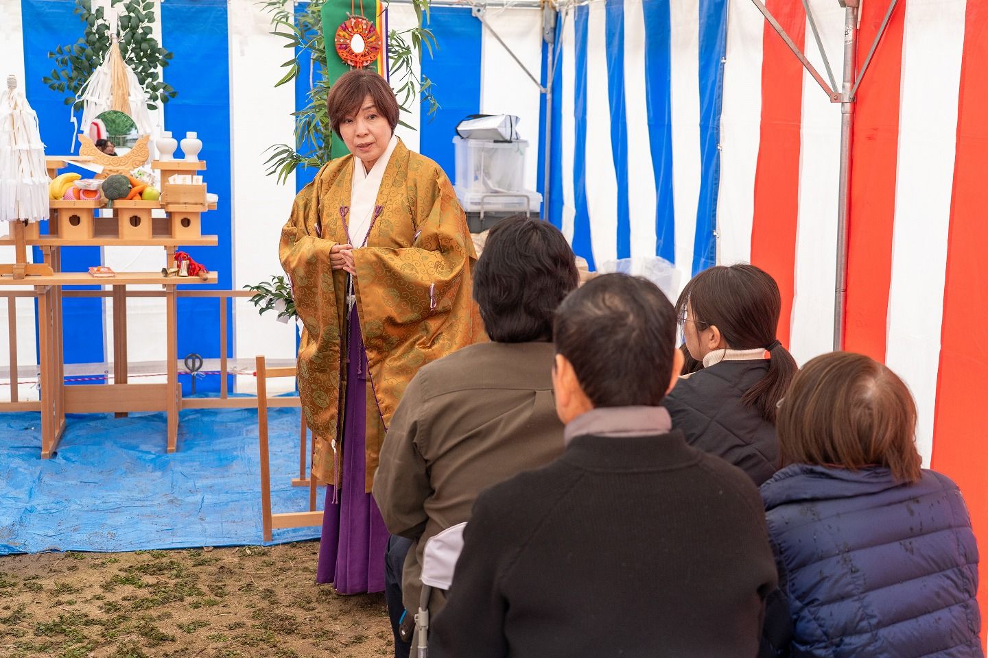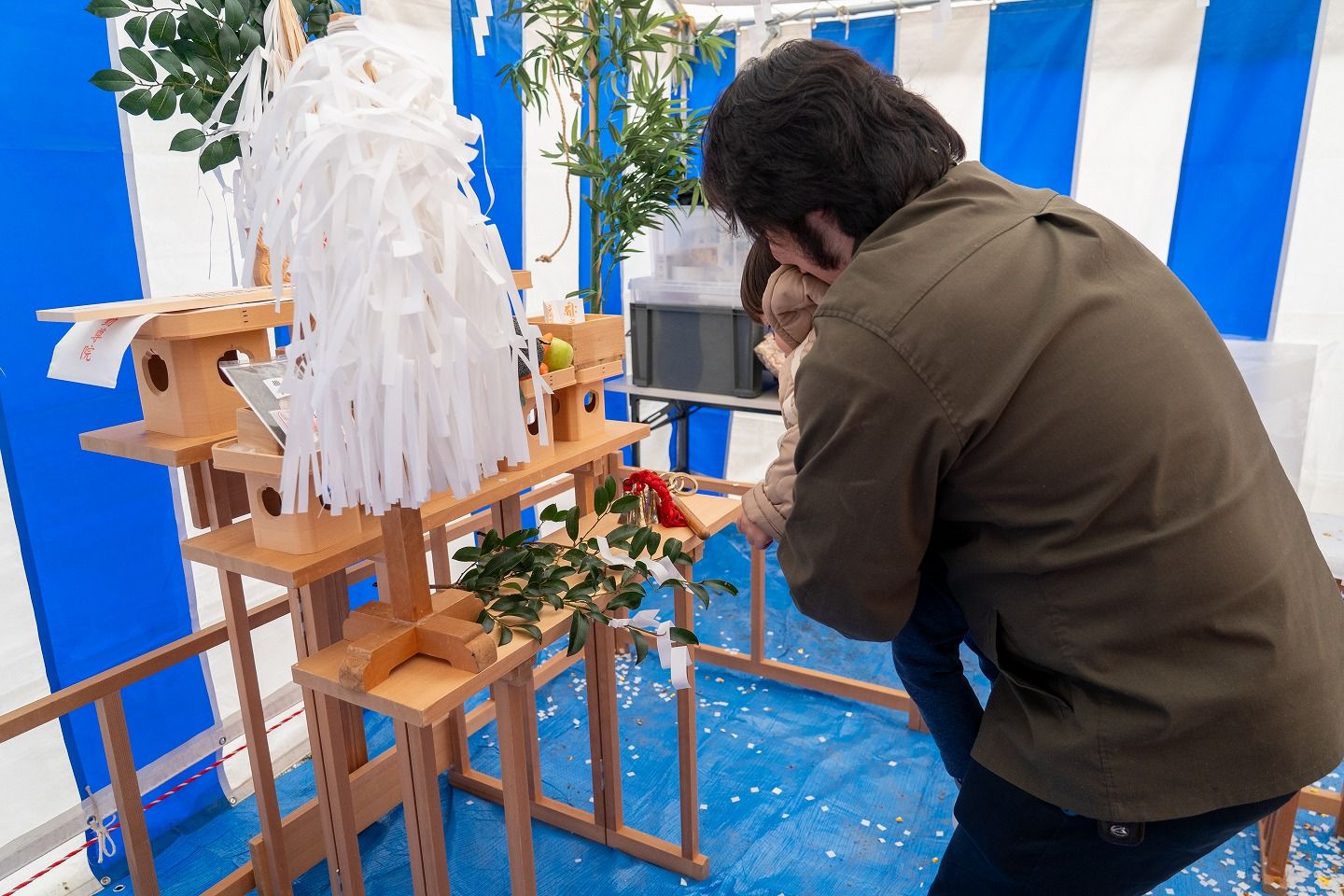 ▼お施主様ご一家がご到着されました。まずは水でお清めを行っていただきます。